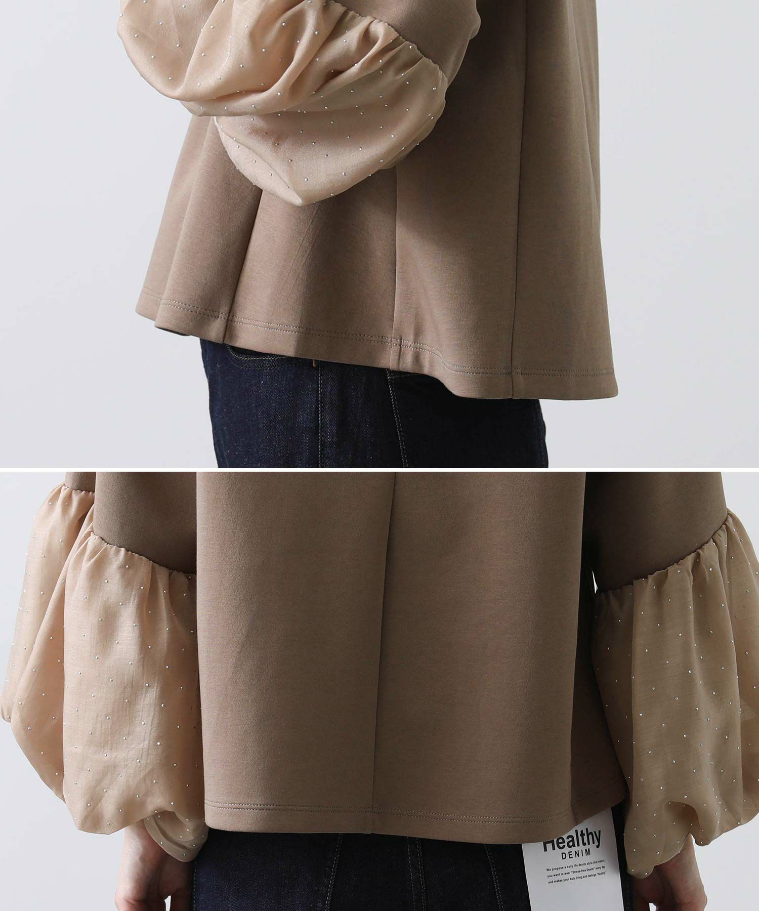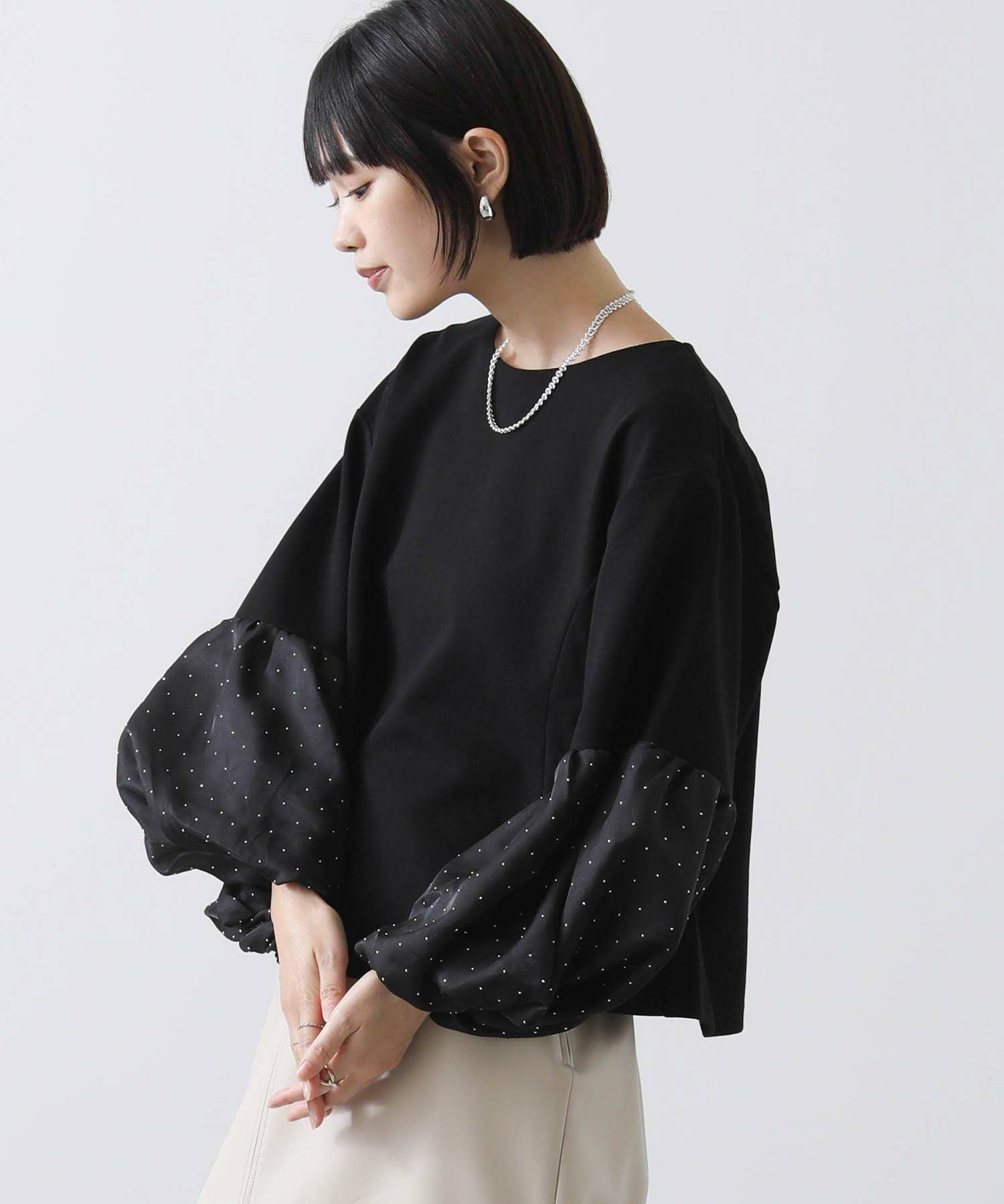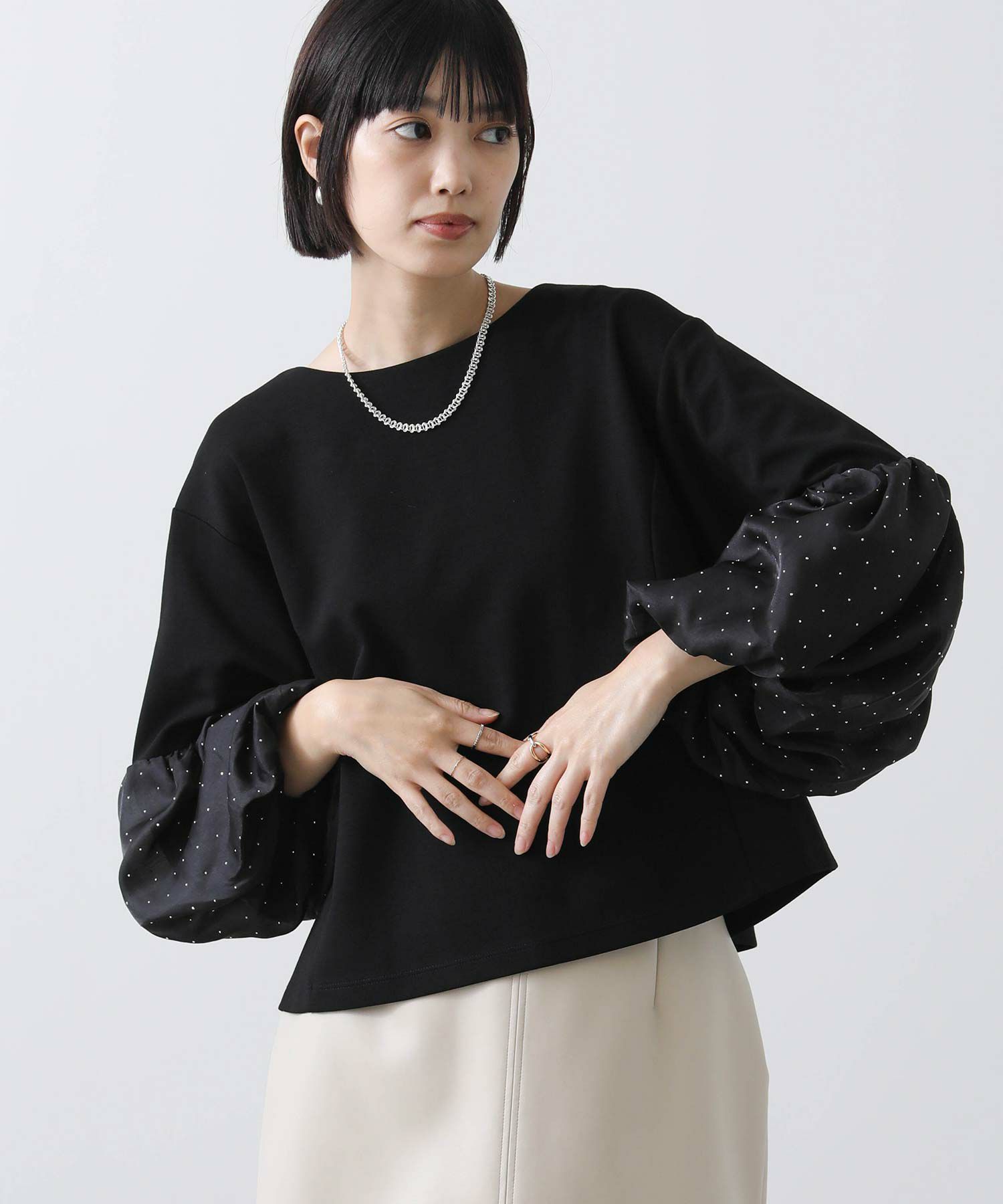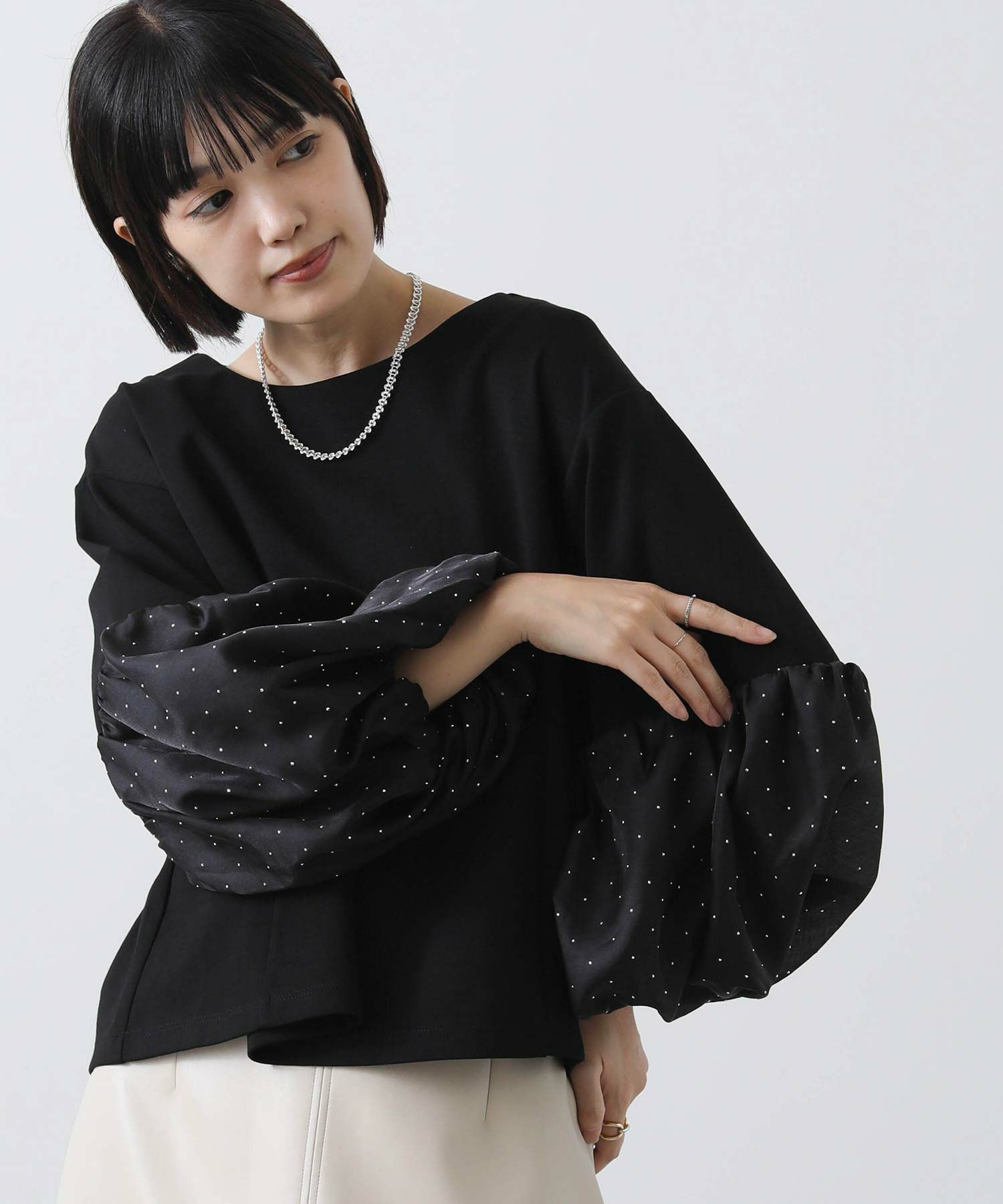 異素材のパフスリーブに、ランダムにつけられたラインストーンがキラキラと光り、コーディネートのポイントに。