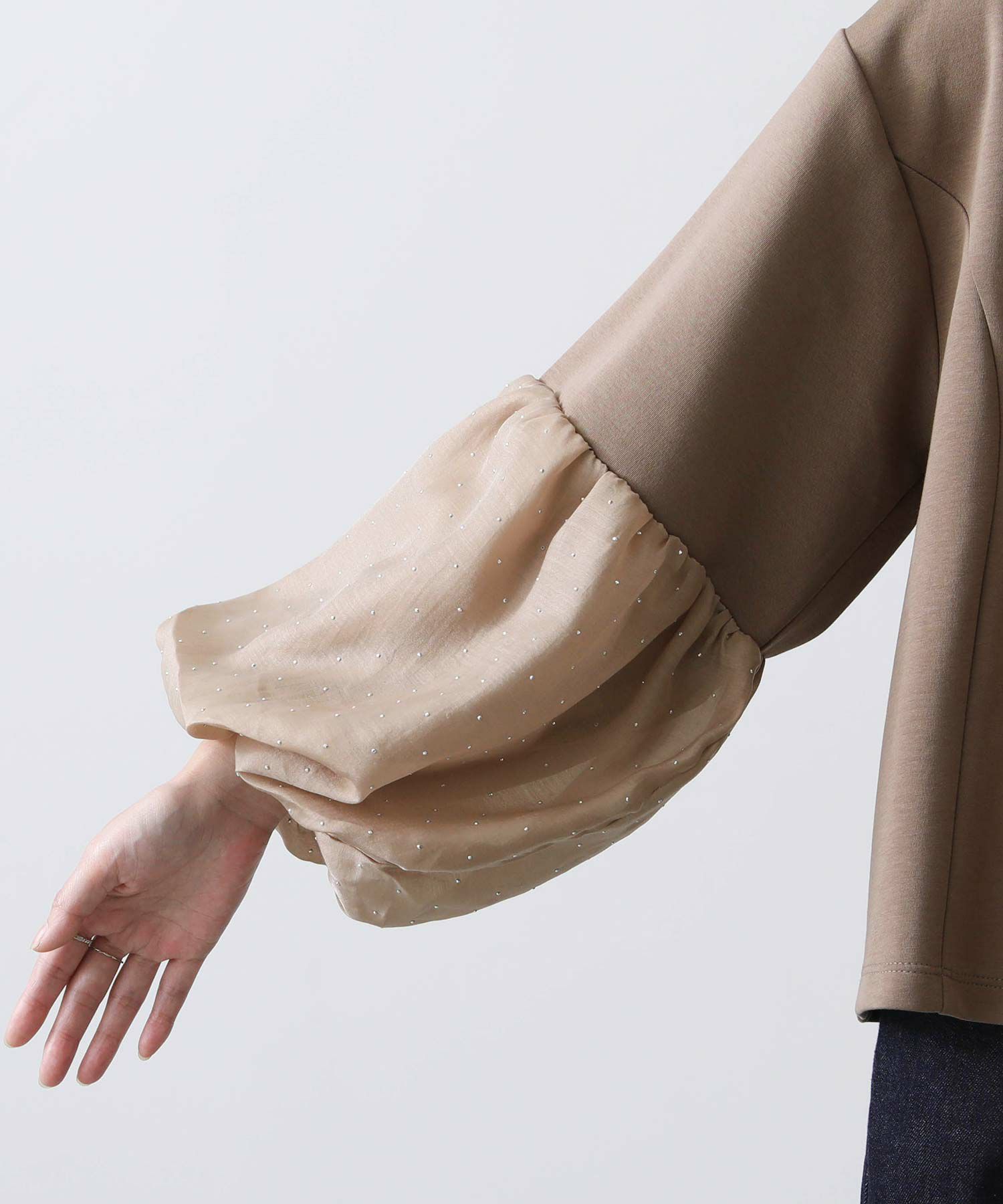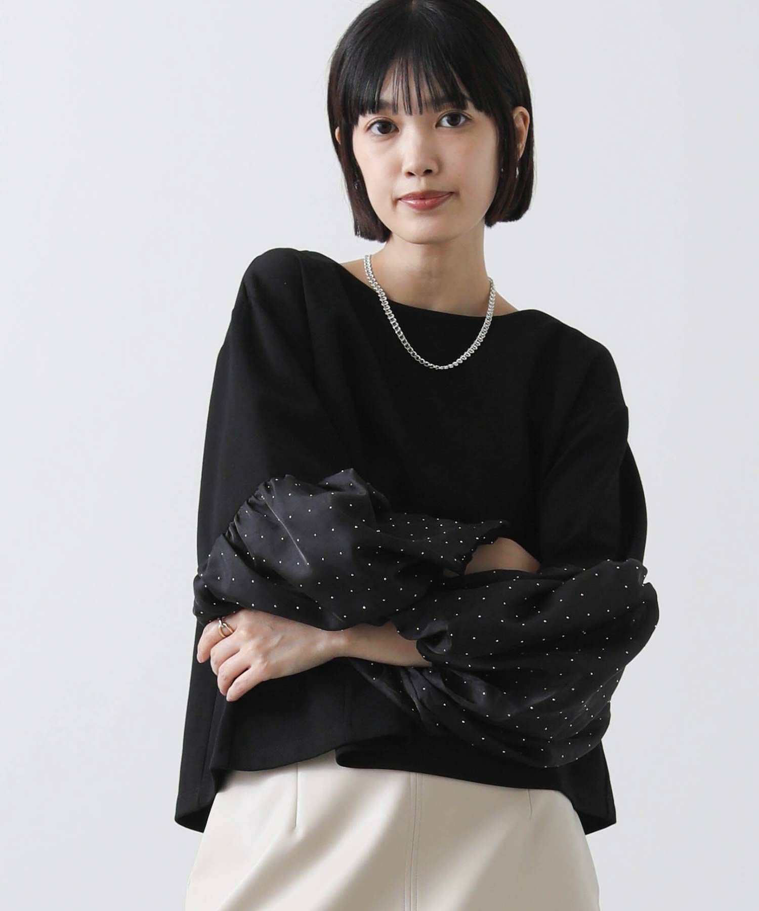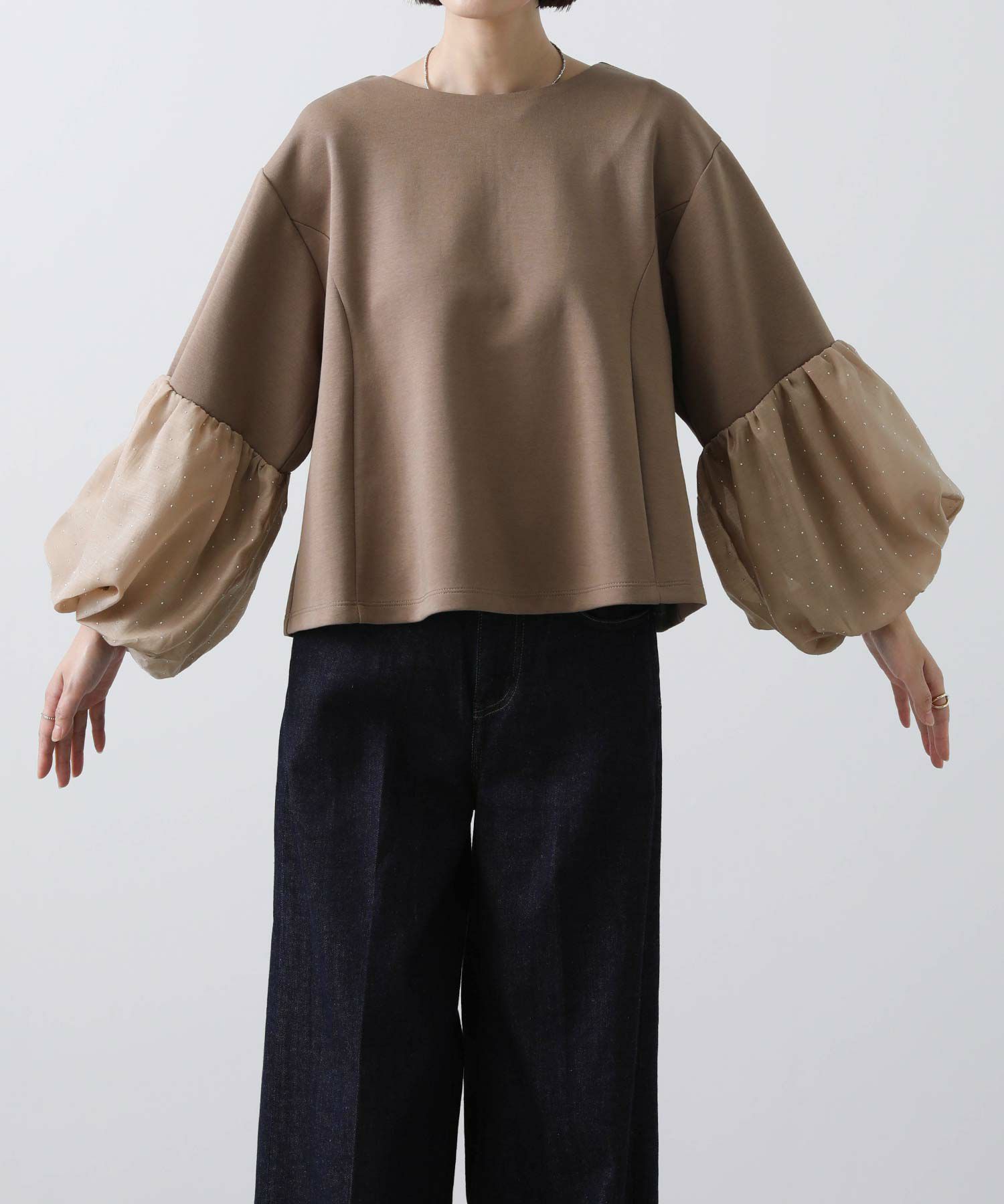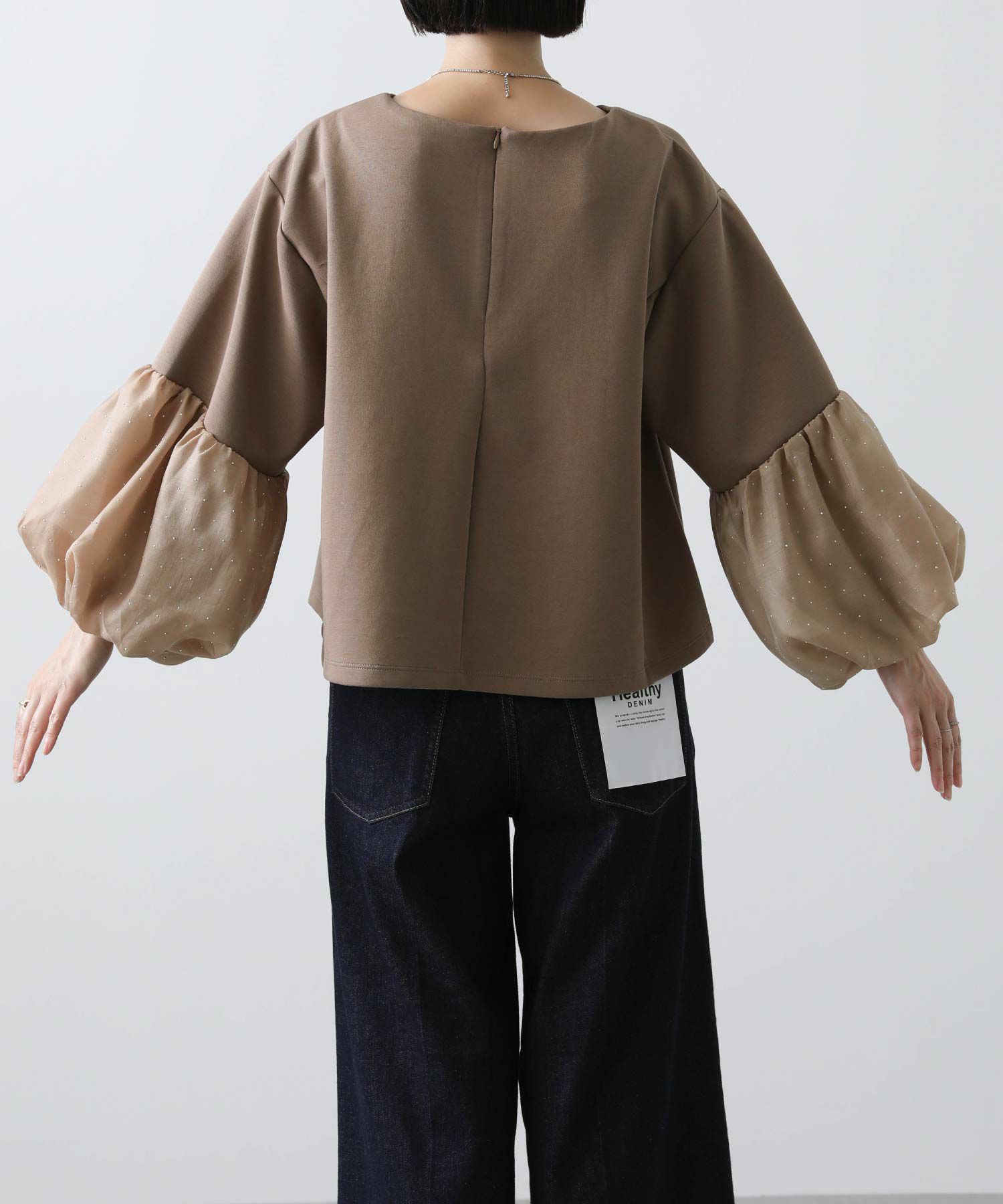 異素材のパフスリーブに、ランダムにつけられたラインストーンがキラキラと光り、コーディネートのポイントに。