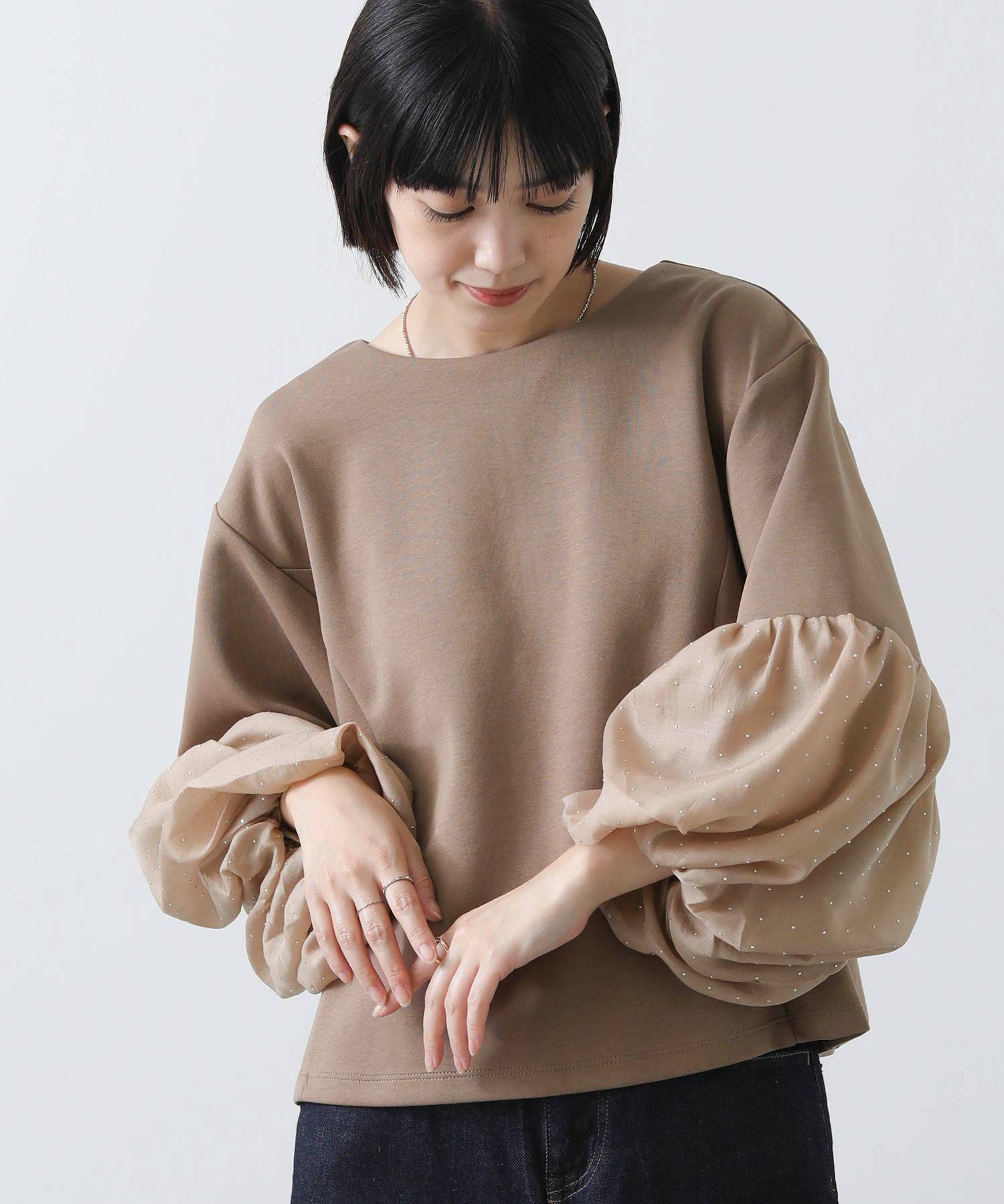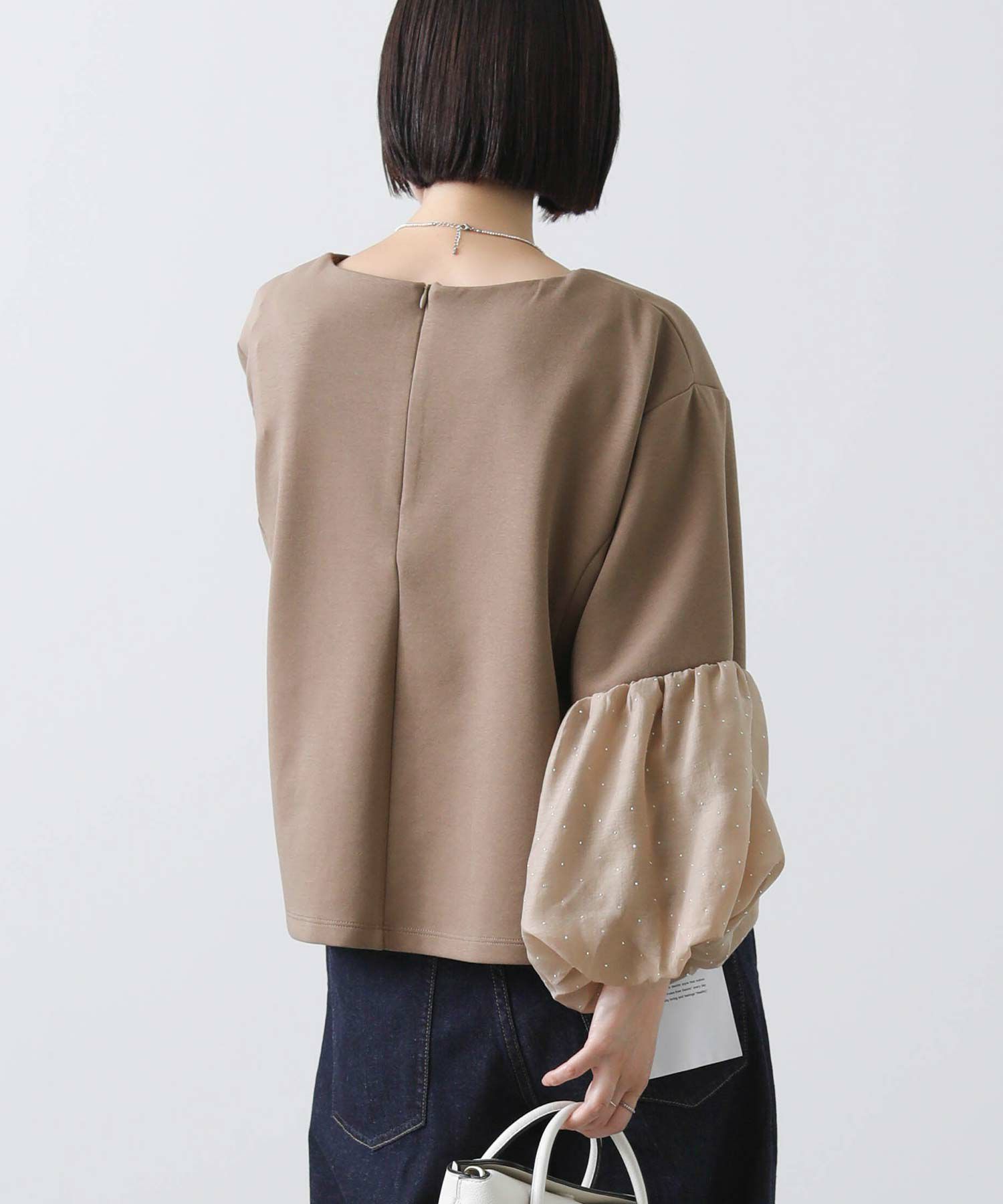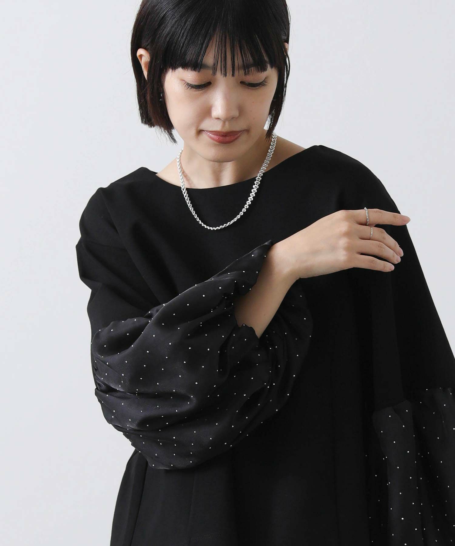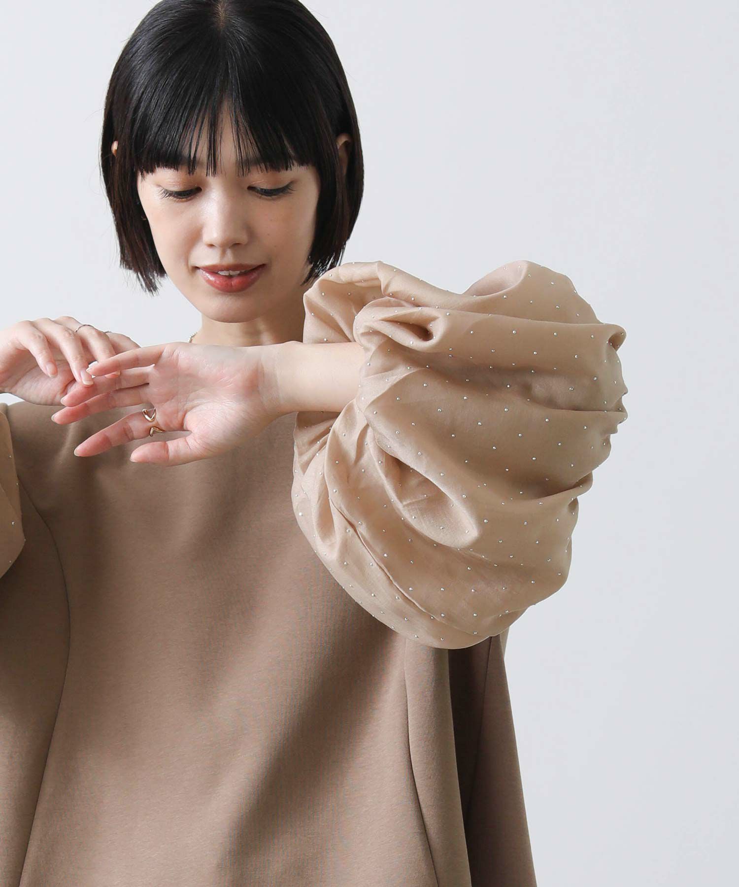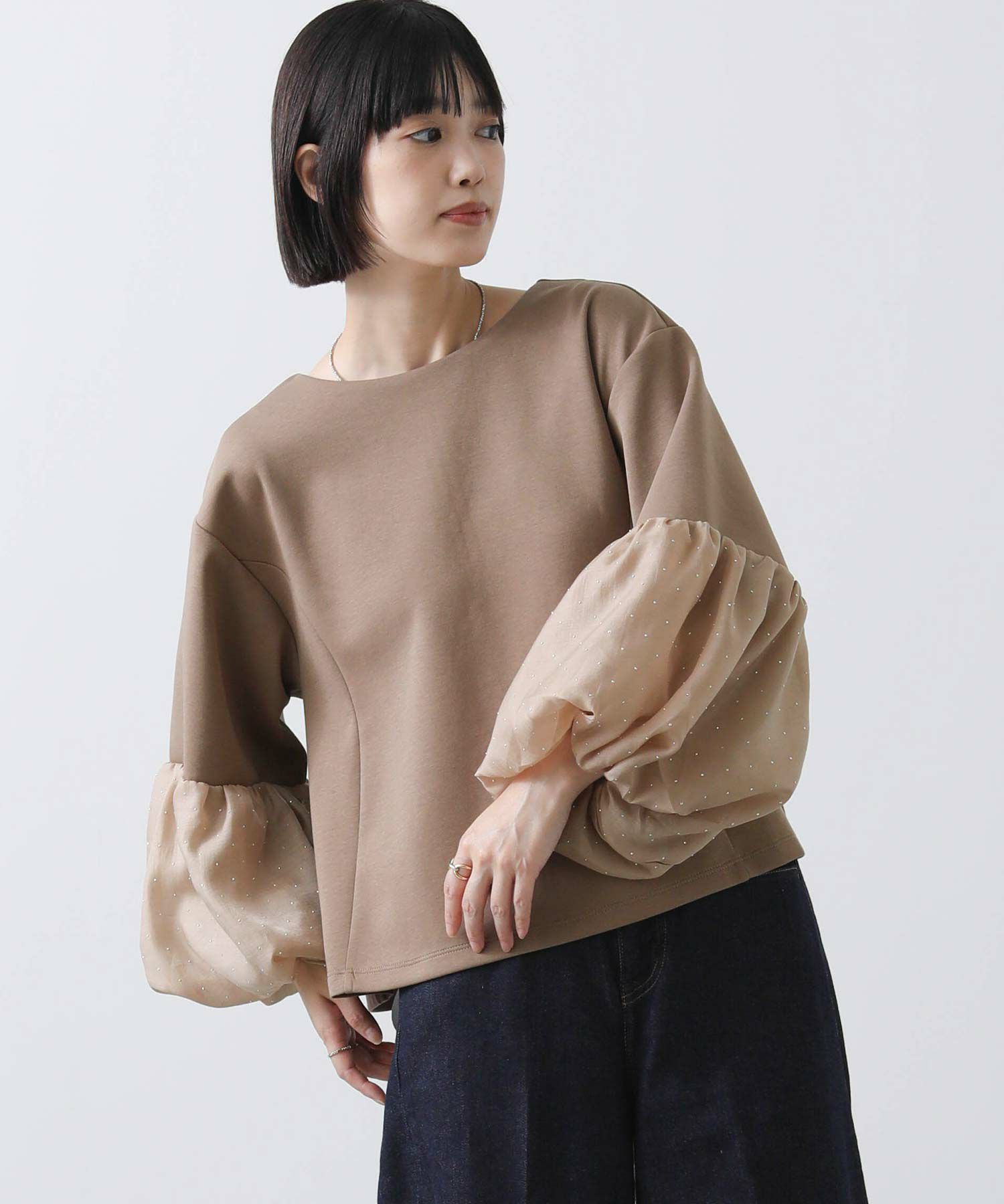 異素材のパフスリーブに、ランダムにつけられたラインストーンがキラキラと光り、コーディネートのポイントに。