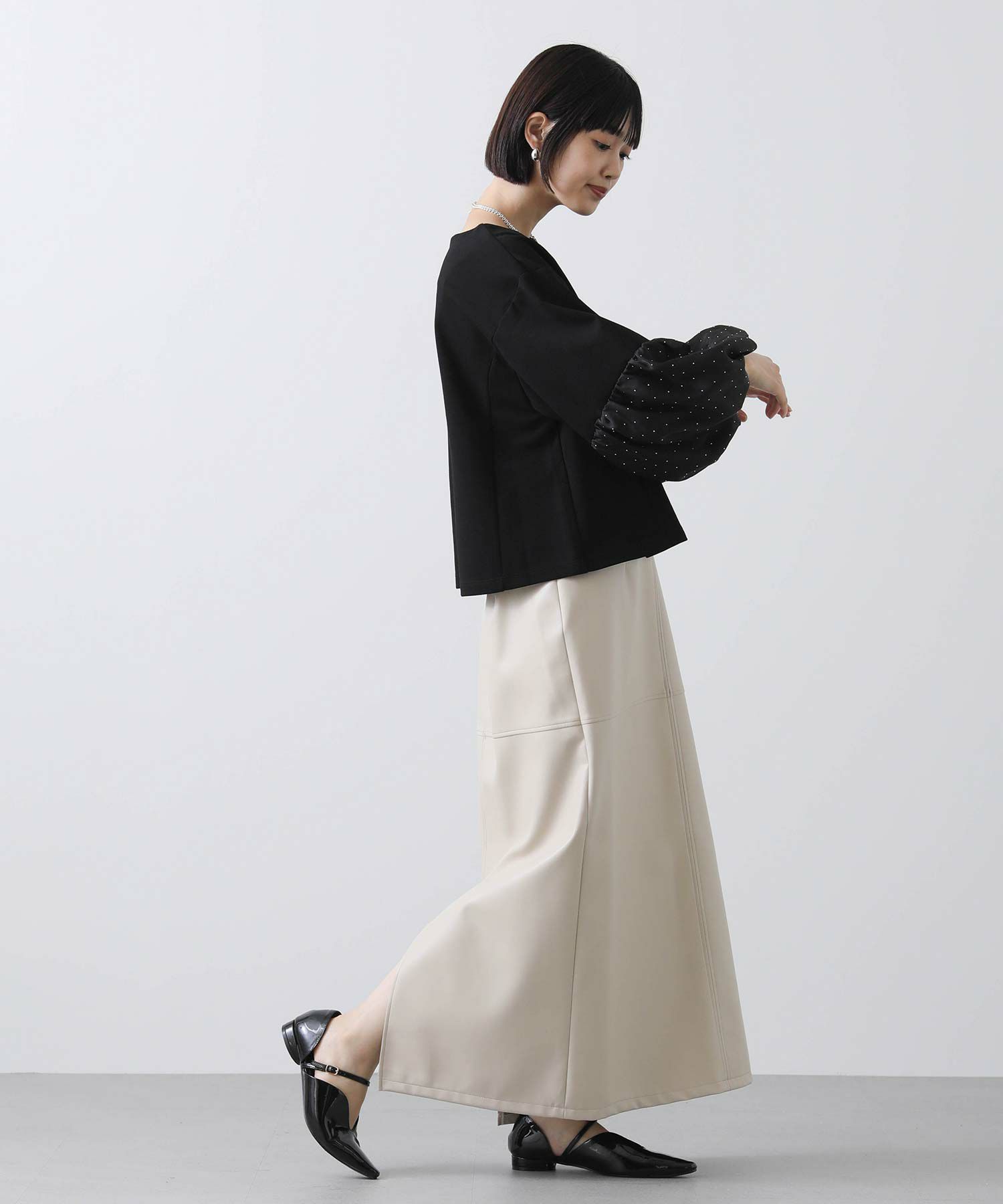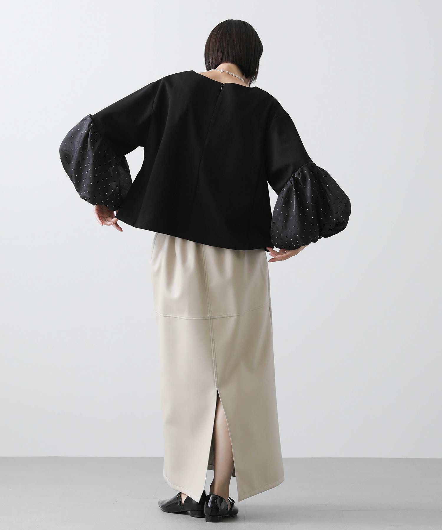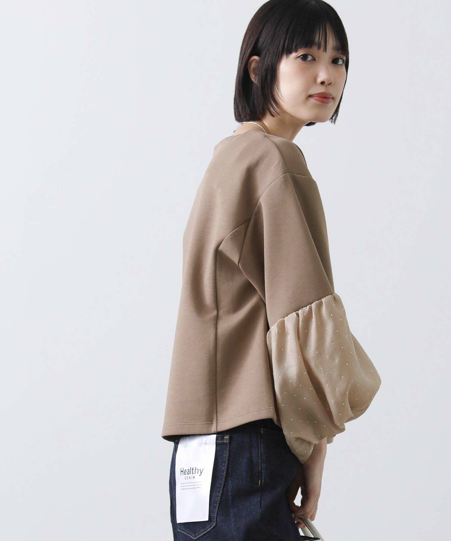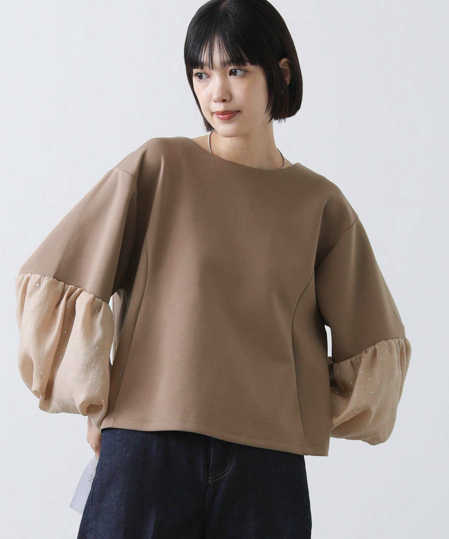 異素材のパフスリーブに、ランダムにつけられたラインストーンがキラキラと光り、コーディネートのポイントに。