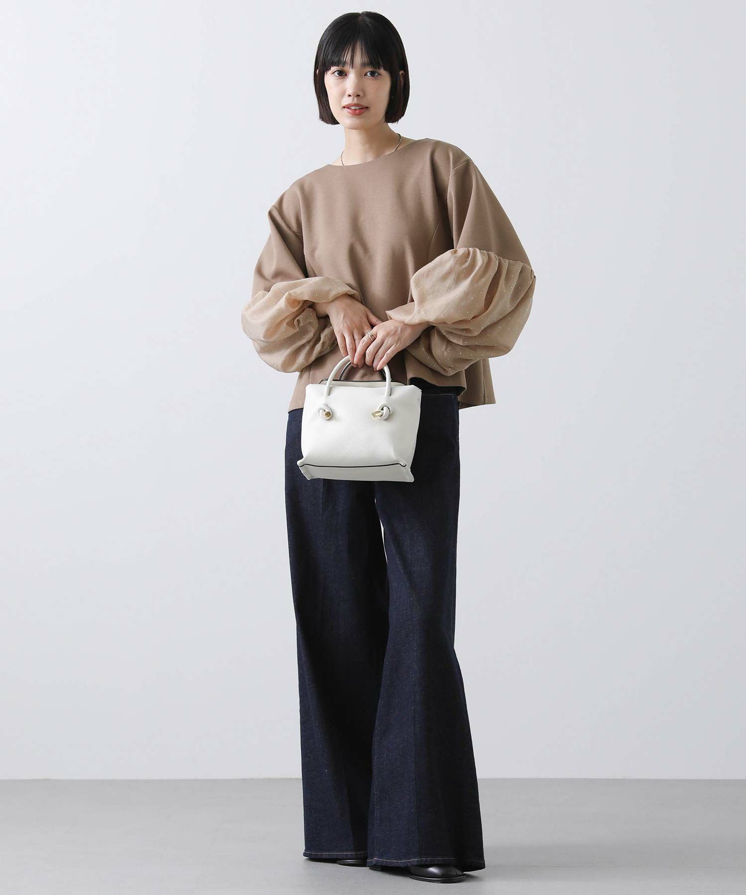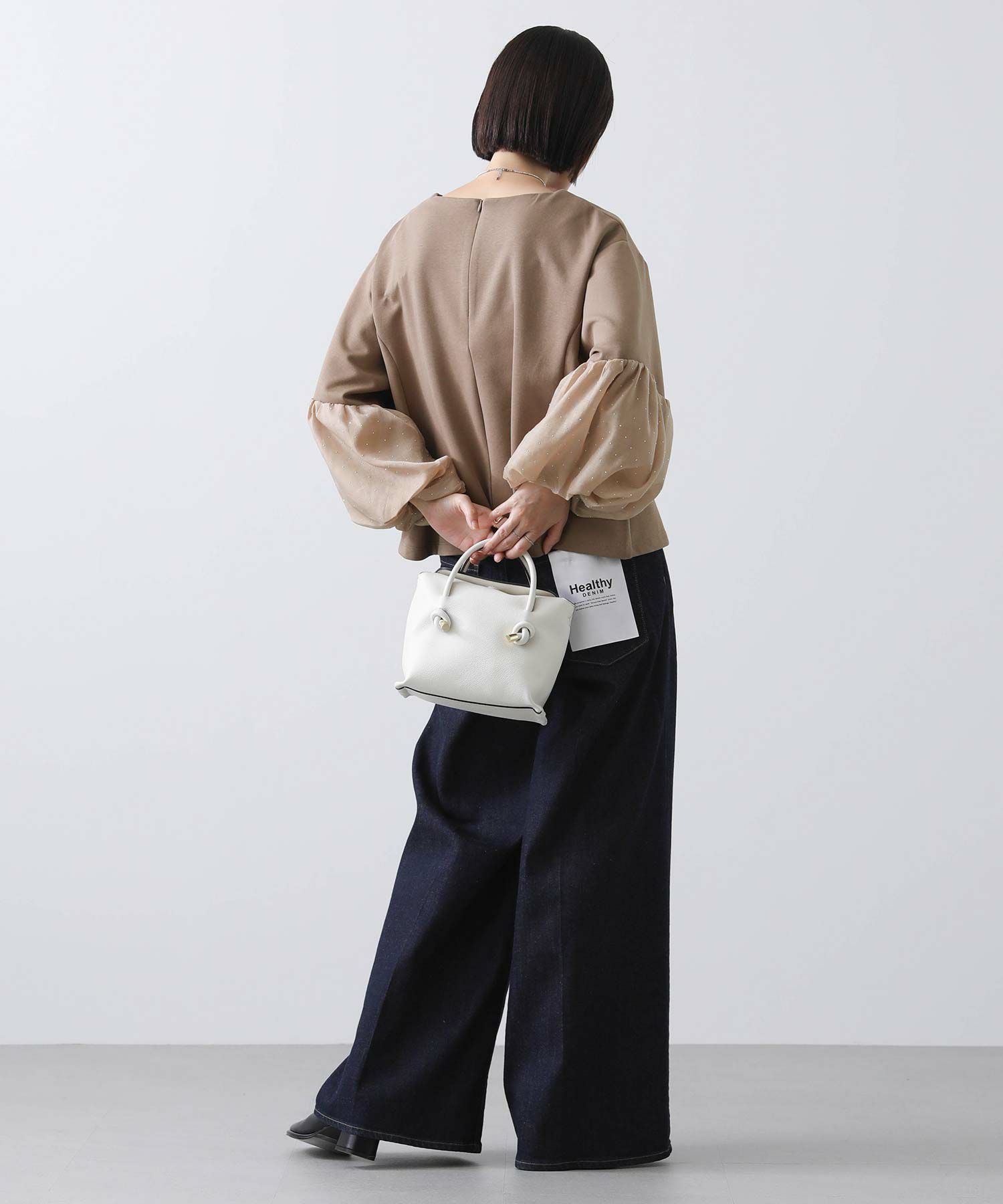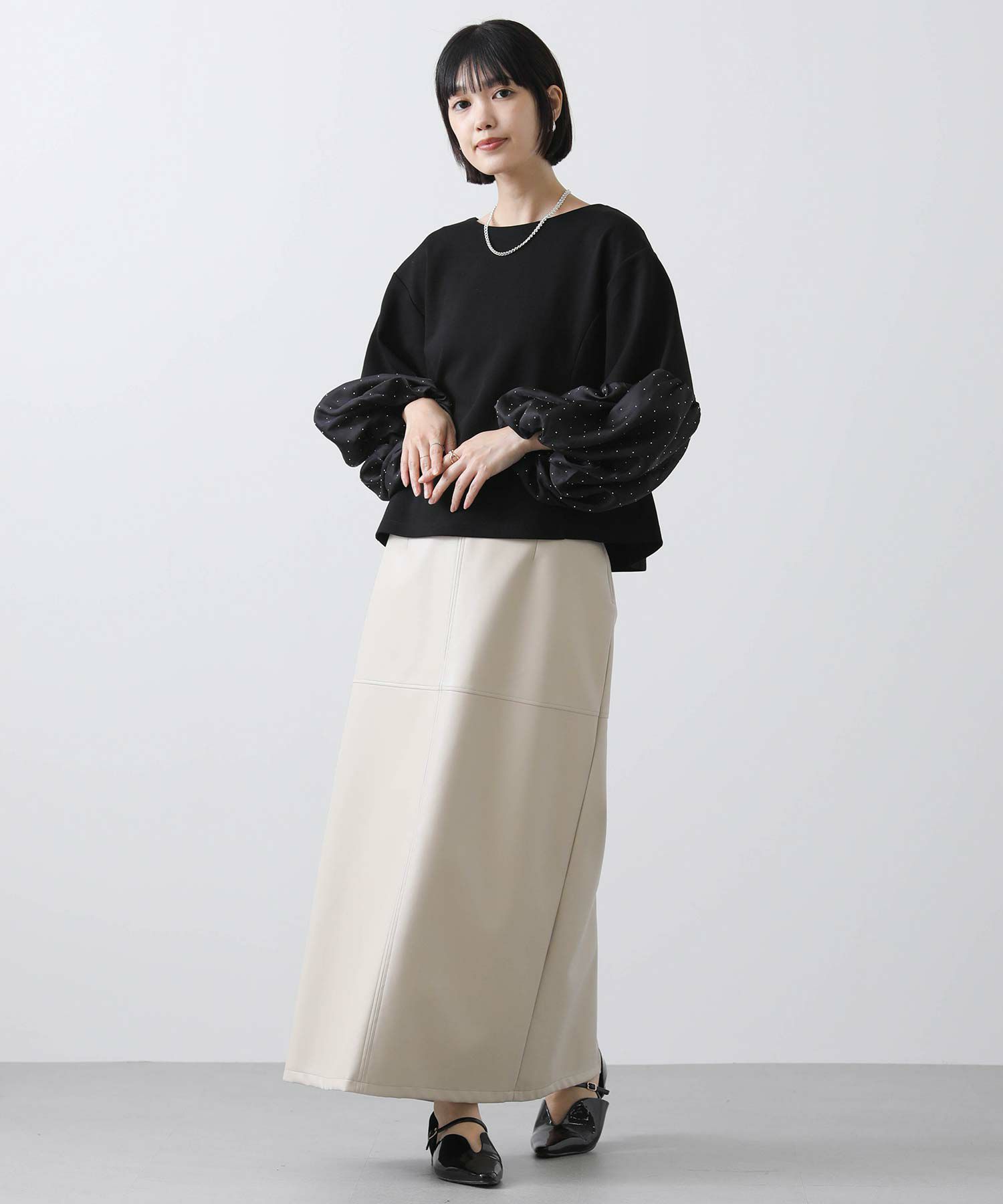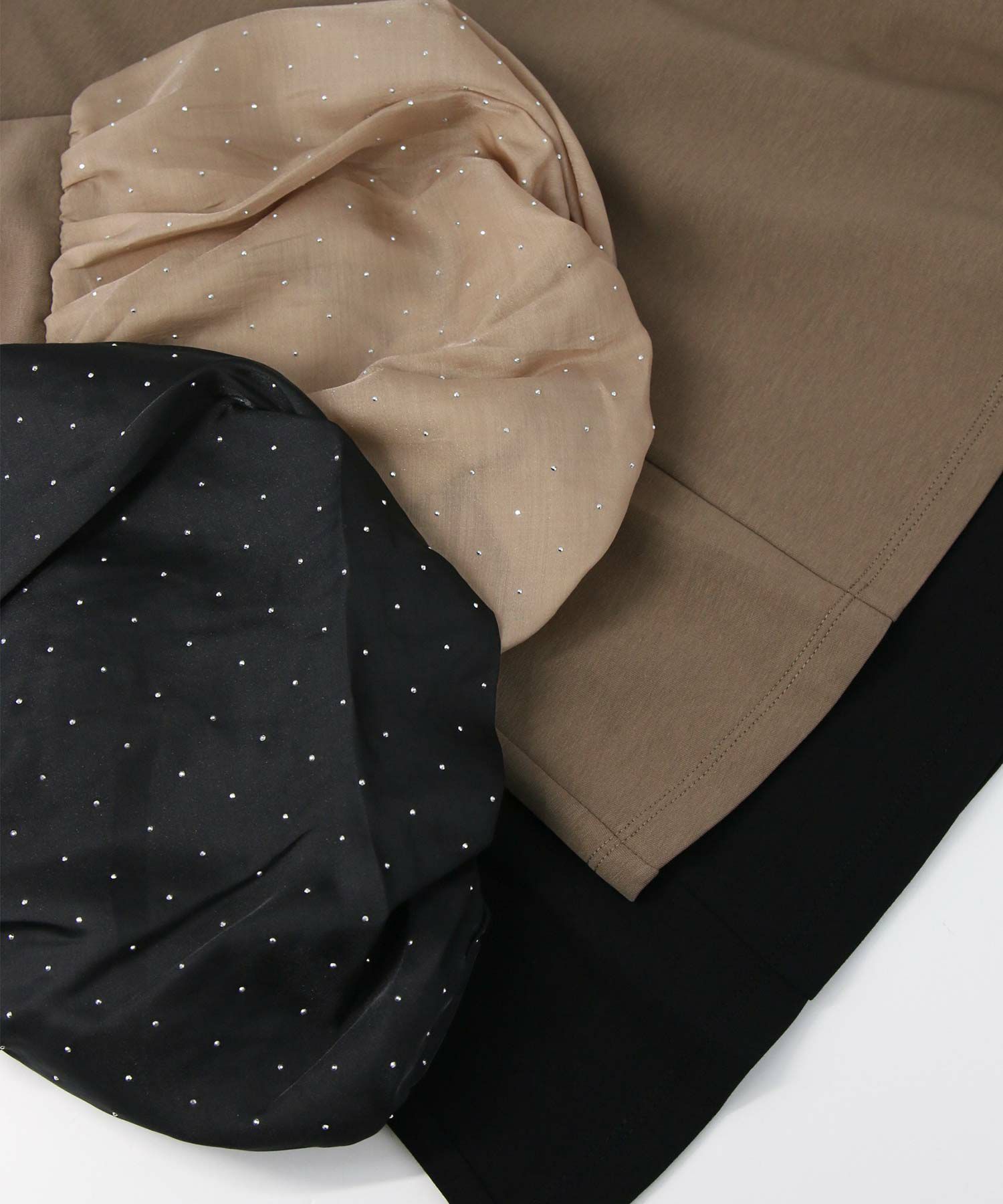 異素材のパフスリーブに、ランダムにつけられたラインストーンがキラキラと光り、コーディネートのポイントに。
