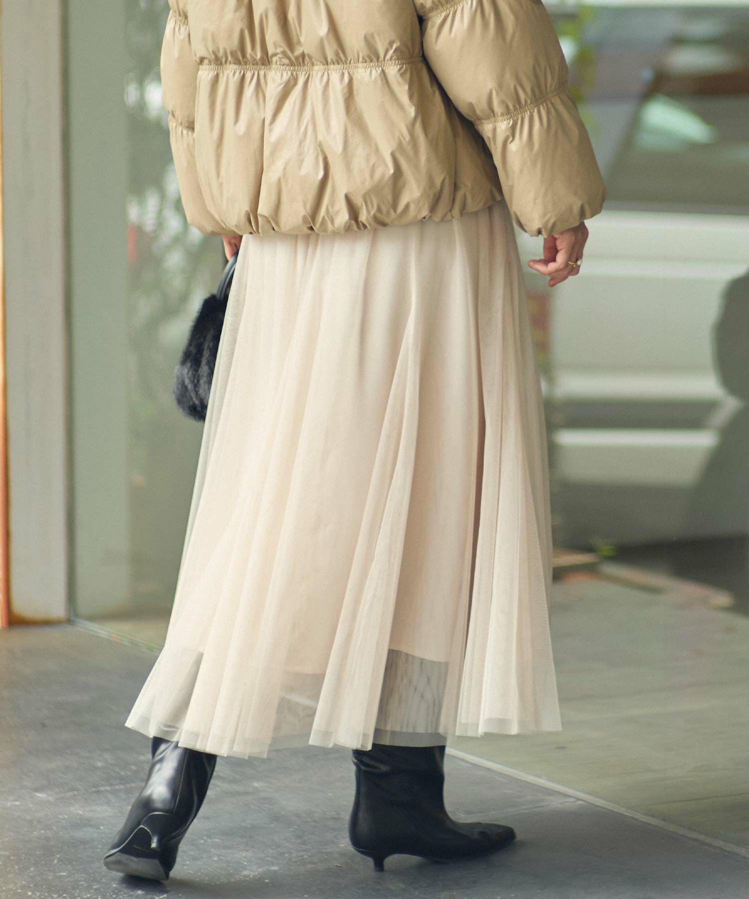 ふうわりと程よく広がるチュール素材を使用したボリュームのあるスカート。