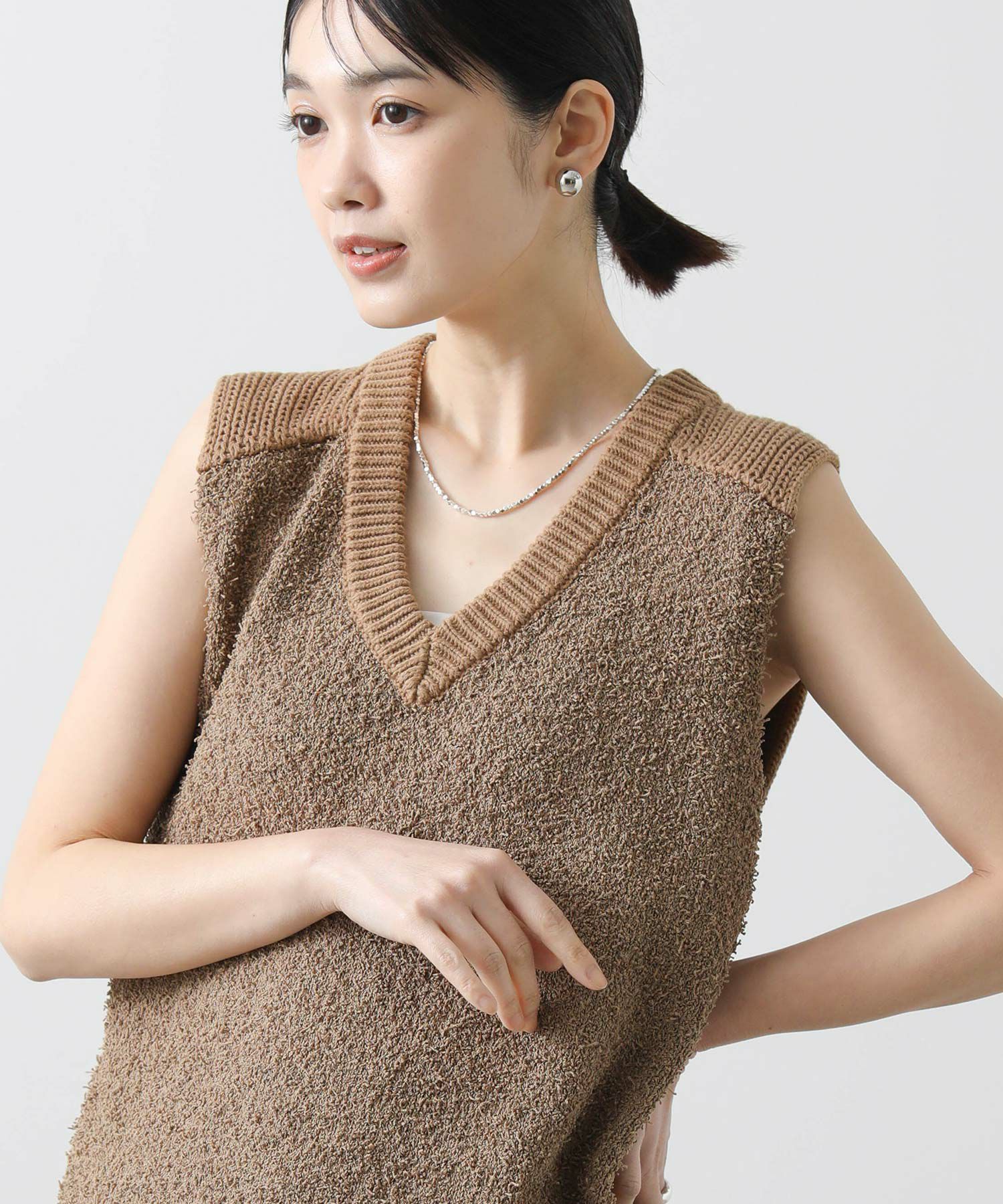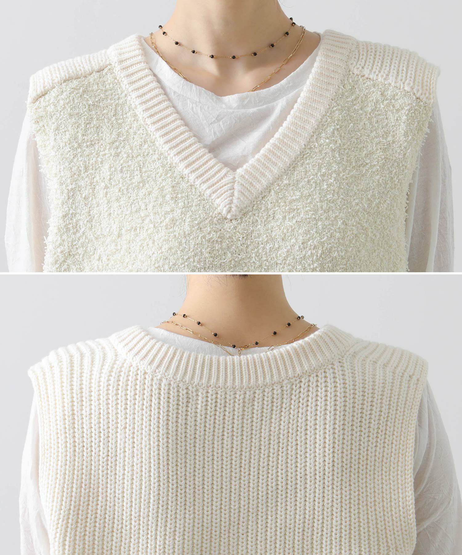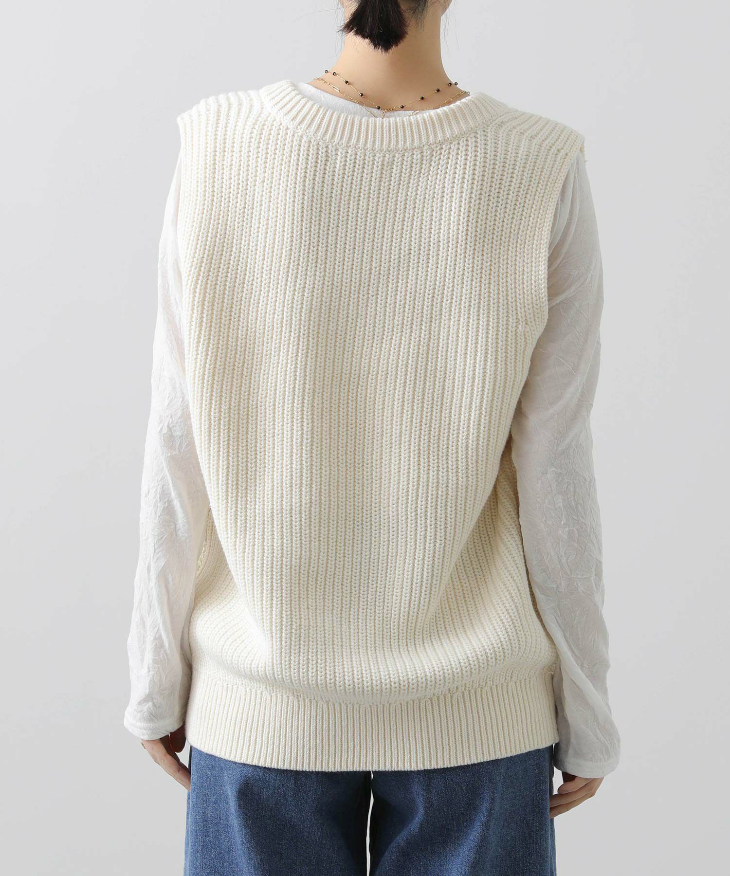 【AGAWD(アガウド)】から、前見頃と後ろ見頃で編み地を変え、表情豊かな風合いで仕上げたニットベストをセレクト。