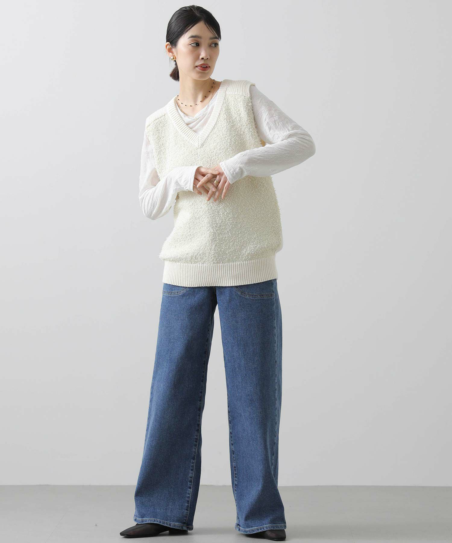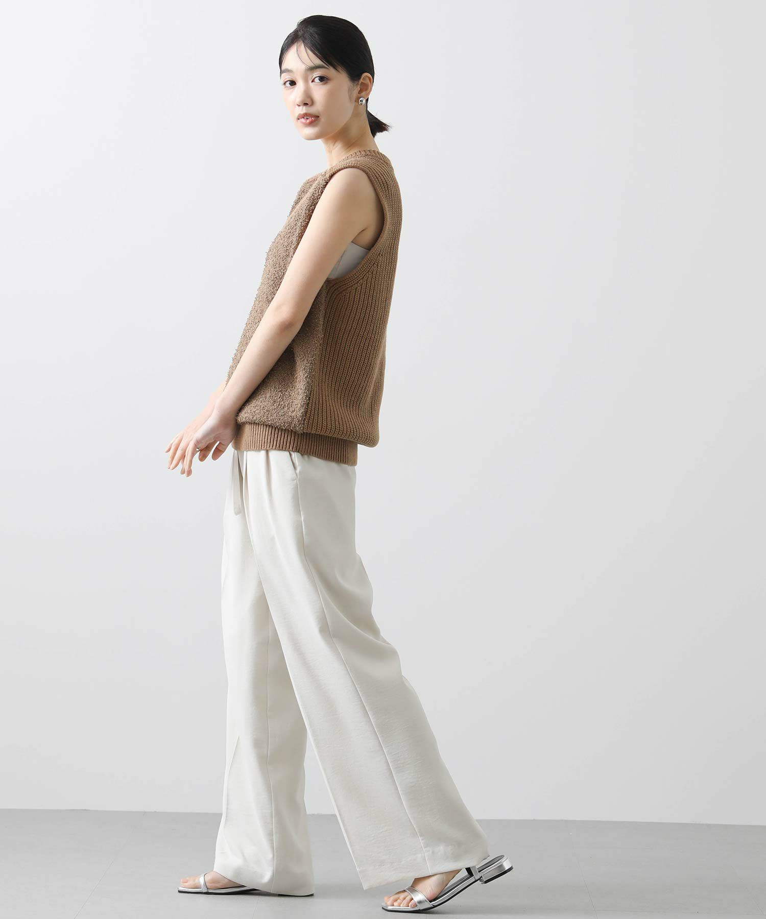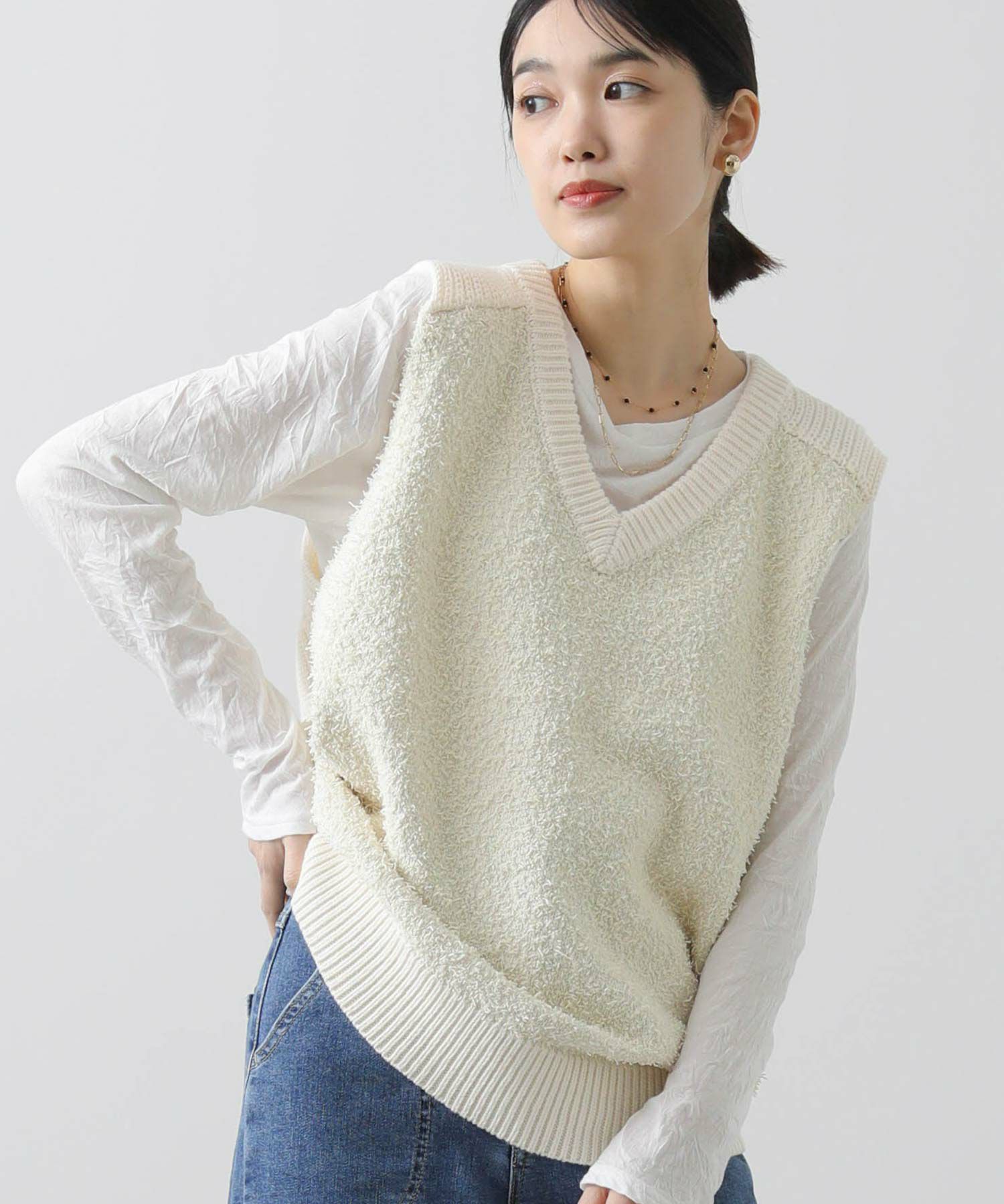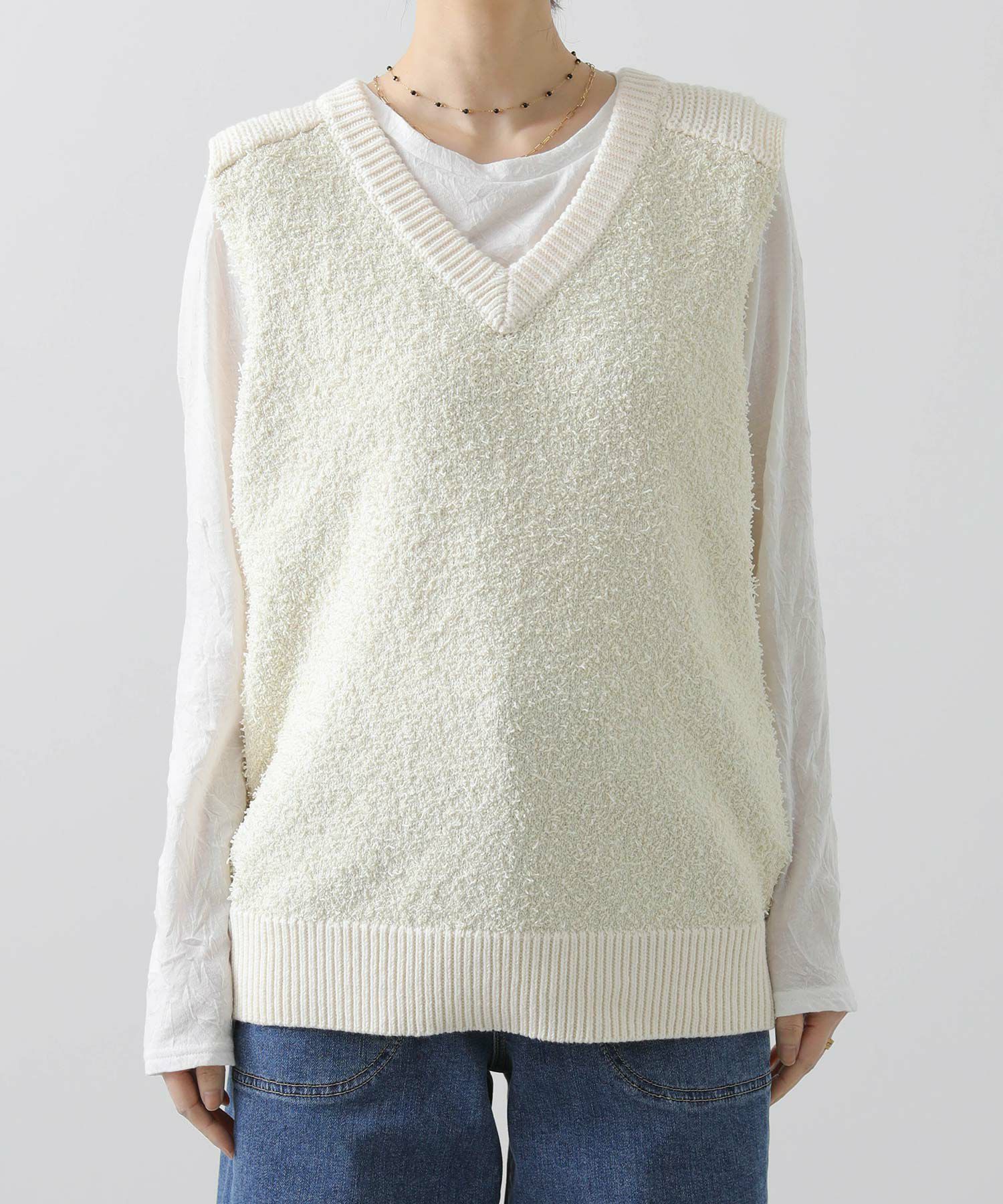 【AGAWD(アガウド)】から、前見頃と後ろ見頃で編み地を変え、表情豊かな風合いで仕上げたニットベストをセレクト。