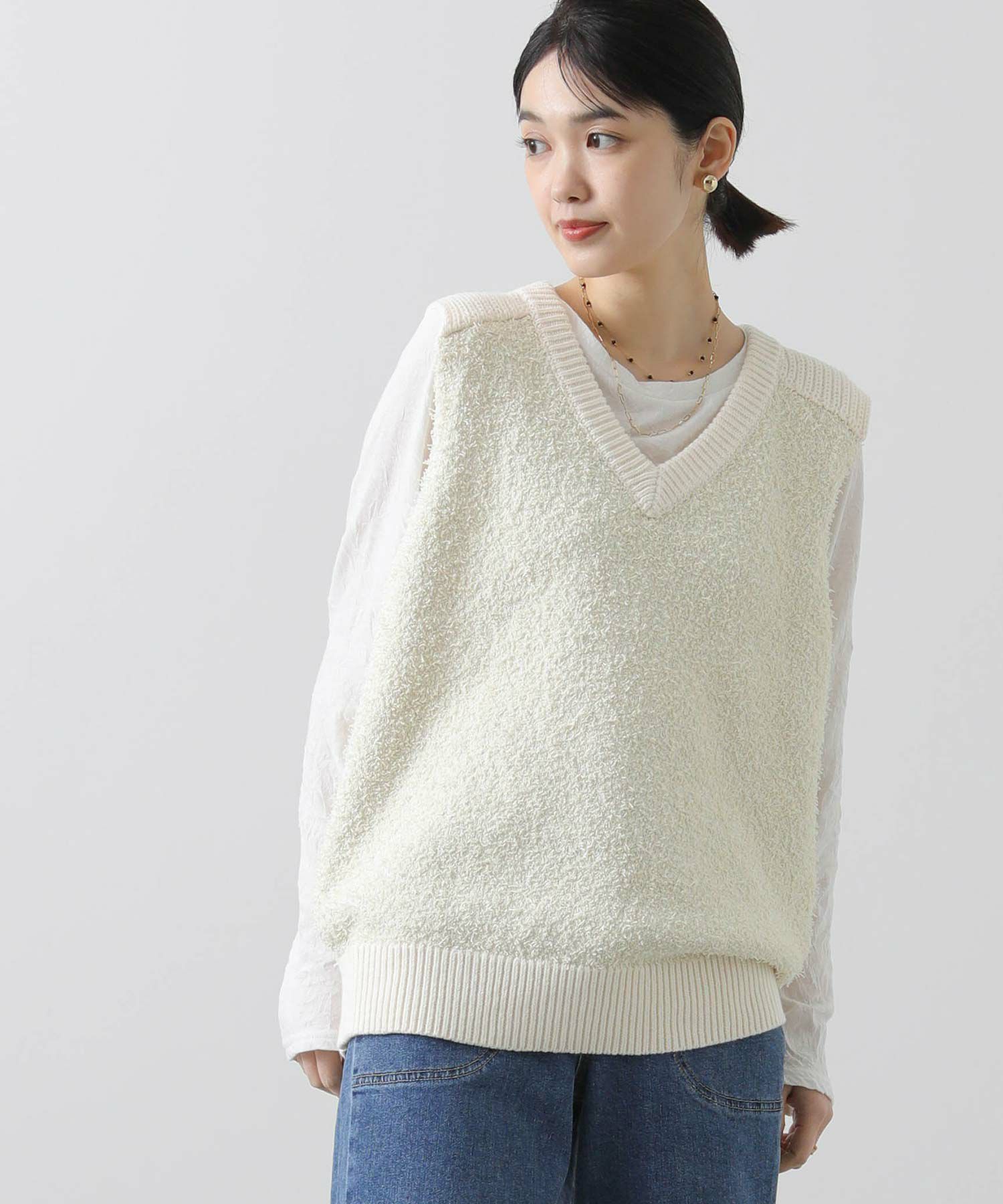 肩も程よく隠れるので一枚でトップスとして着やすく、シアーカットソーやワンピースなど、レイヤードするアイテム次第で雰囲気を変えて楽しんでいただけます。