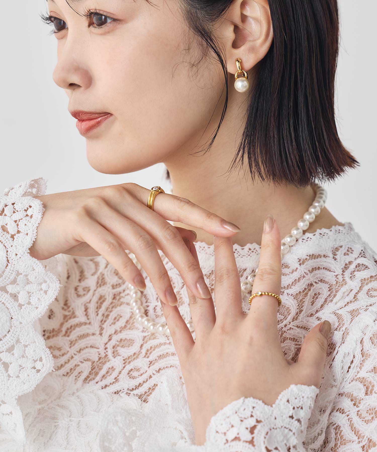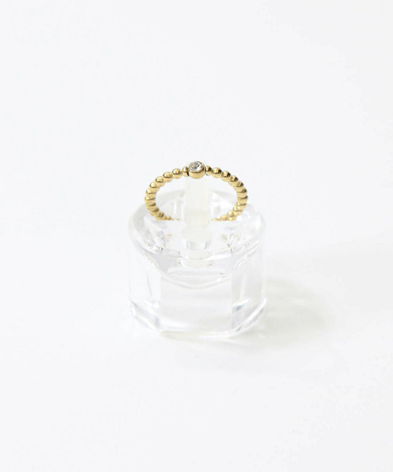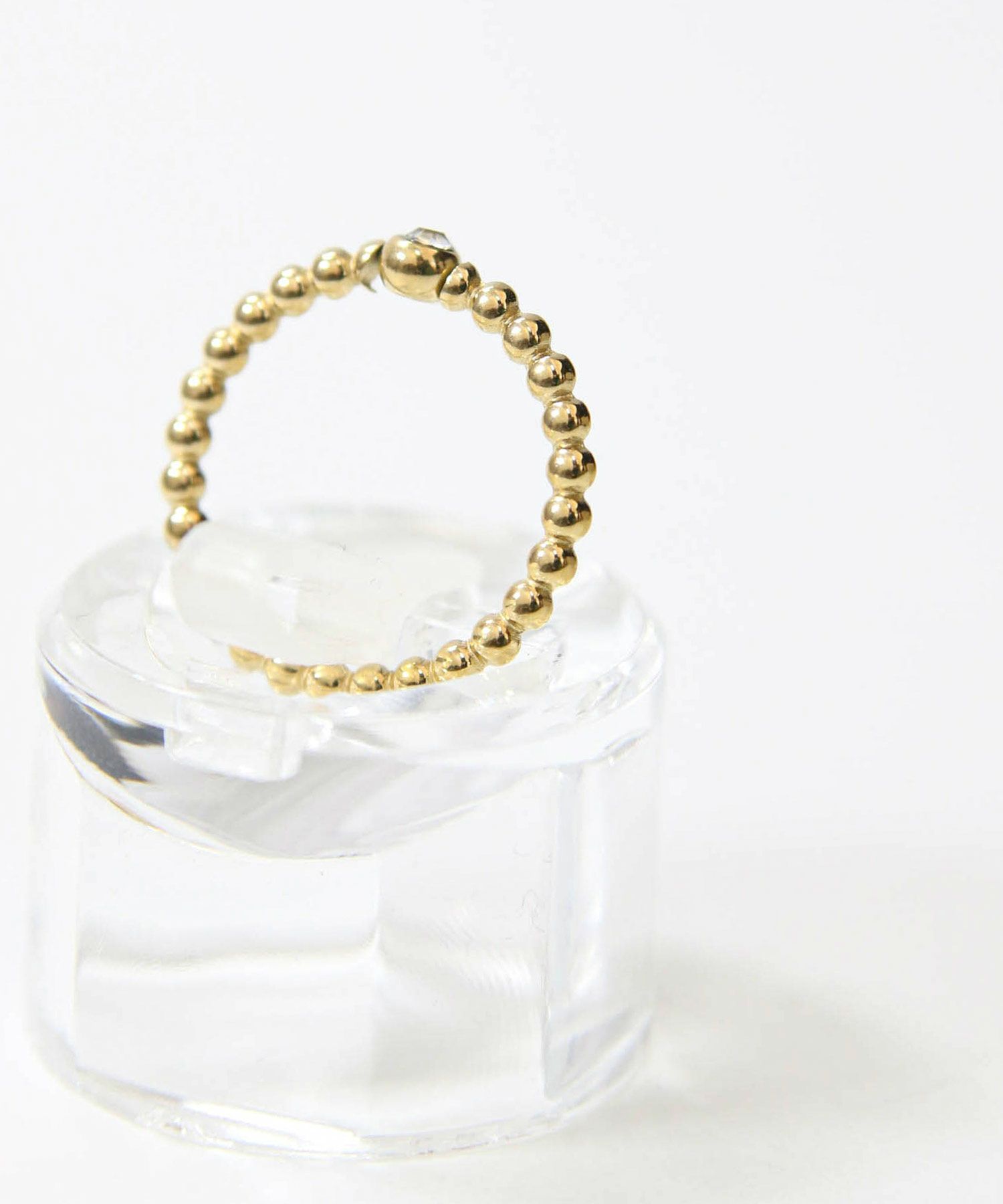 粒をくっつけたようなデザインの華奢なリングとストーンの組み合わせが華やかで、指を華奢に女性らしく見せてくれます。