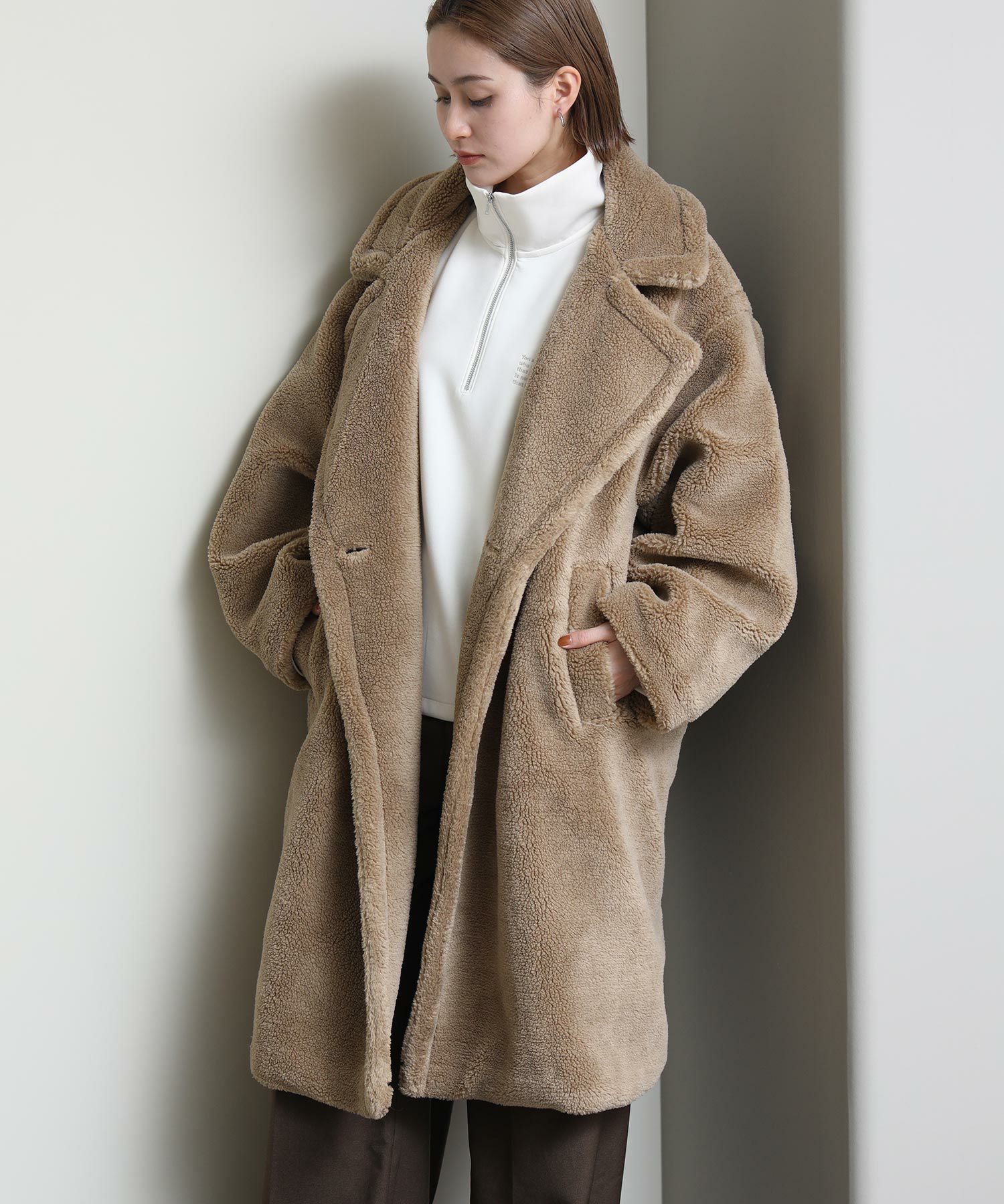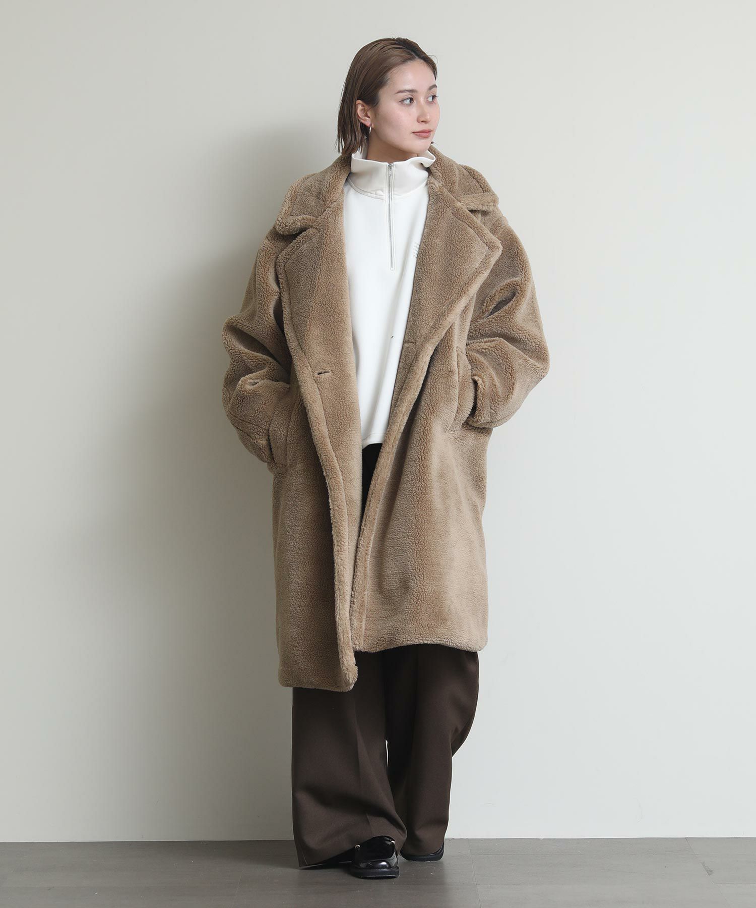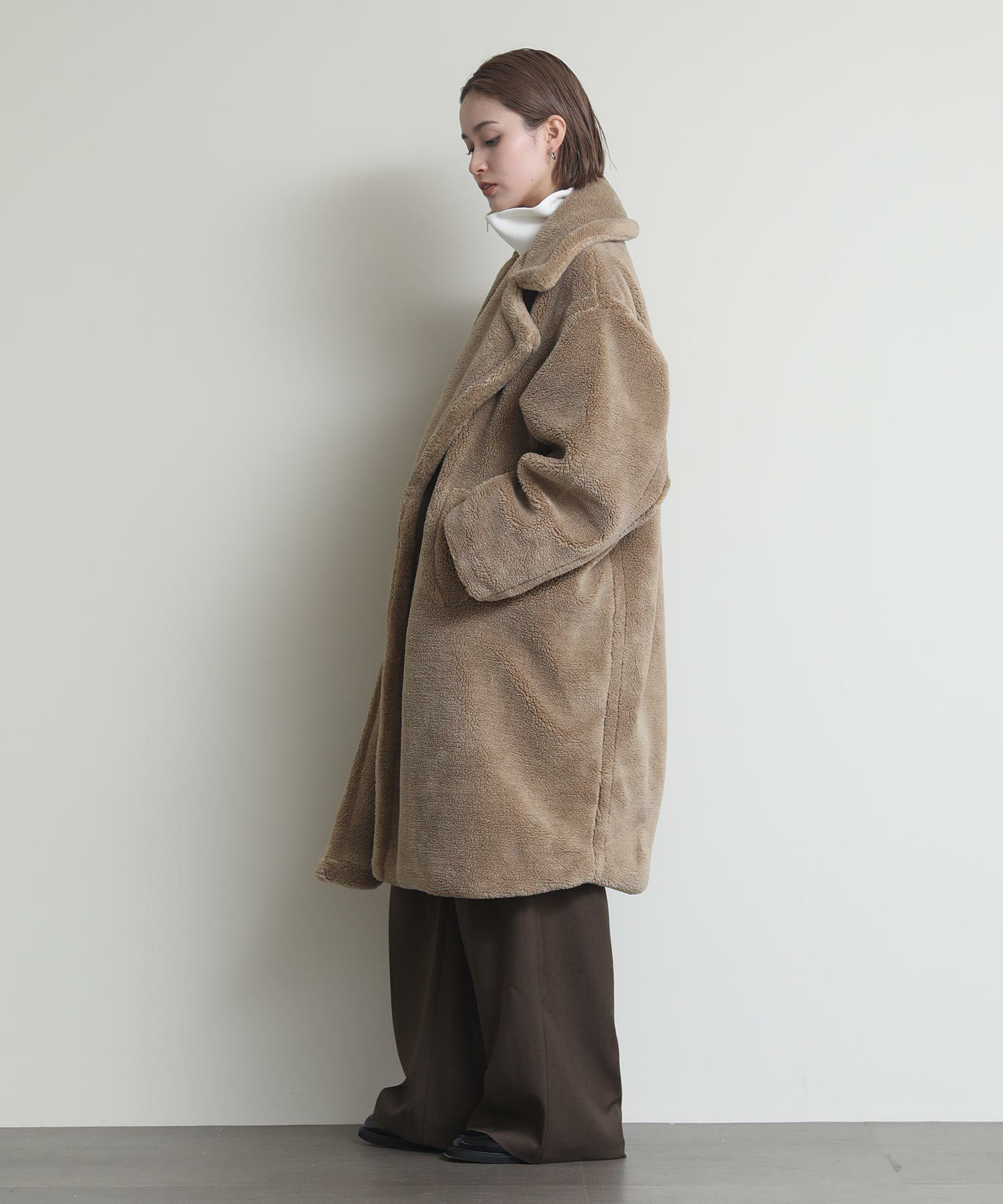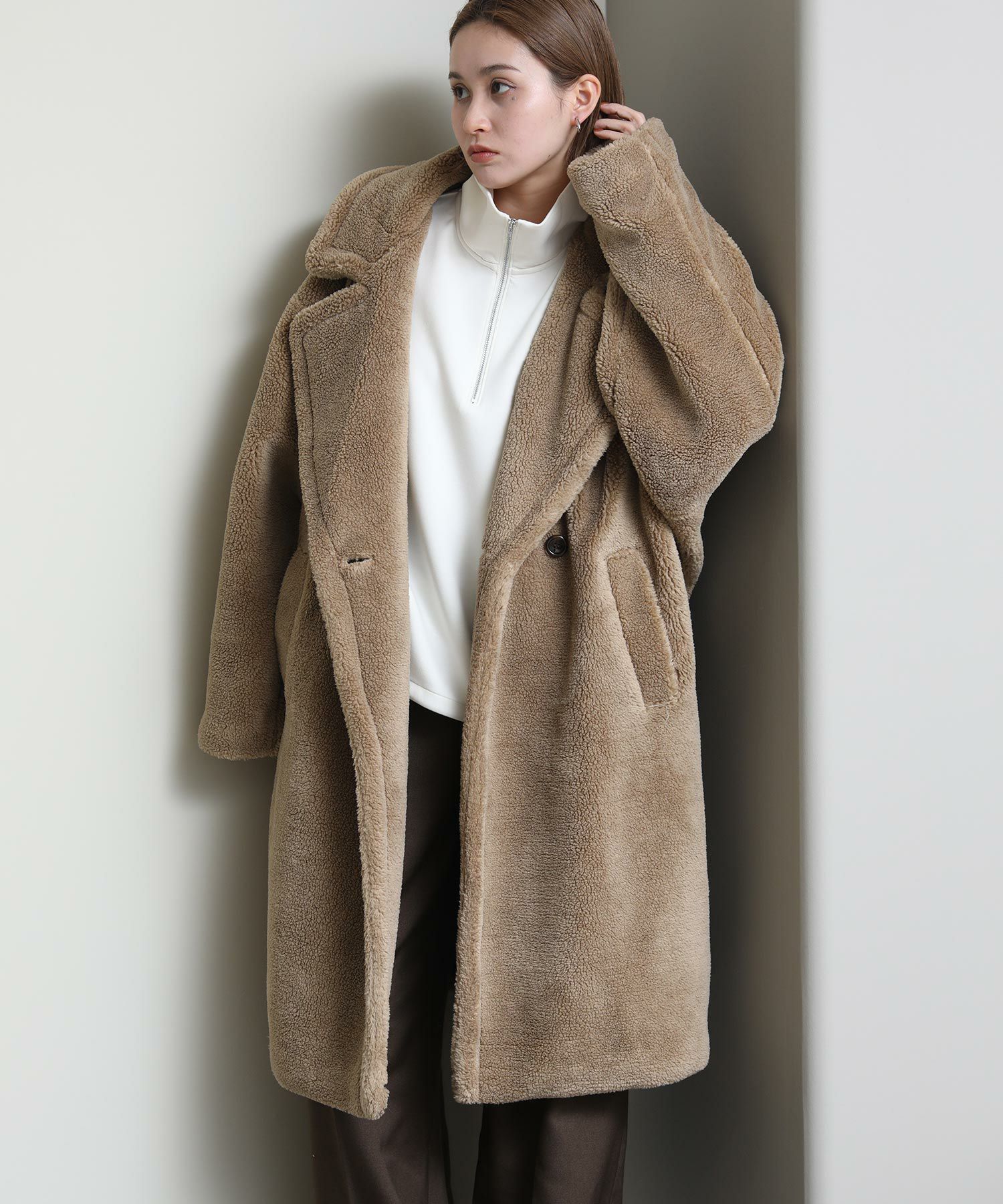テディベアのようなミニボアを使用したロングコート。
