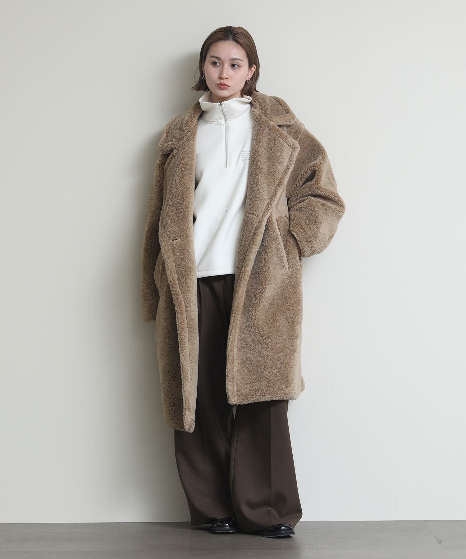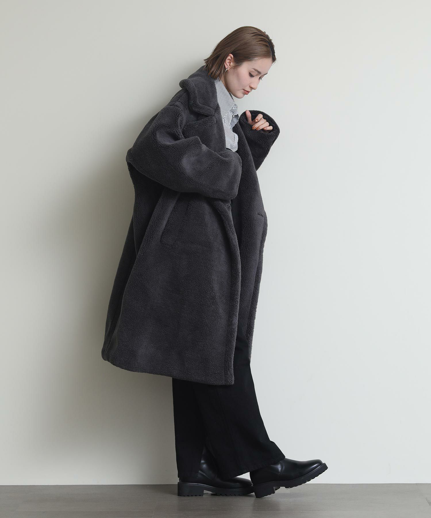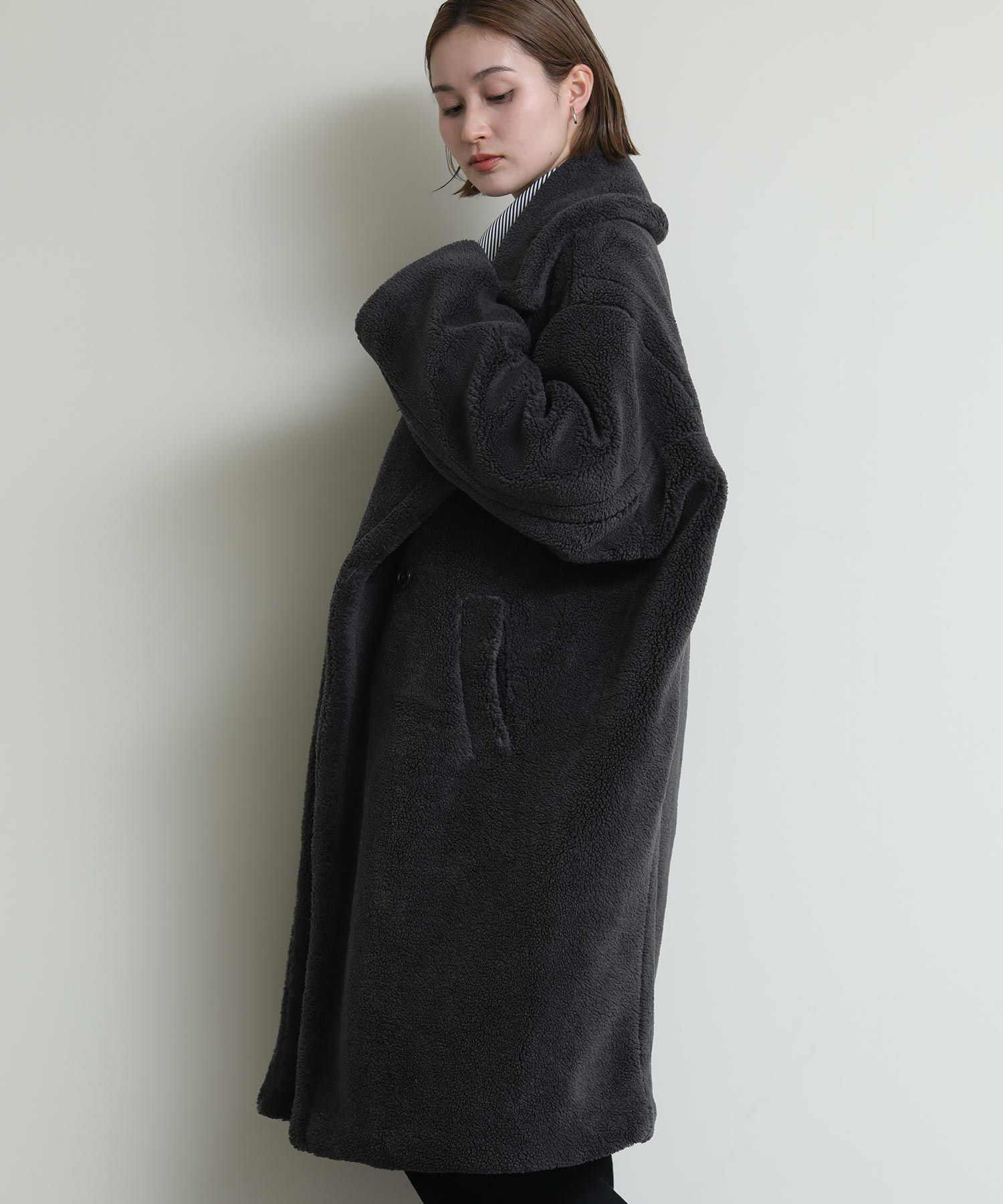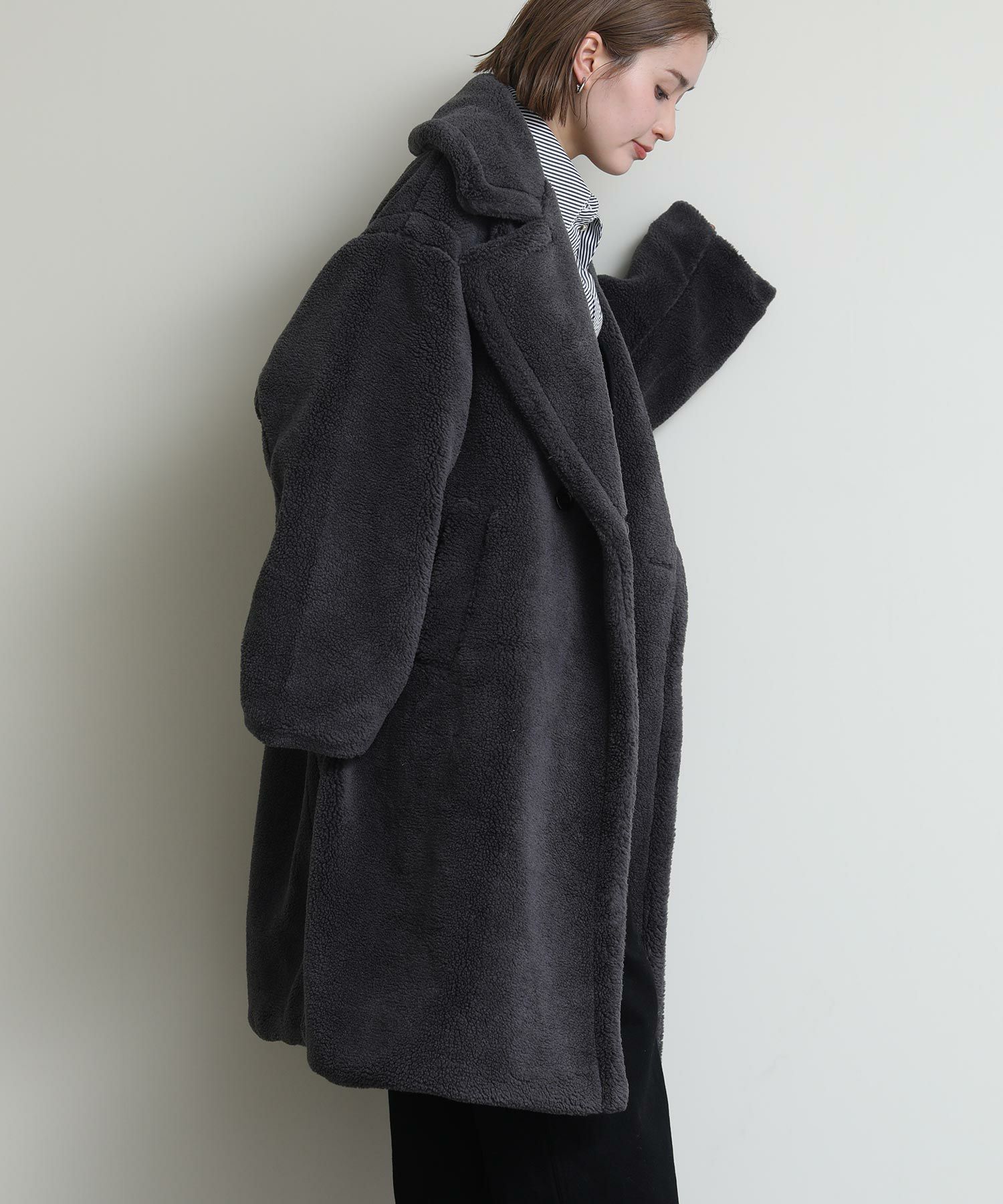 テディベアのようなミニボアを使用したロングコート。