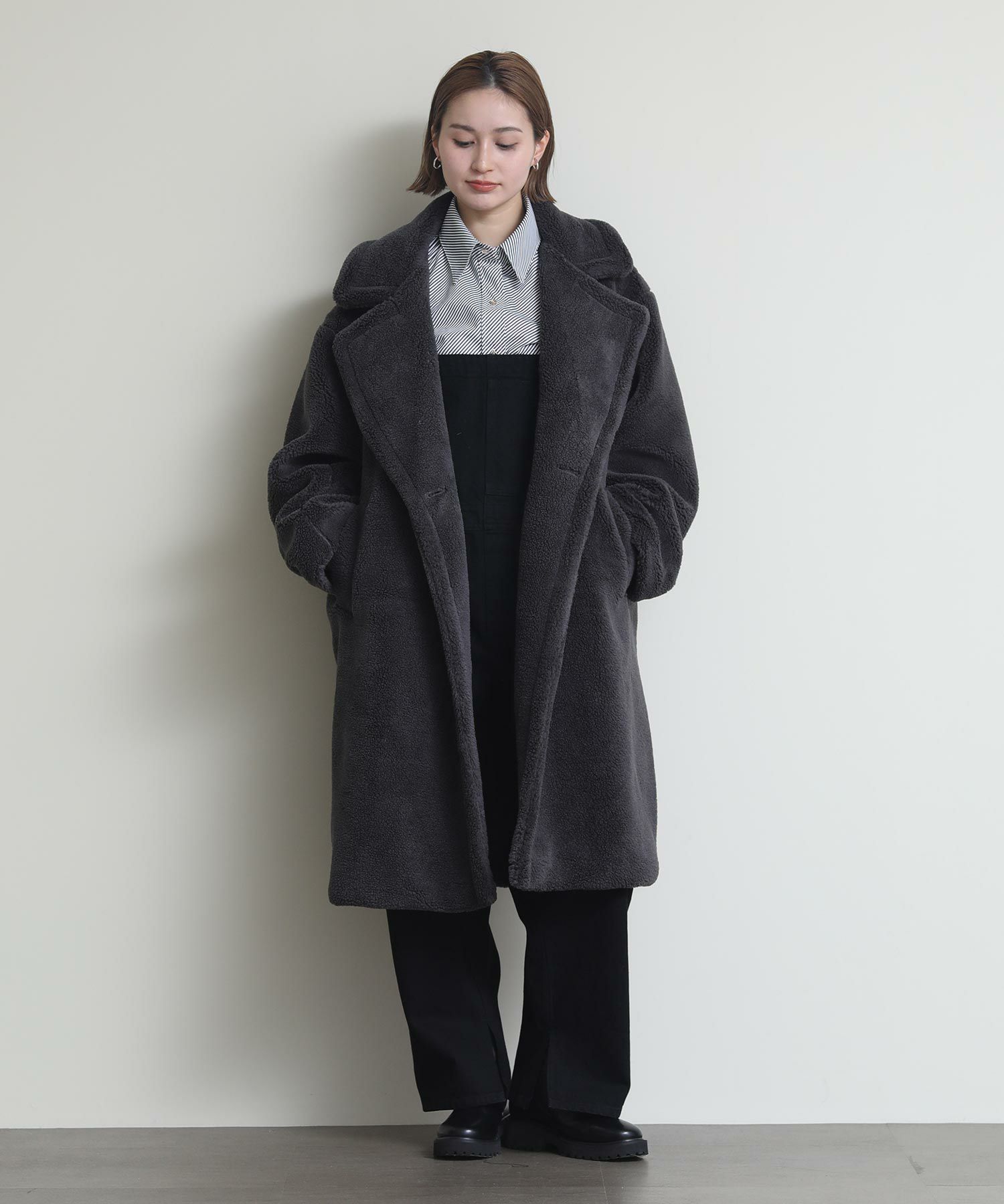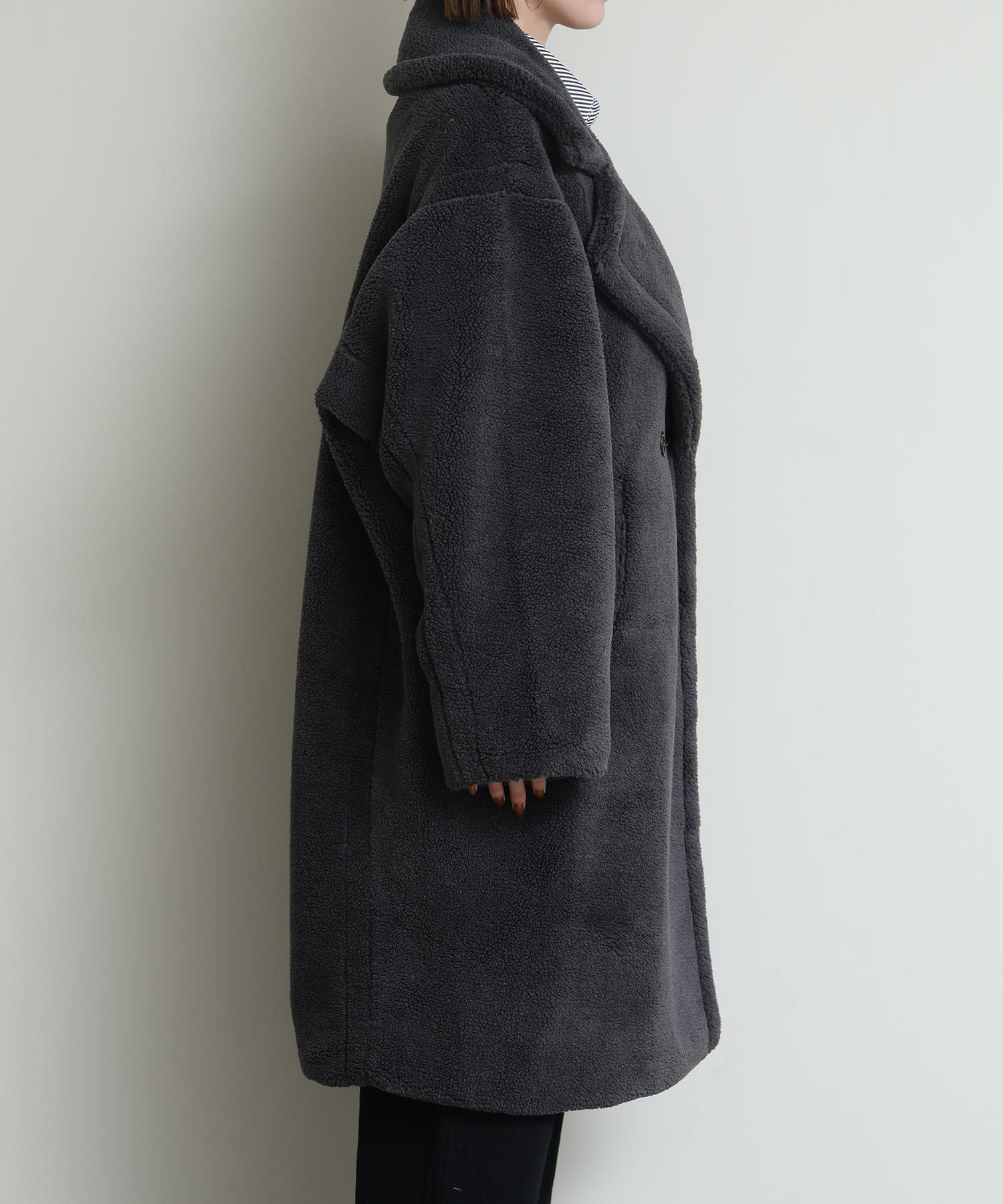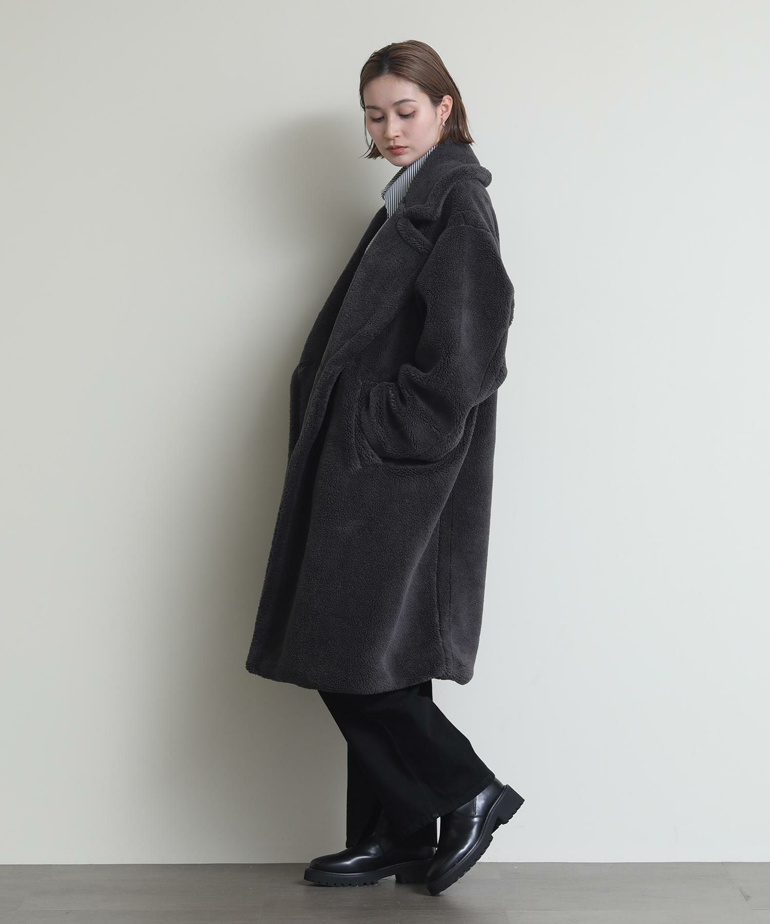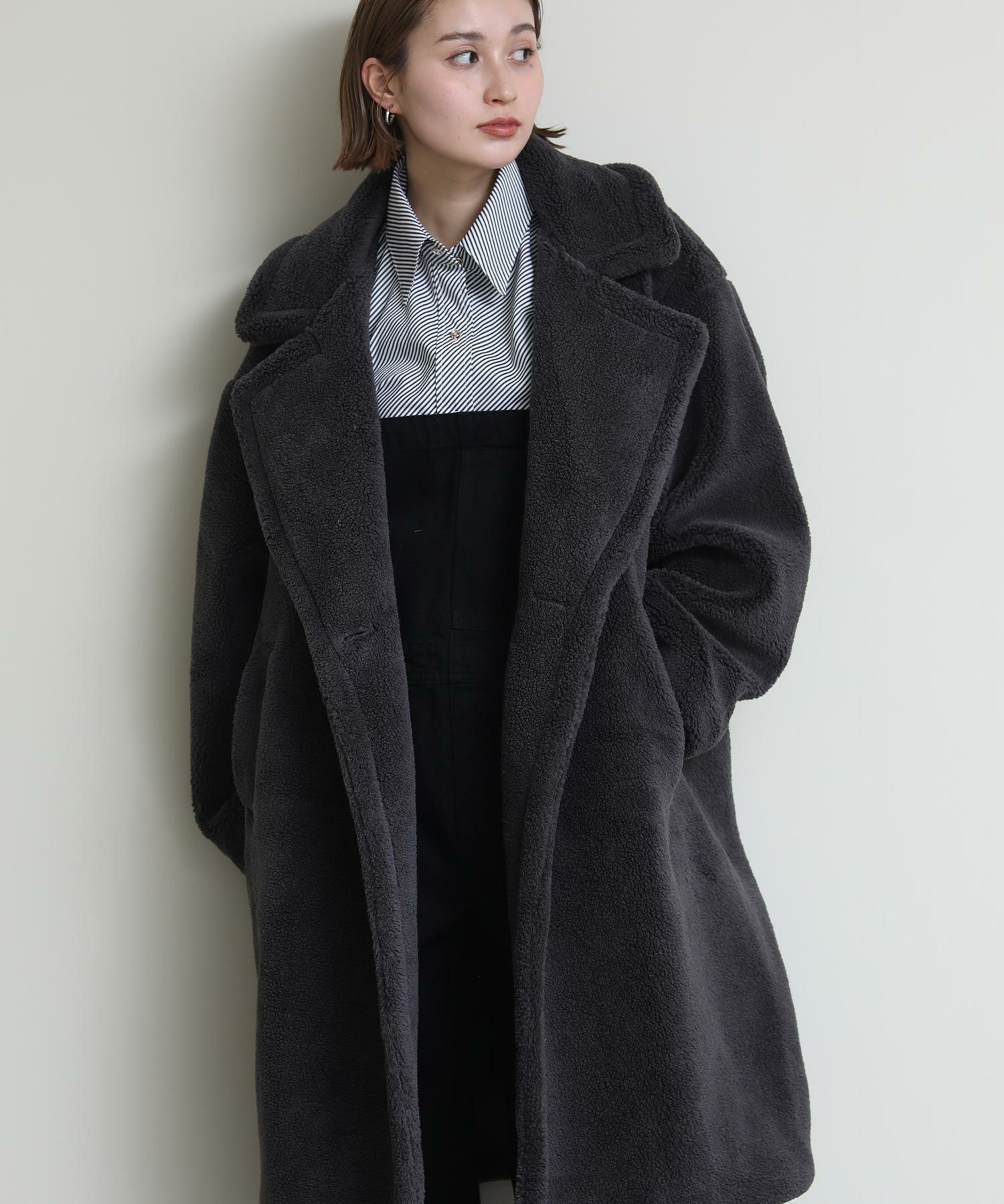 テディベアのようなミニボアを使用したロングコート。