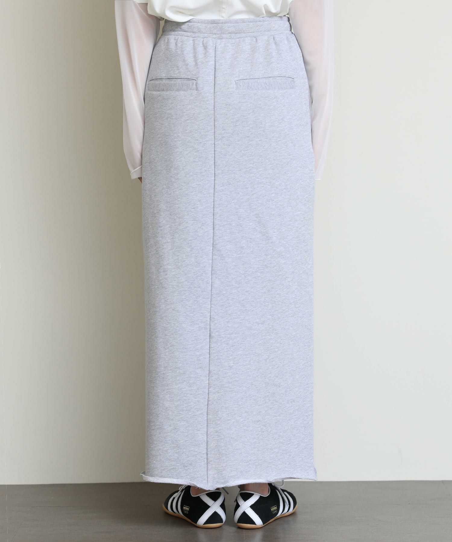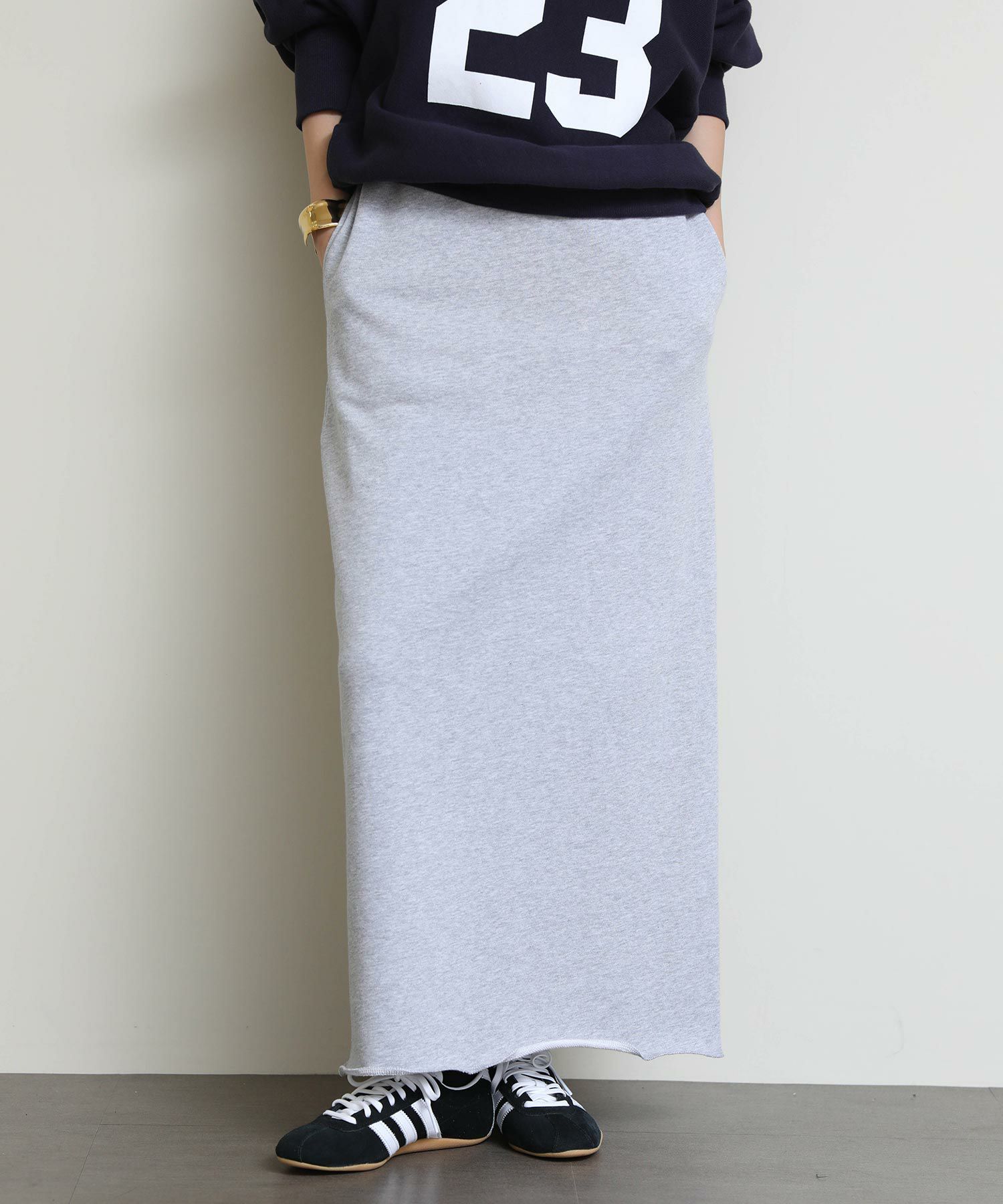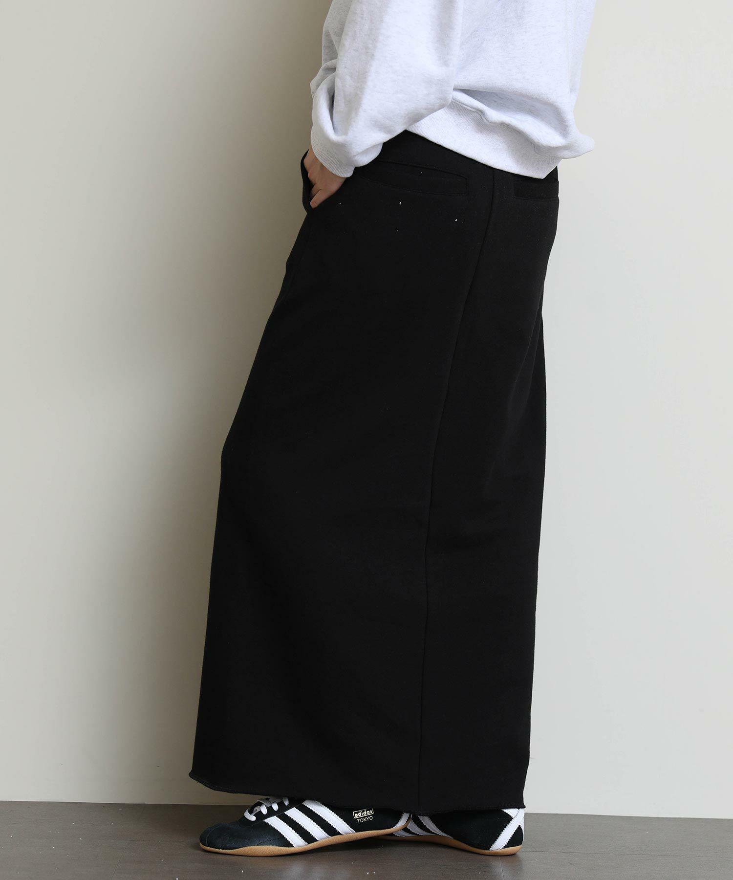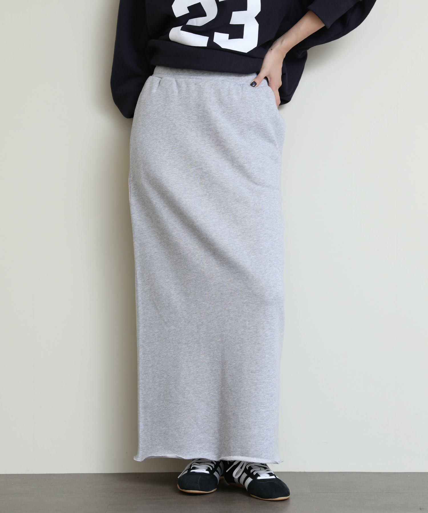 切りっぱなしのデザインがアクセントになるスウェットタイトスカート。