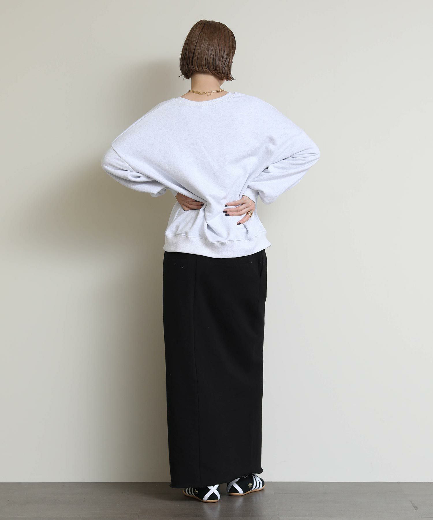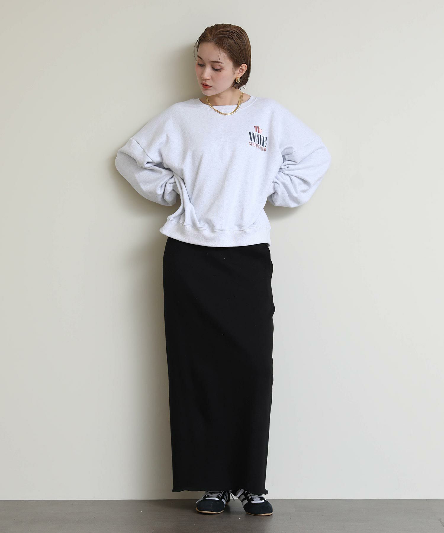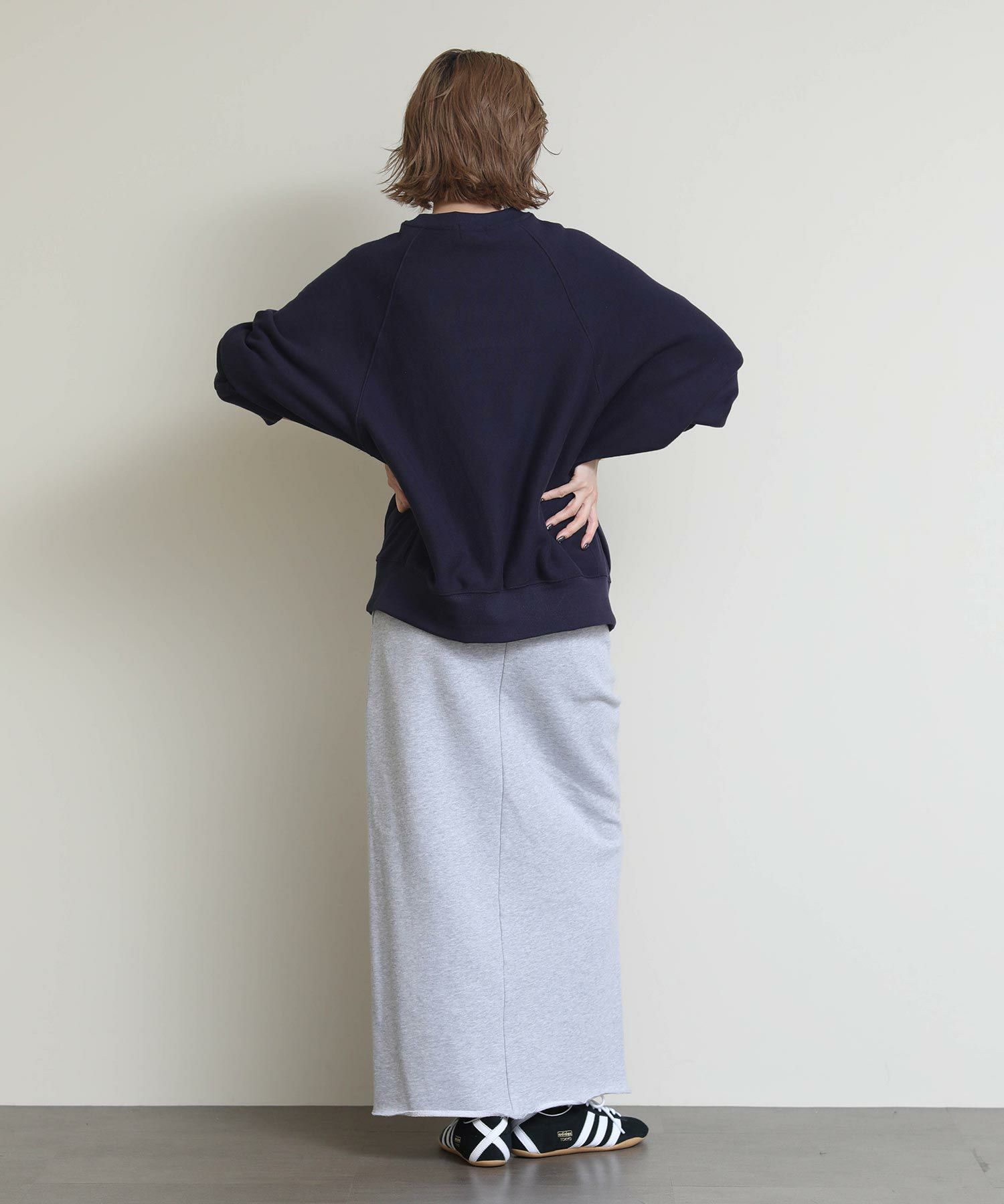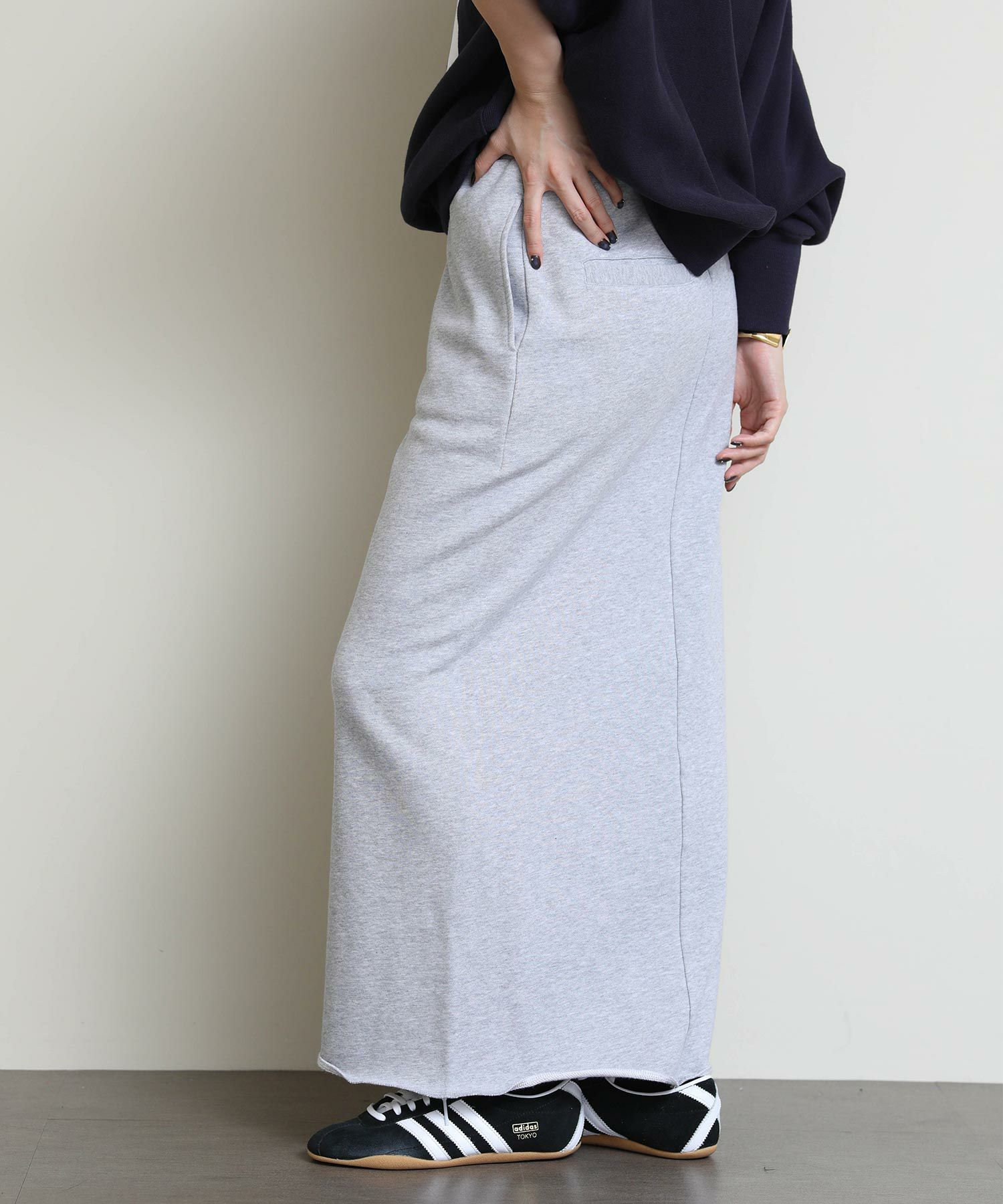 切りっぱなしのデザインがアクセントになるスウェットタイトスカート。