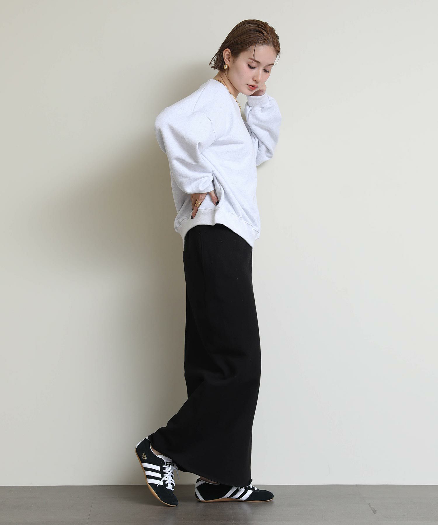 程よい厚みのスウェット素材でオールシーズン楽しめます。ウエストゴム仕様でストレスフリーな着心地。着用するだけで今年らしいスタイリングが楽しめます。シャツやニットなどカジュアルなトップスとの合わせがおすすめ。