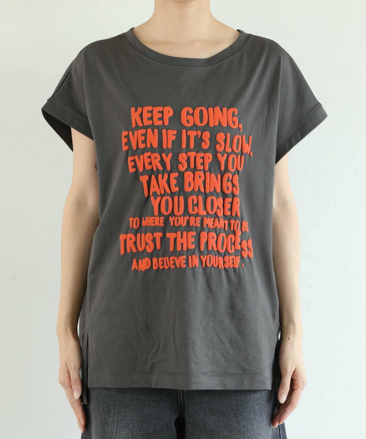フロントに大きく主張する立体的な発砲プリントが印象的なロゴカットソー。