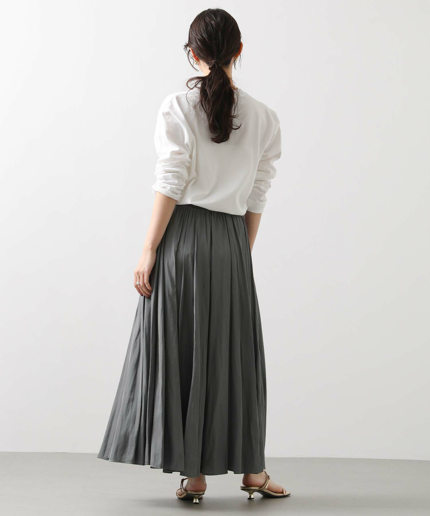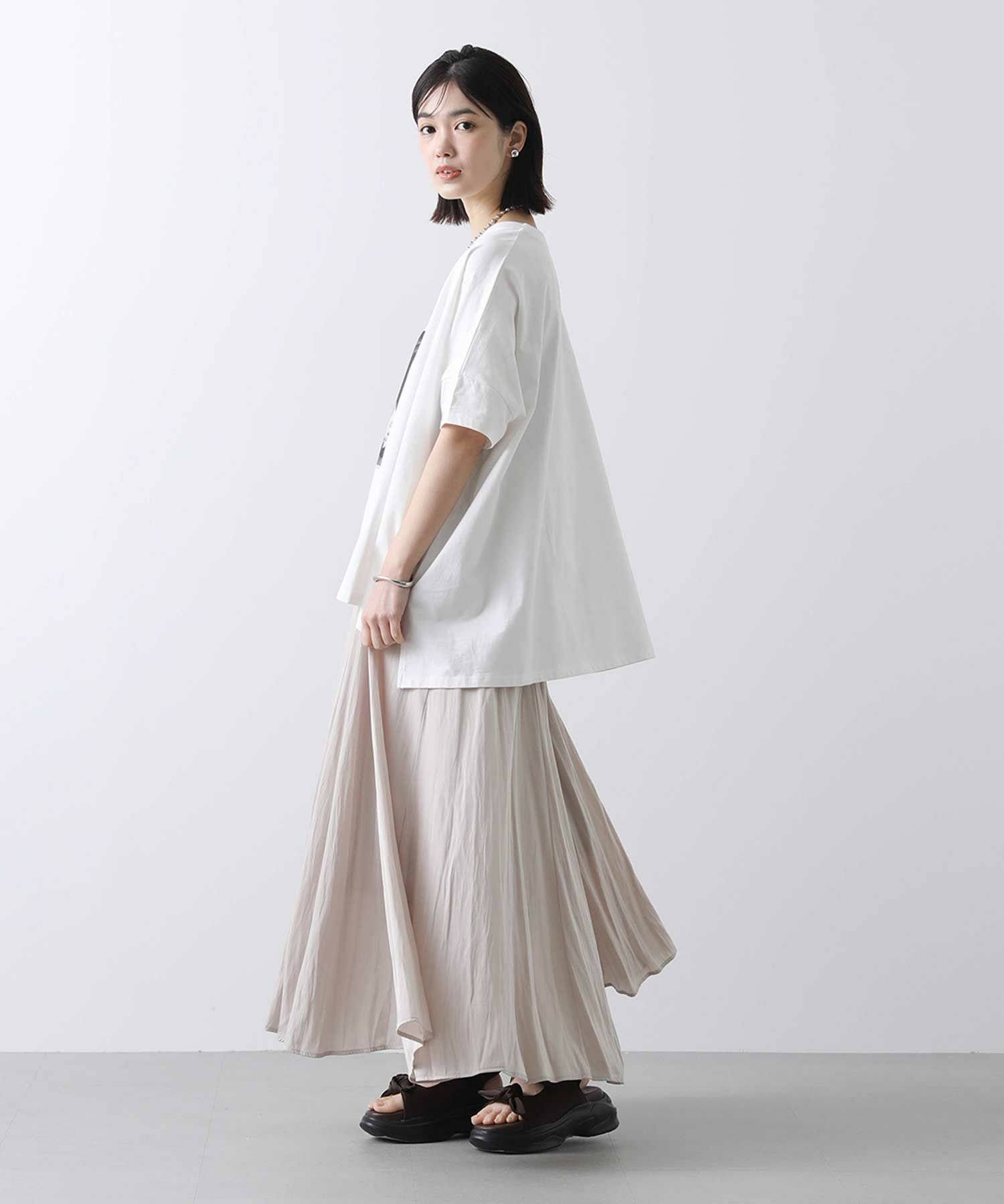 たっぷり分量感をとっていますが生地の落ち感がきれいなので、身体のラインをカバーして細見えしてくれる効果が期待できるシルエットになっています。ウエストはぐるり総ゴムで、柔らかいリブを使用しており、フィット感があり楽ちんな穿き心地です。