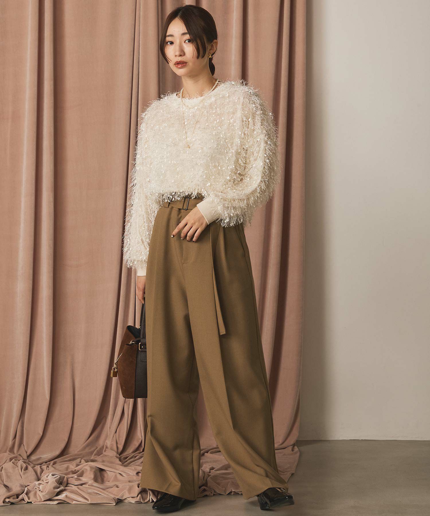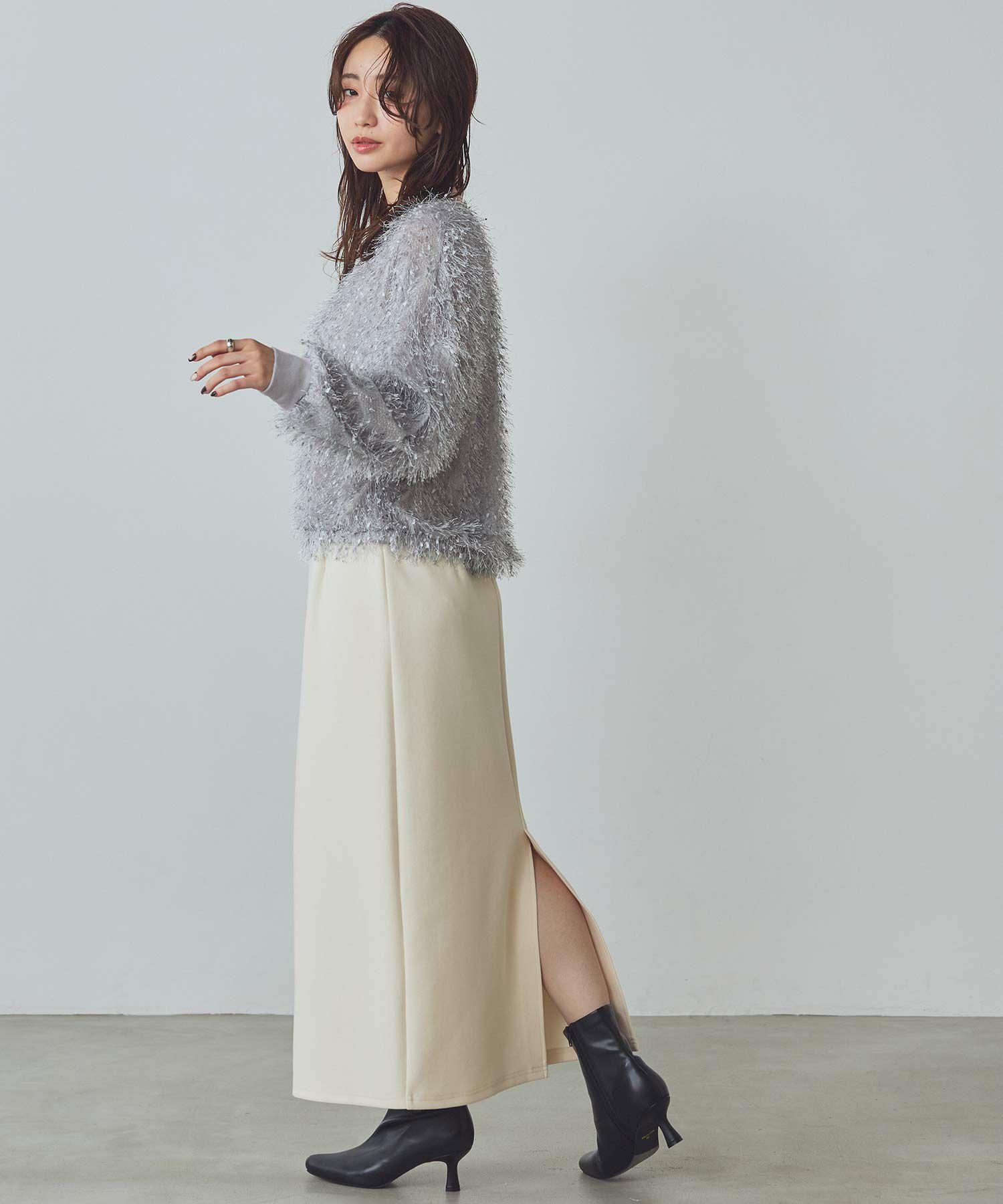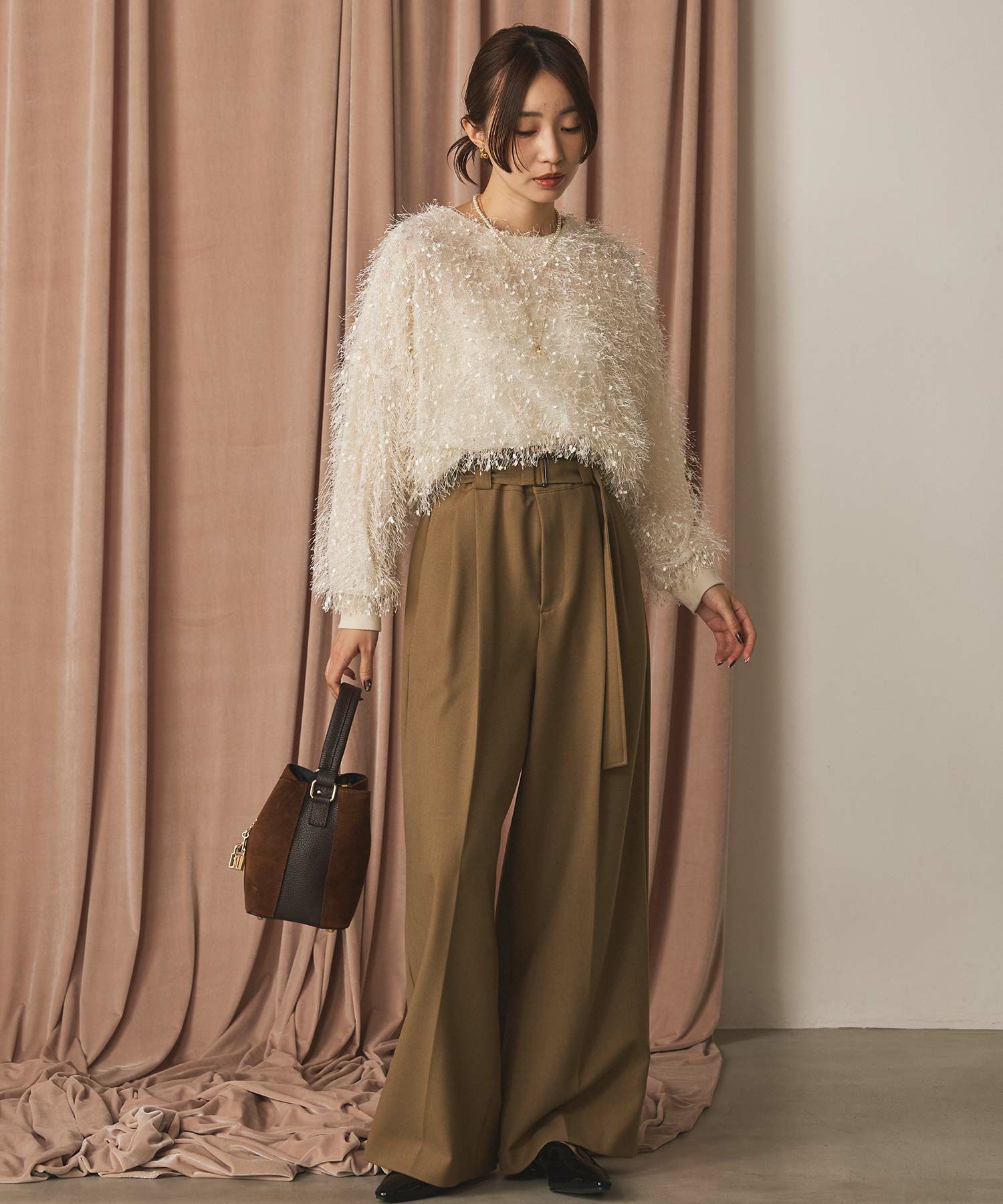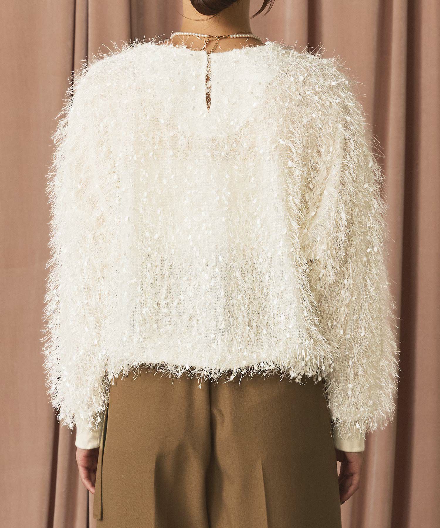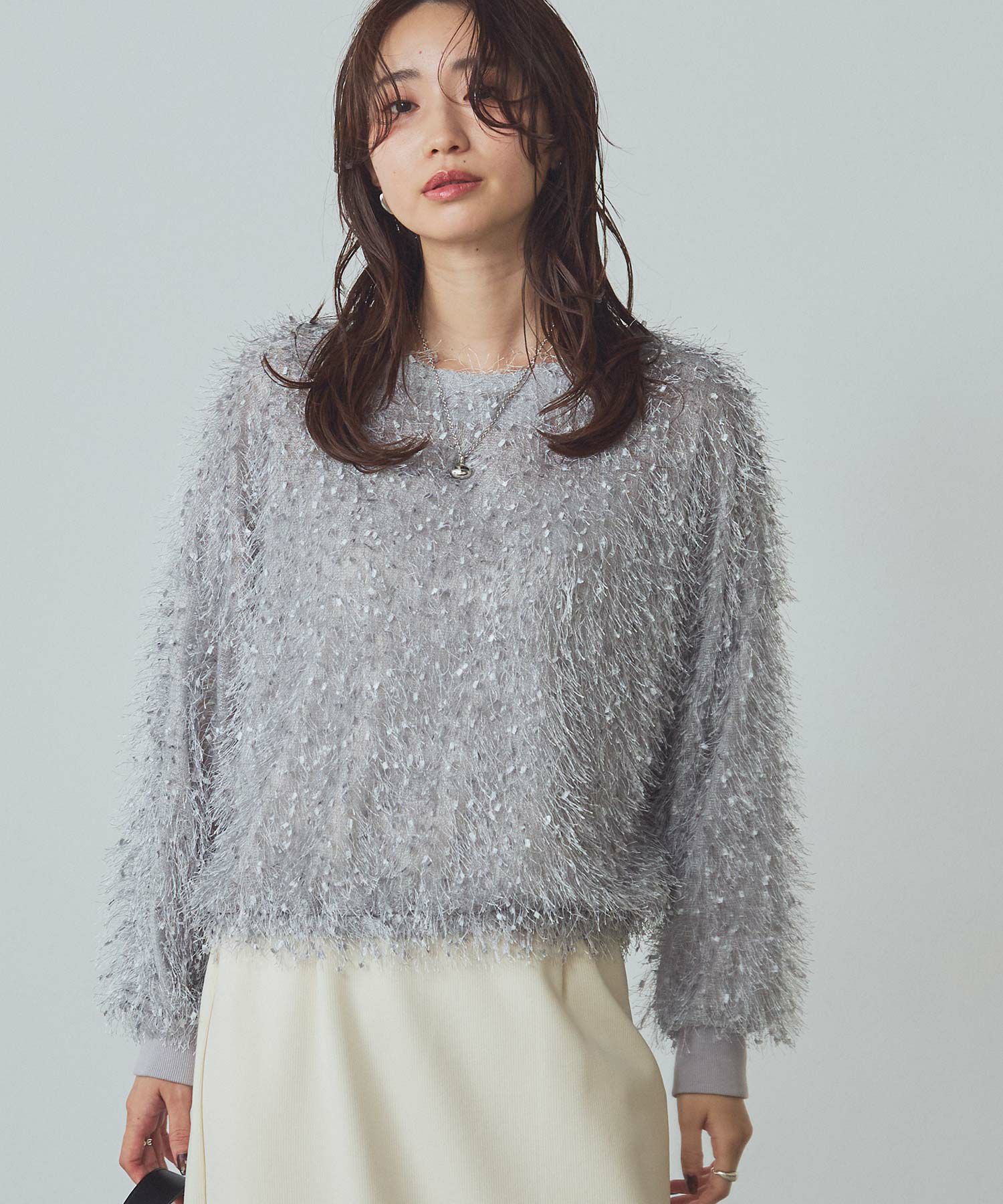 柔らかな毛足と光沢感のある素材が織り込まれたブラウスは、休日のスタイルに上品な華やかさを添えてくれる一枚です。