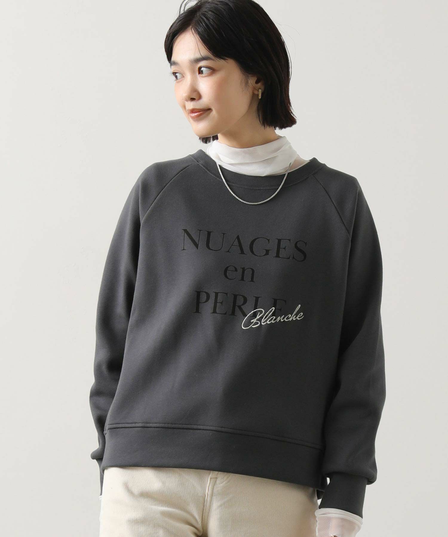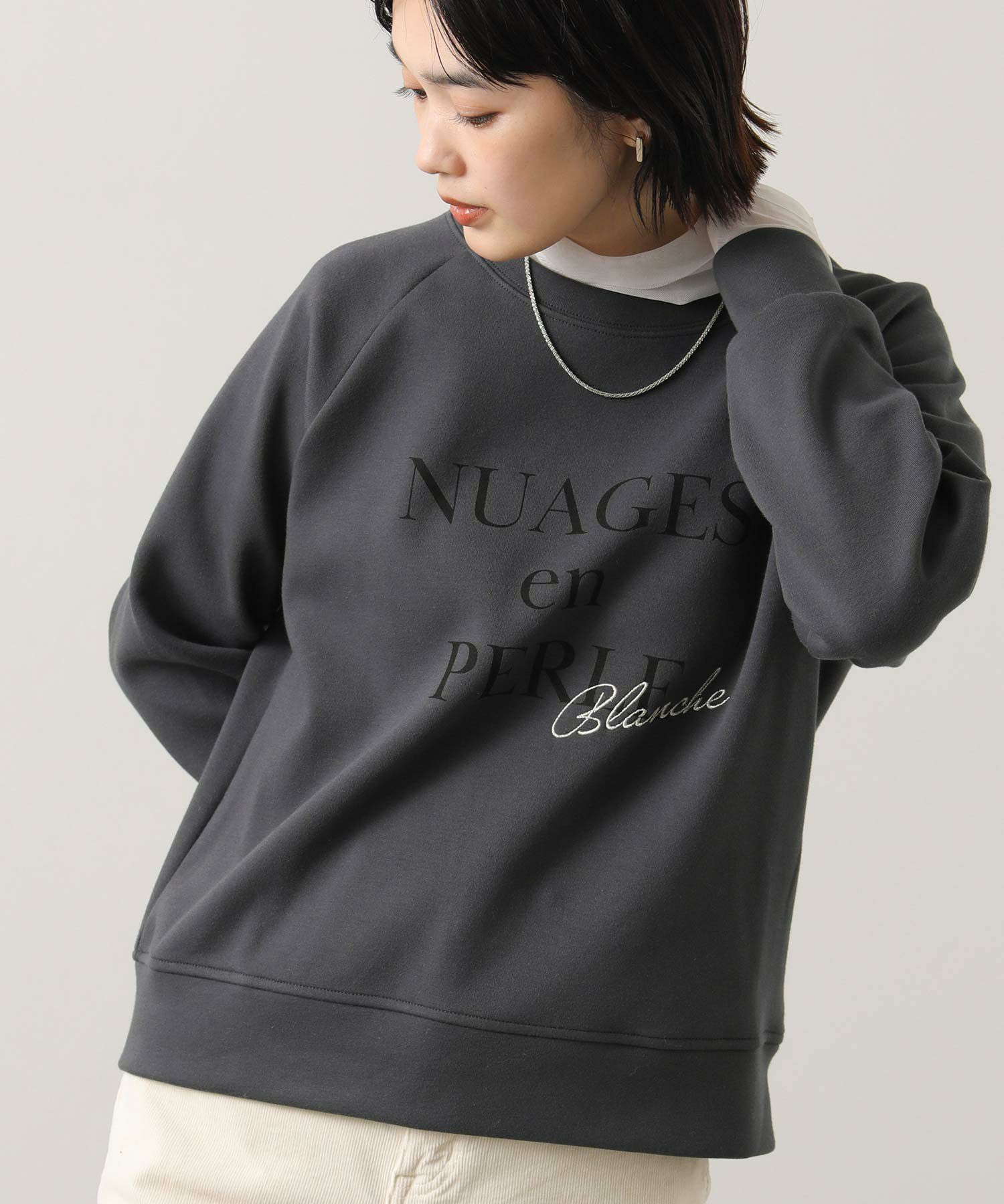 フロントには「NuagesenPerle(Perle(=真珠のような雲」ロゴとフランス語で“白”を意味するフランス語「Blanche」銀糸で刺繍。