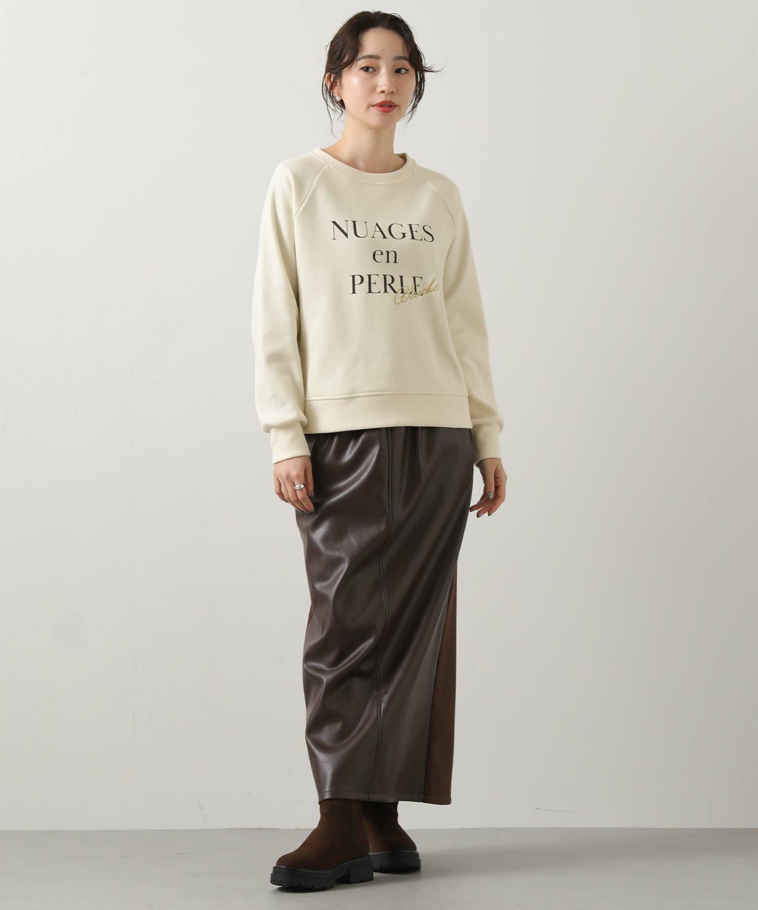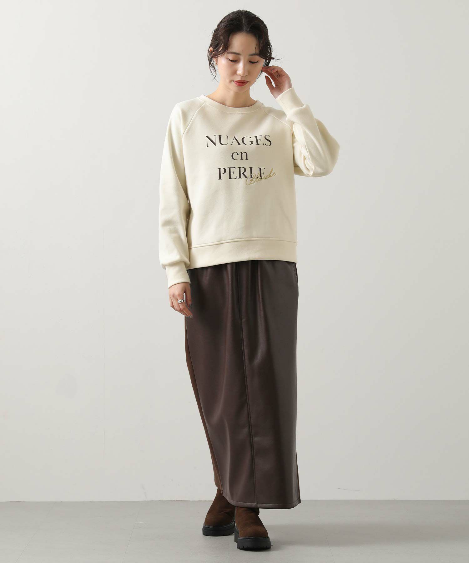 ゆるすぎない絶妙なサイズ感とコンパクトな着丈でスカートとも好相性。
