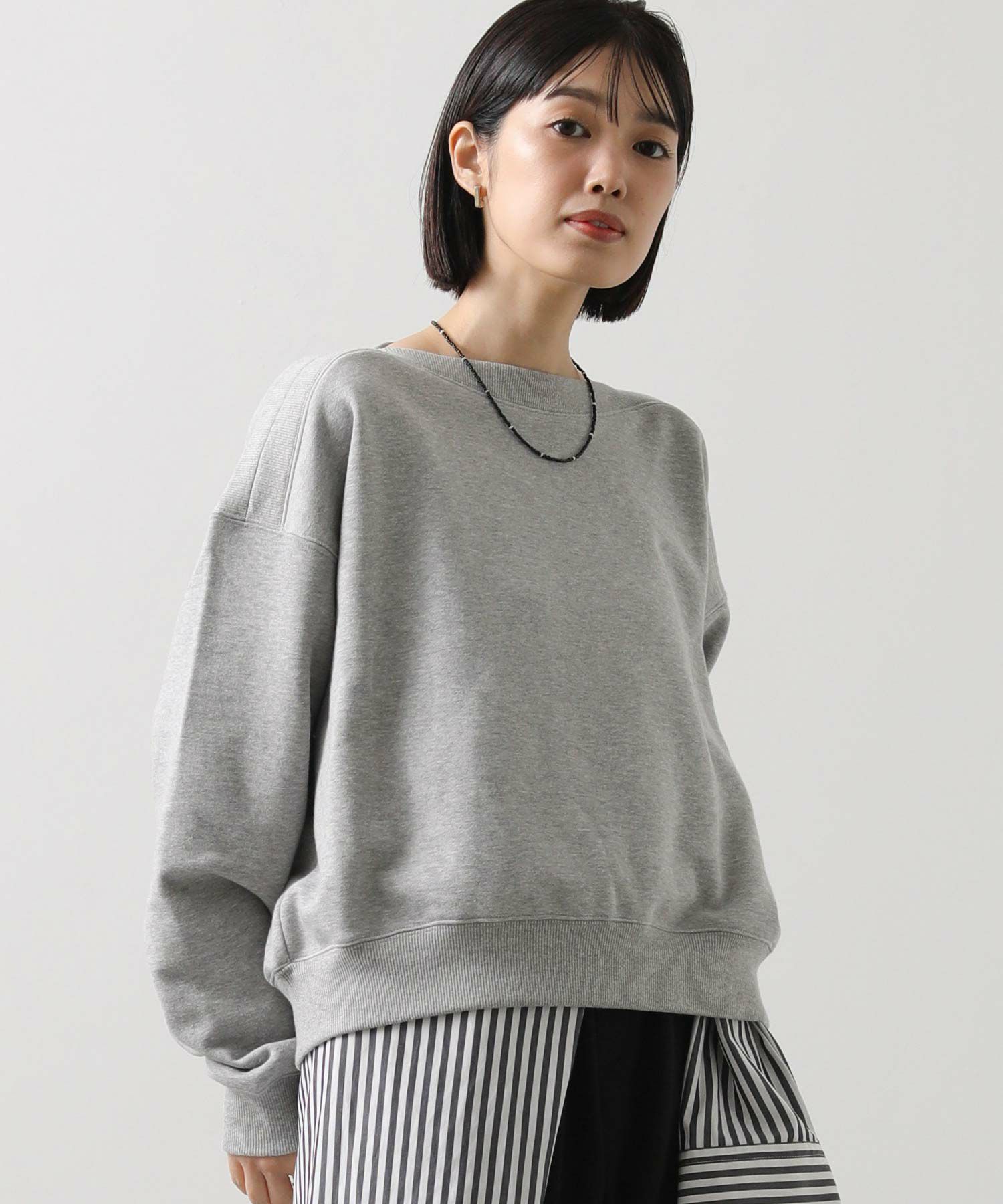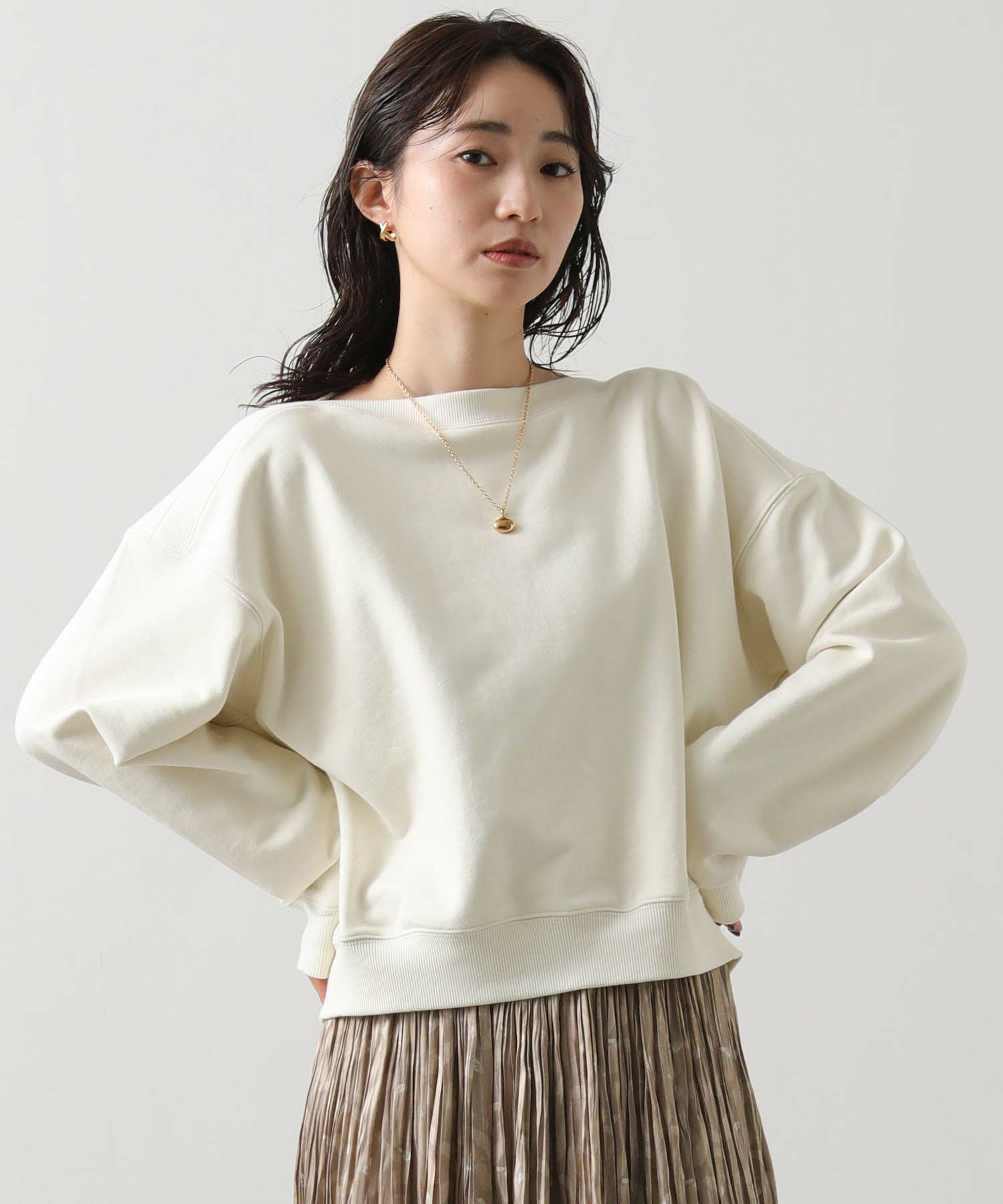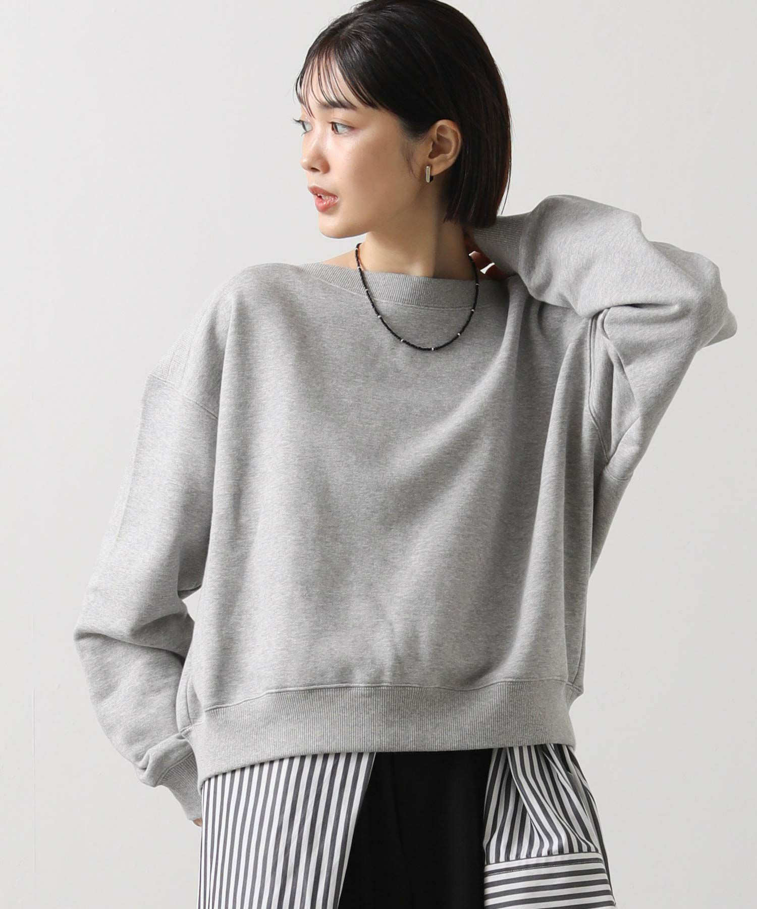 衿周りにリブ素材を用いたボートネックが印象的な裏毛スウェット。