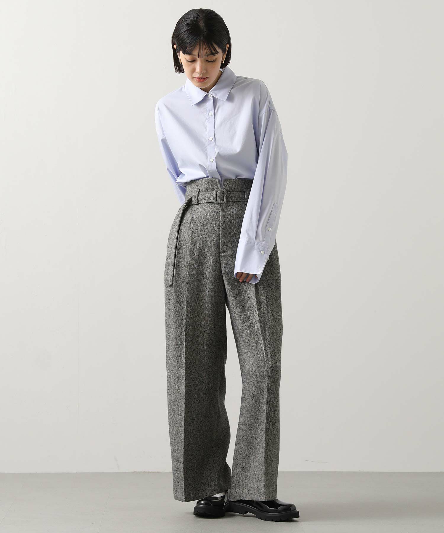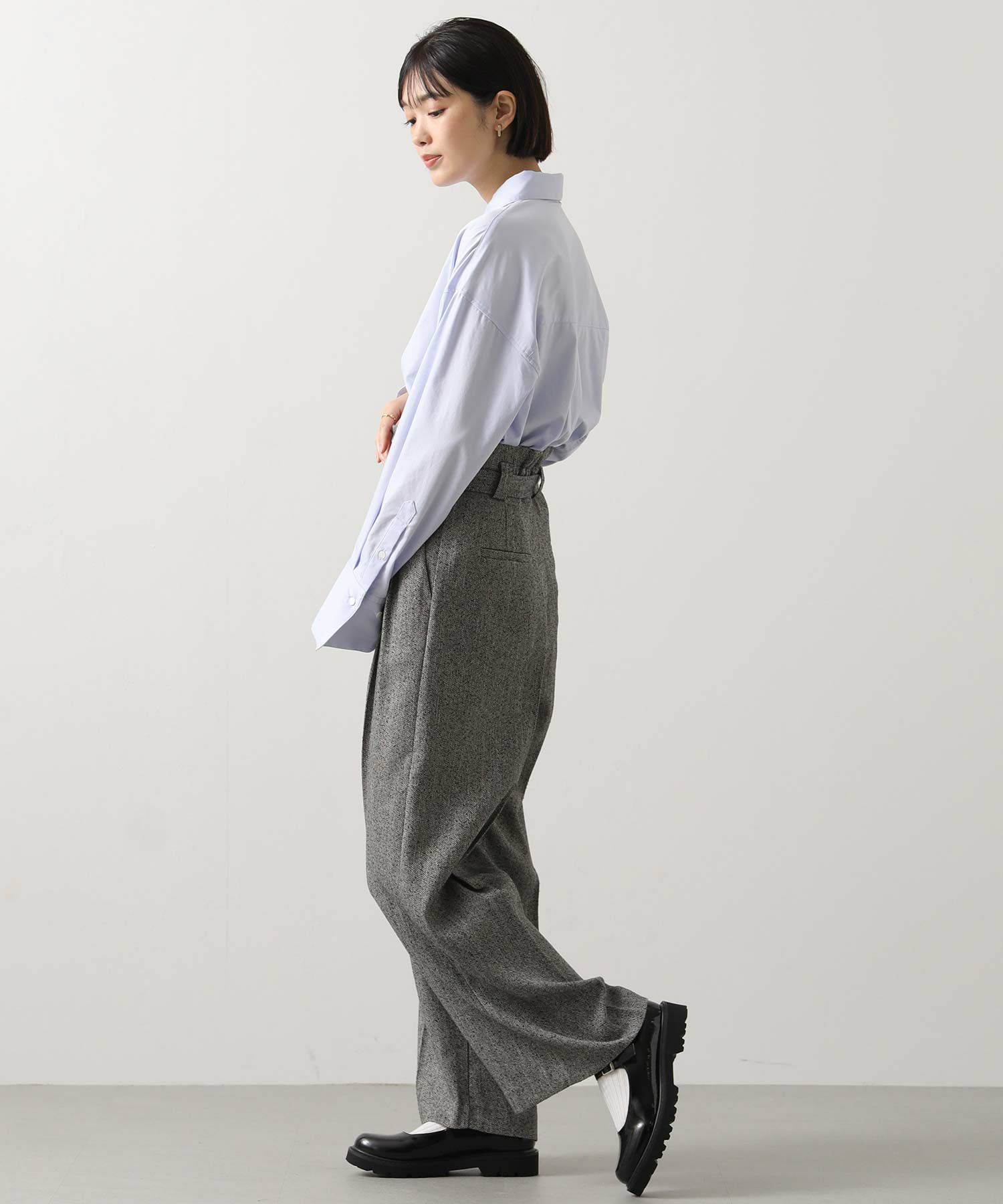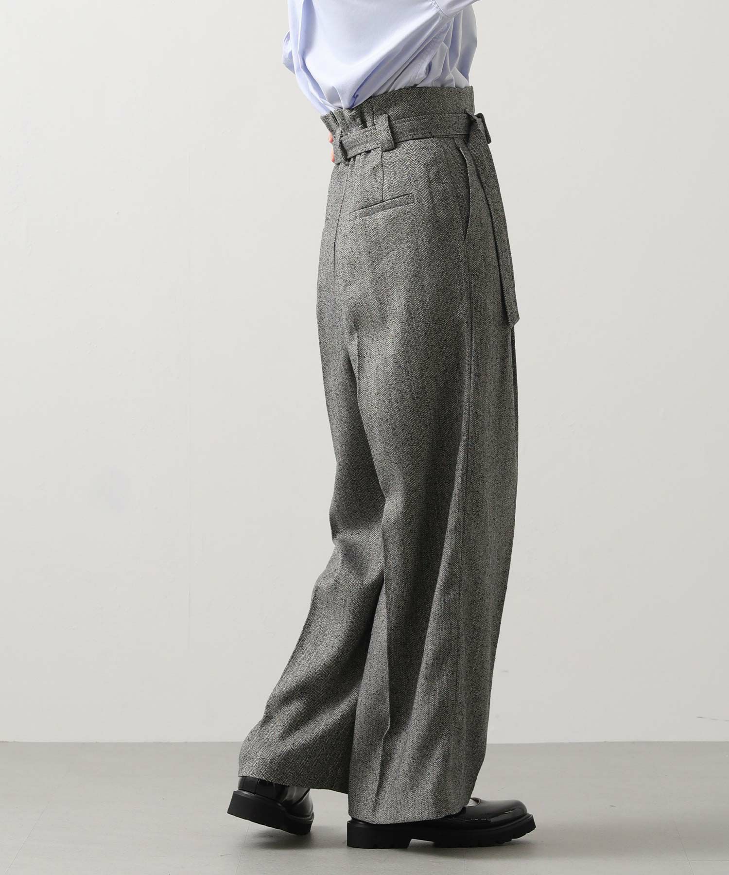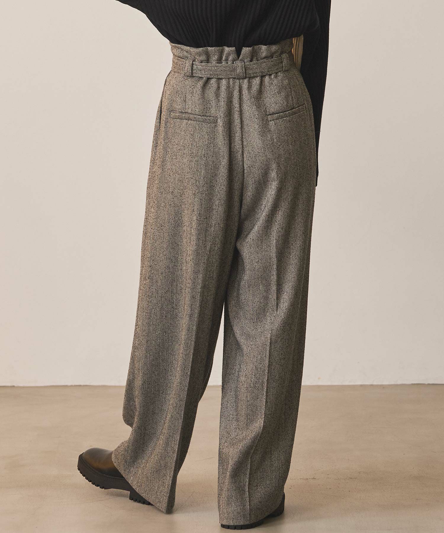 ハイウエストで脚長効果があり、フロントのタックとセンタープレスが美しいシルエットを強調、スッキリとしたラインを演出。