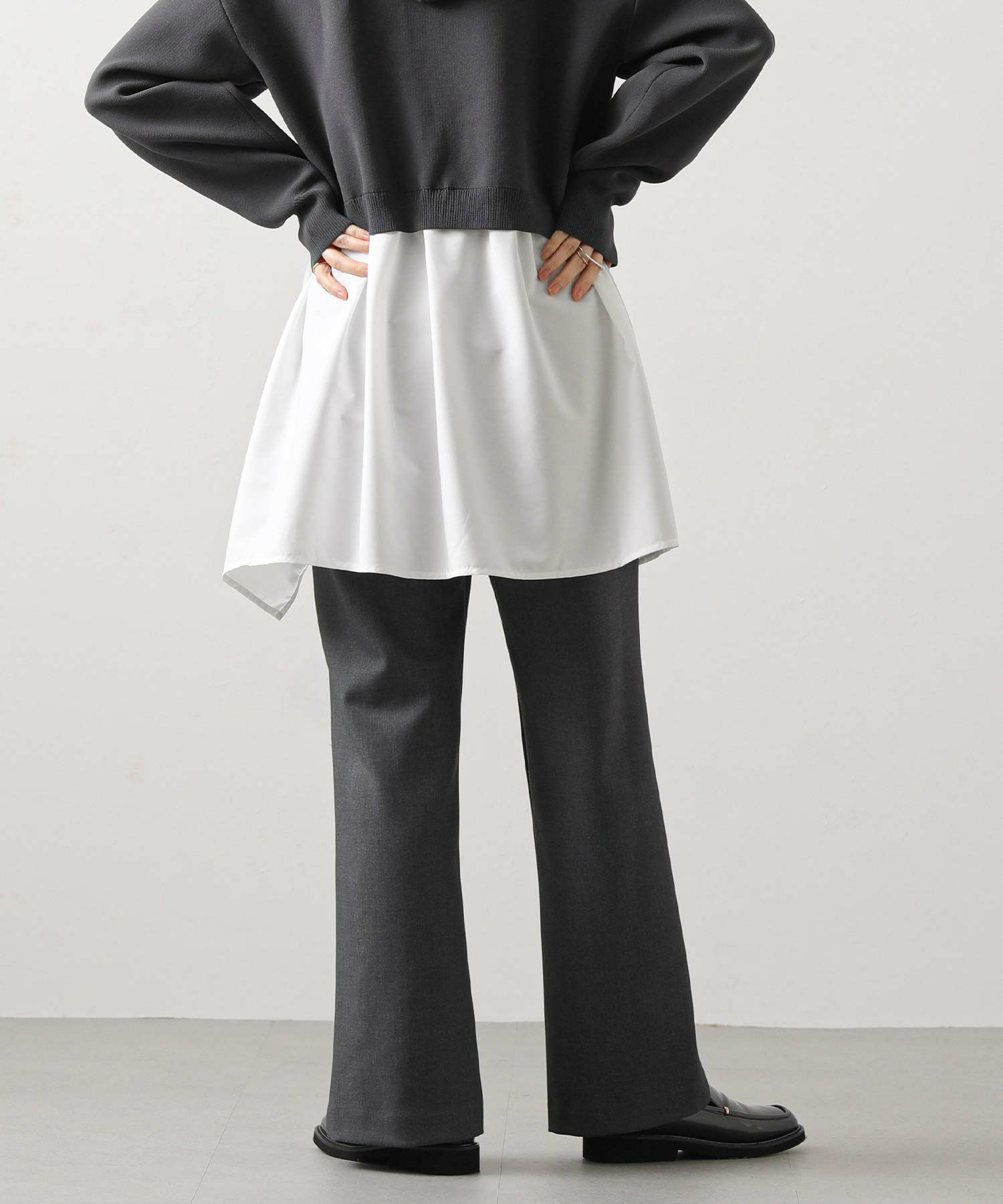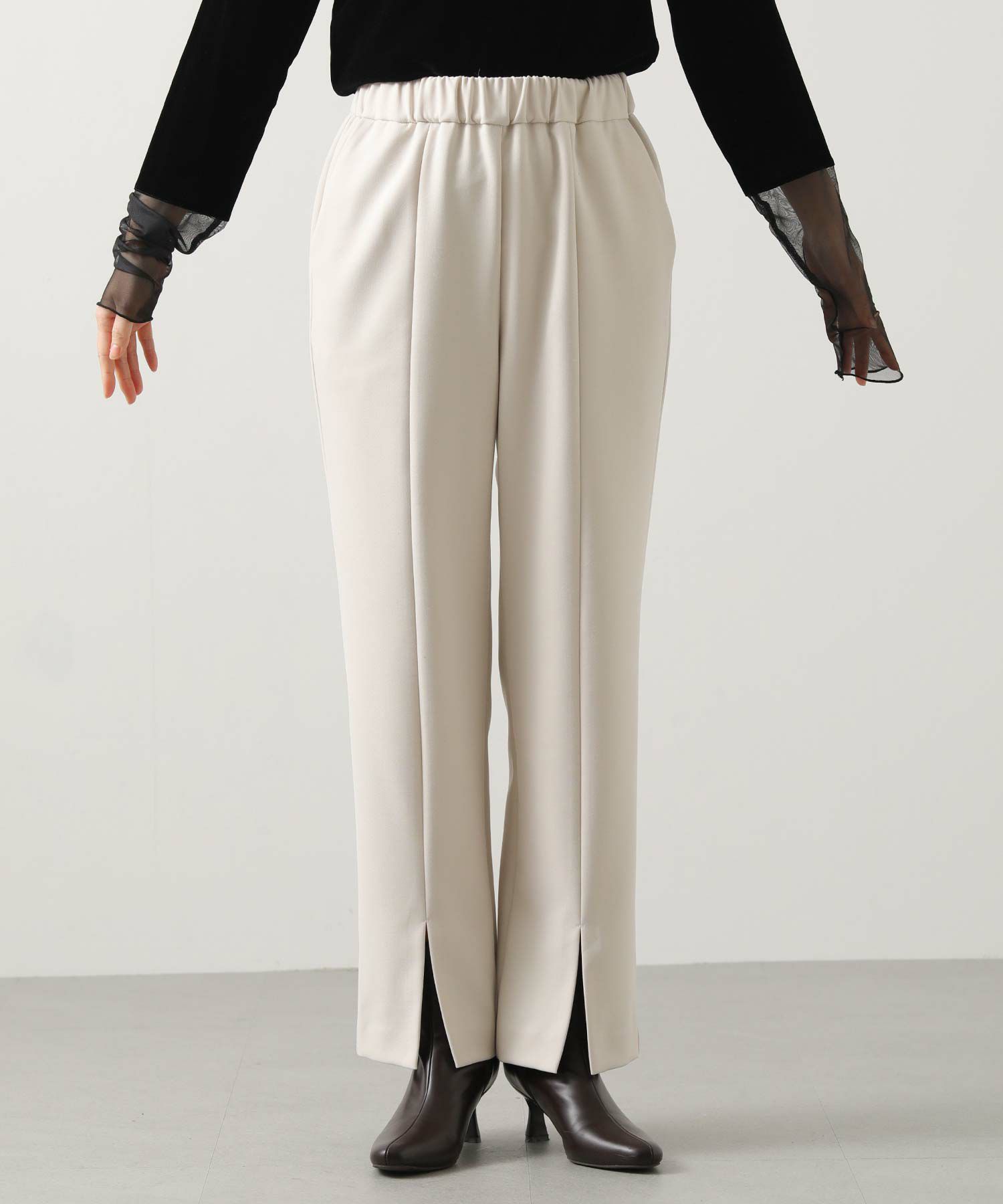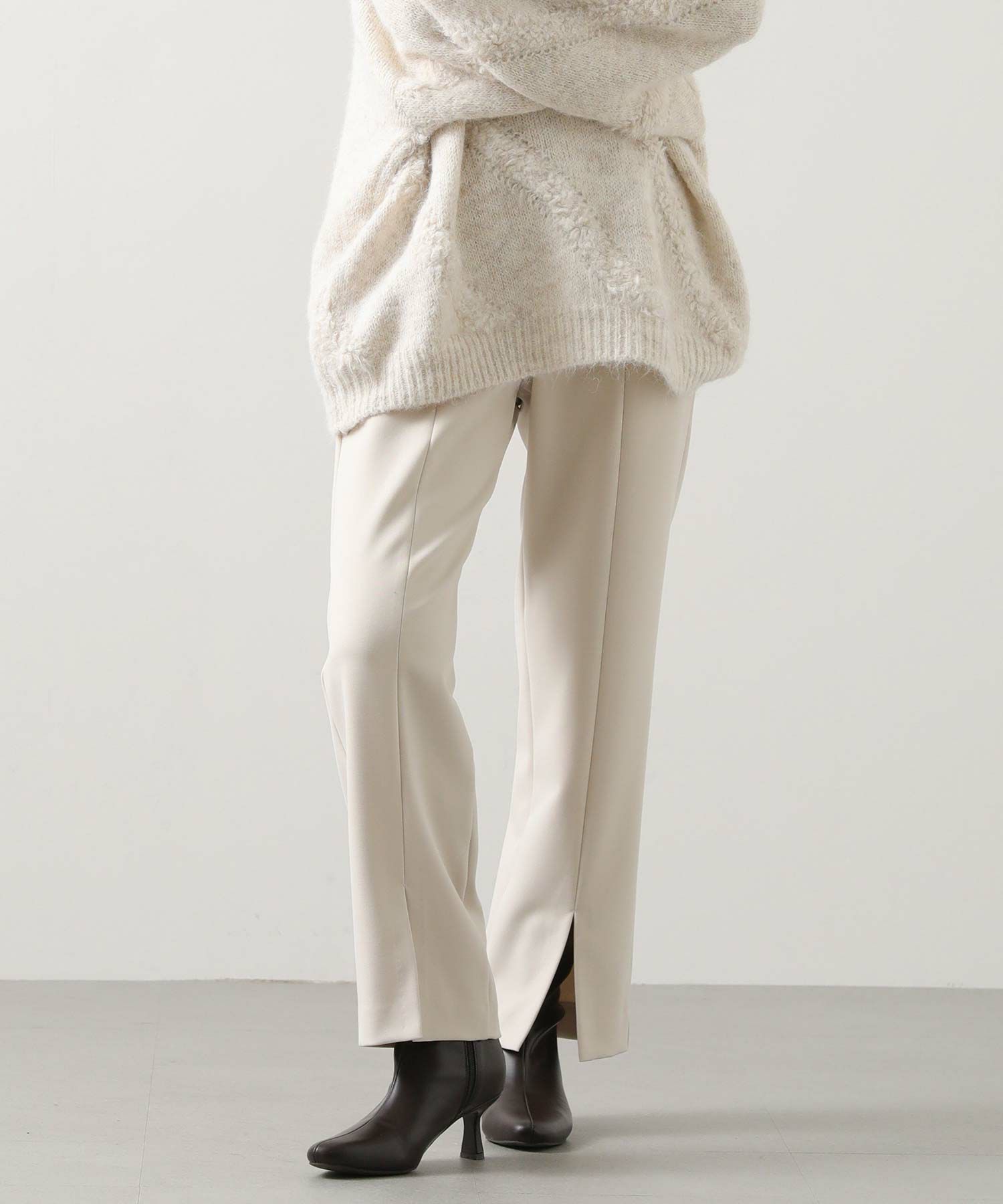 フロントにスリットが入ったスッキリ見えパンツ。