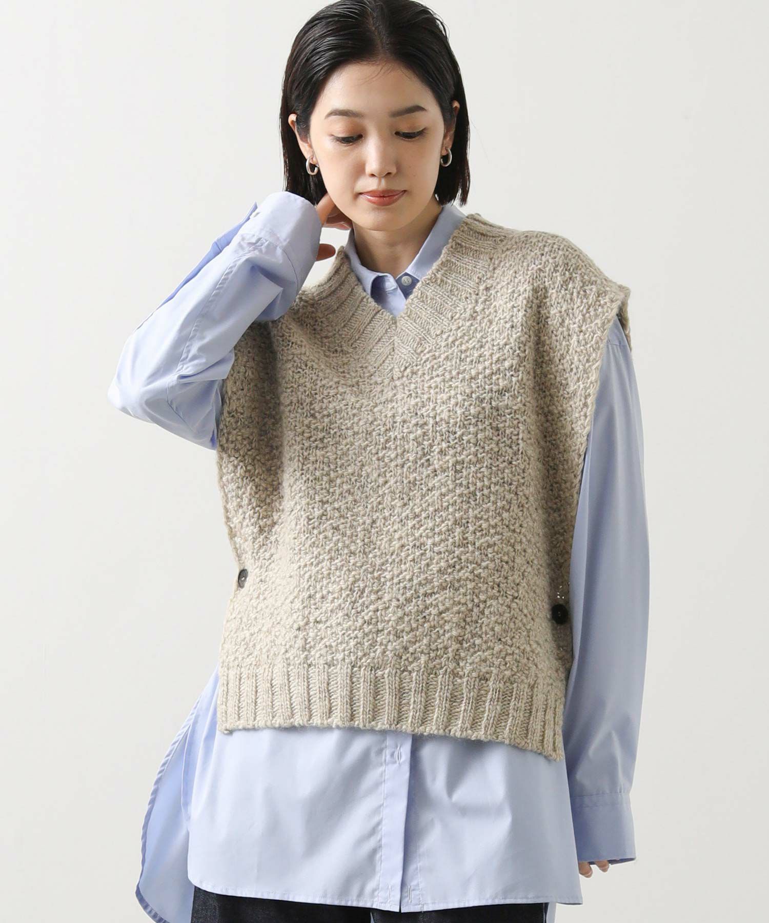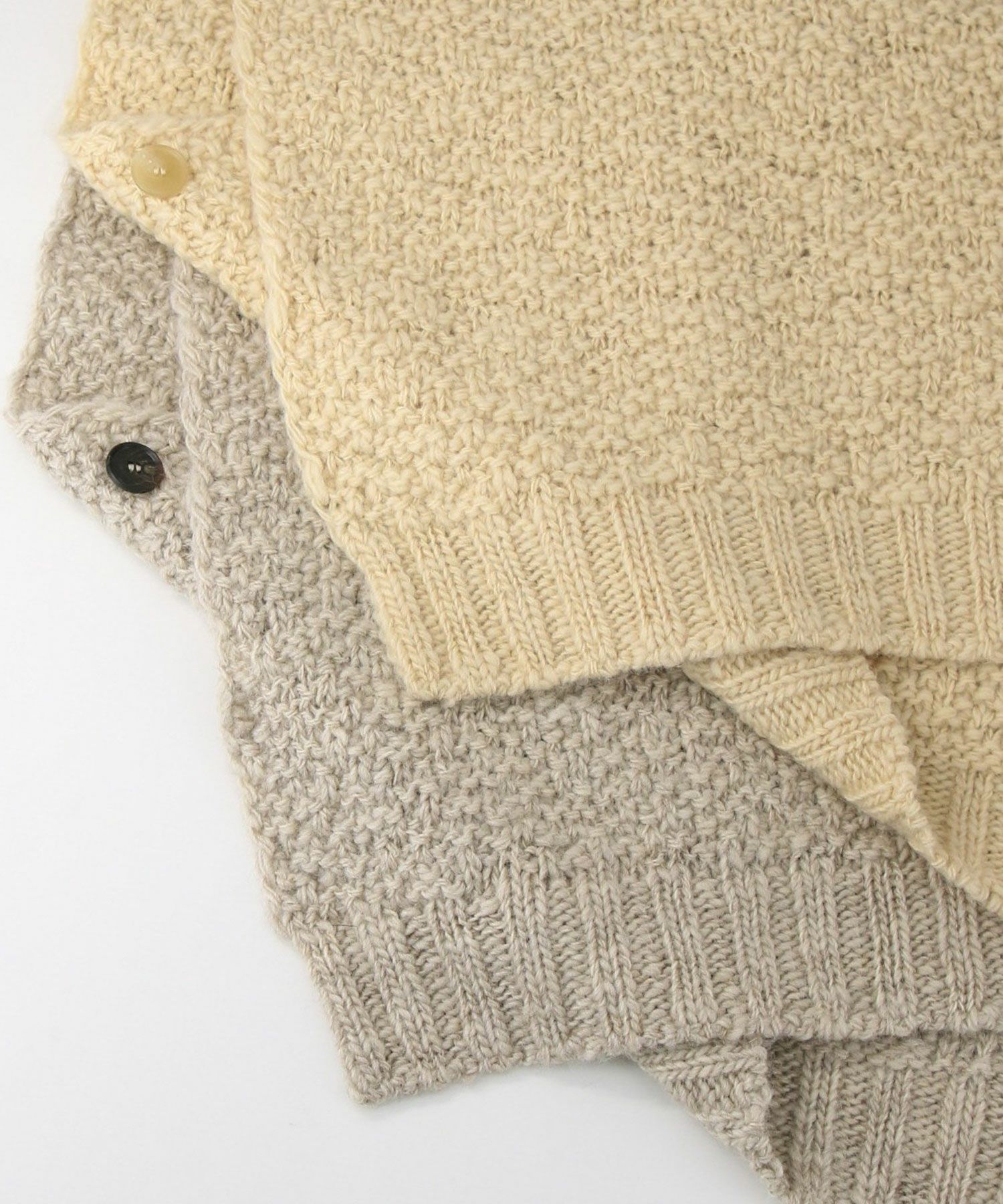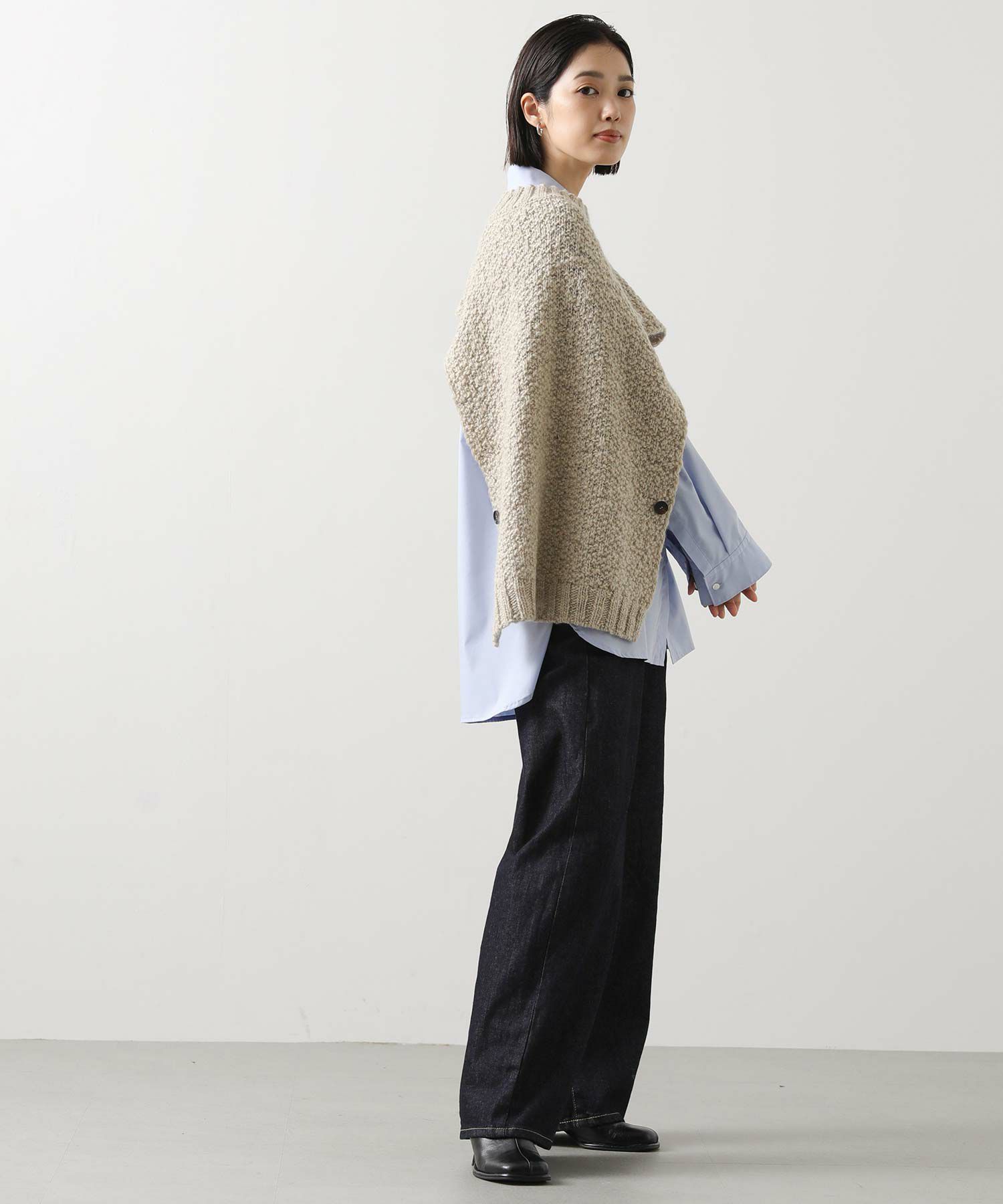 脇のボタンを止めてVネックショートベストに、ボタンを開けて肩部分をずらしてボートネックショートポンチョ風にアレンジ出来るデザインニット。