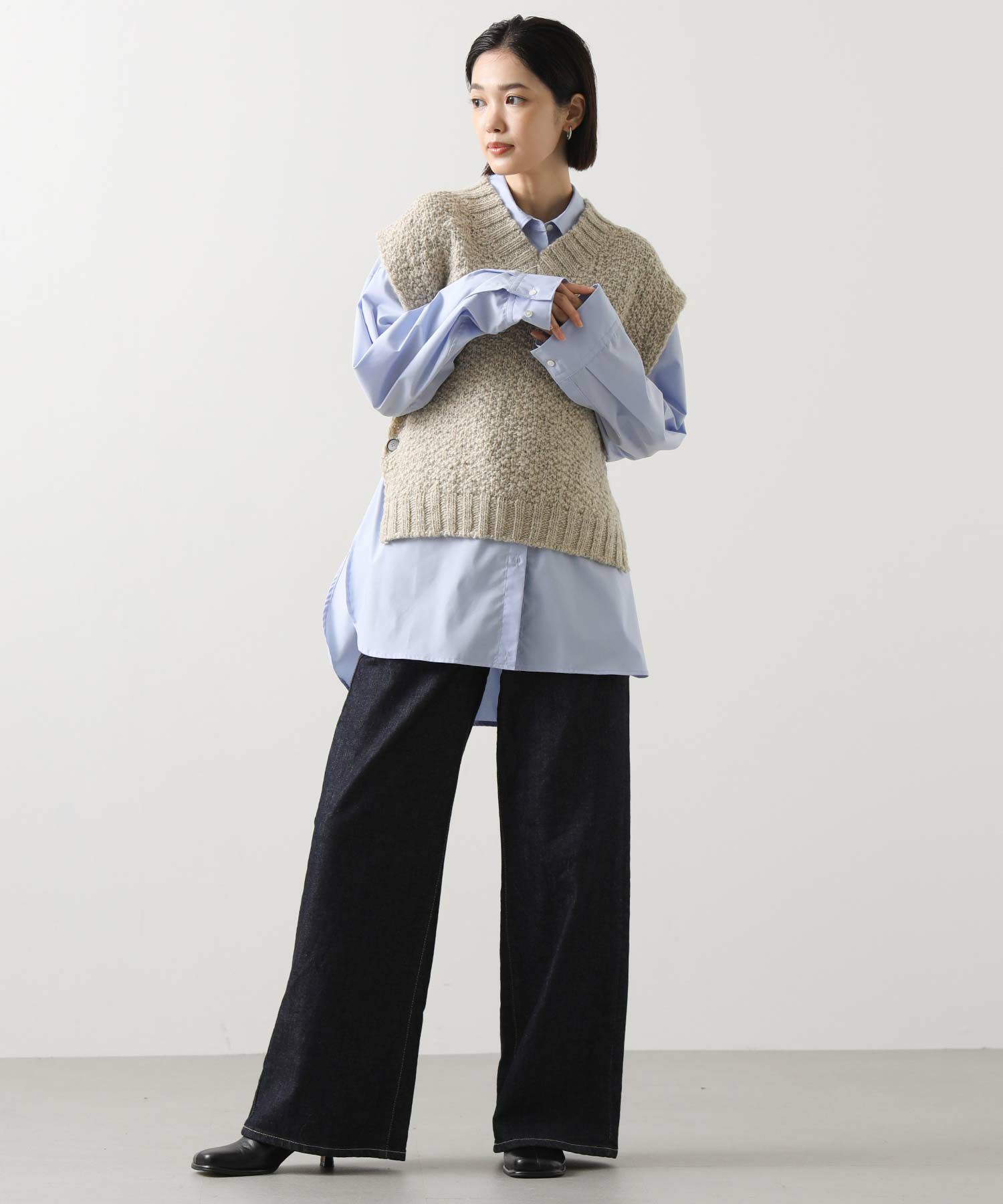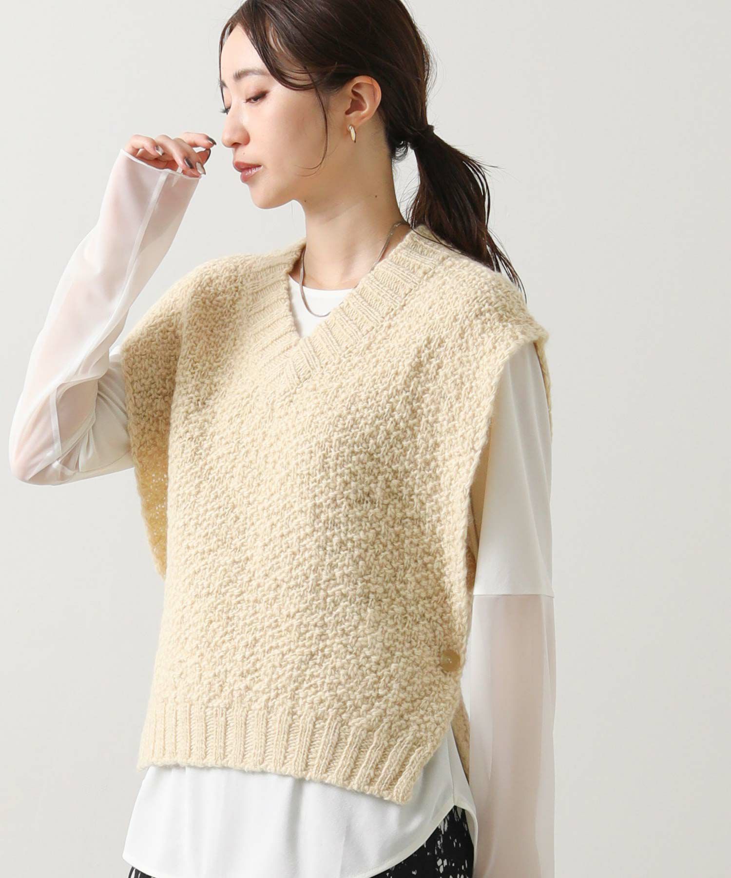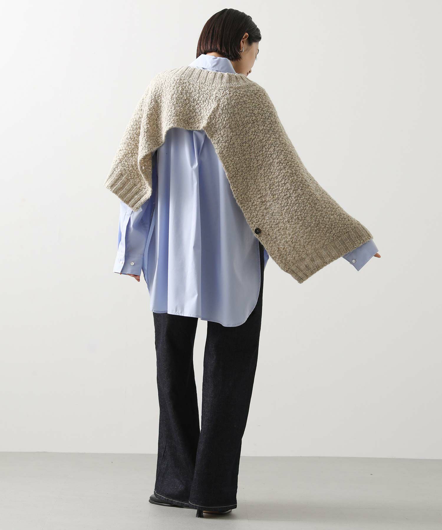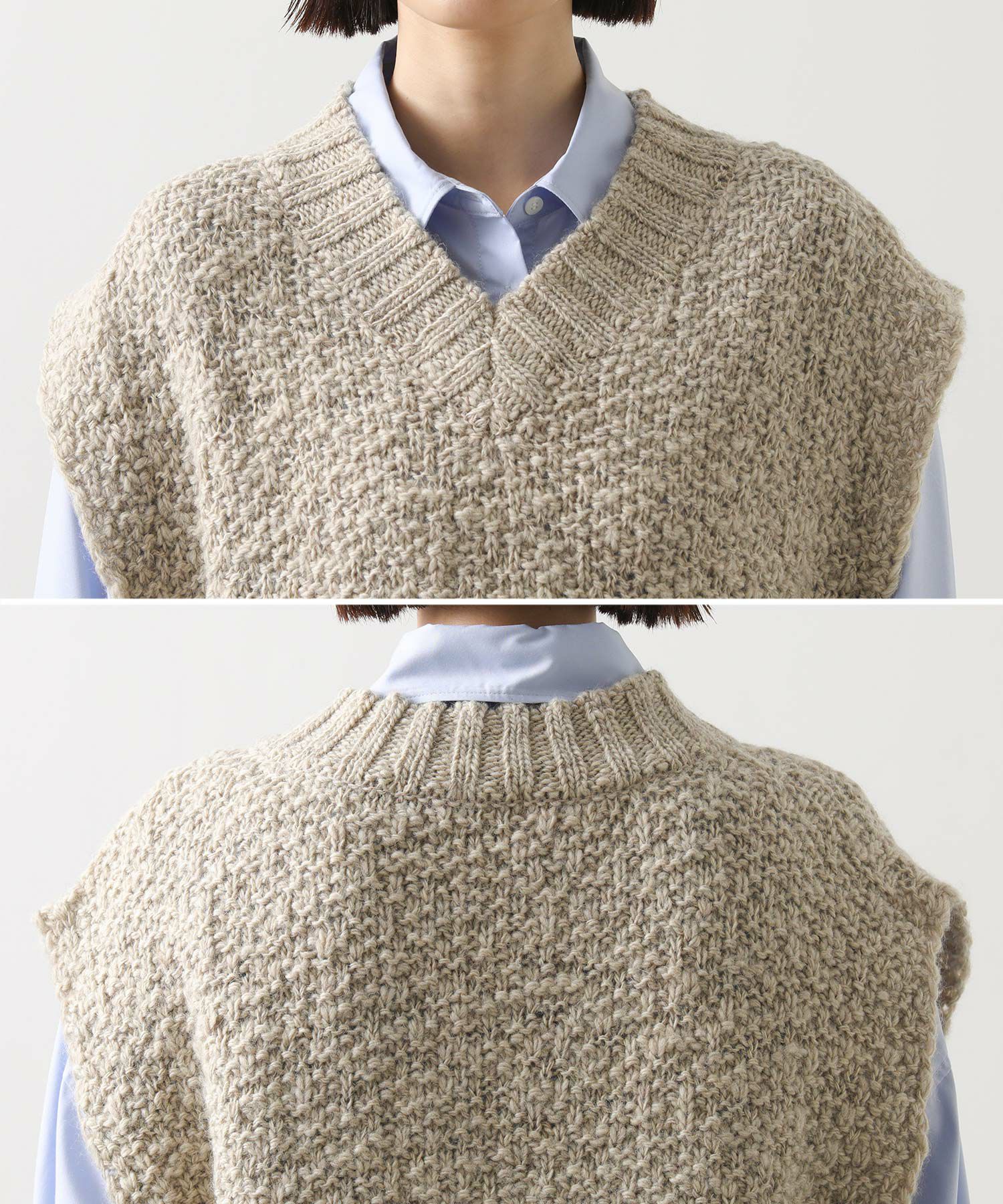 脇のボタンを止めてVネックショートベストに、ボタンを開けて肩部分をずらしてボートネックショートポンチョ風にアレンジ出来るデザインニット。