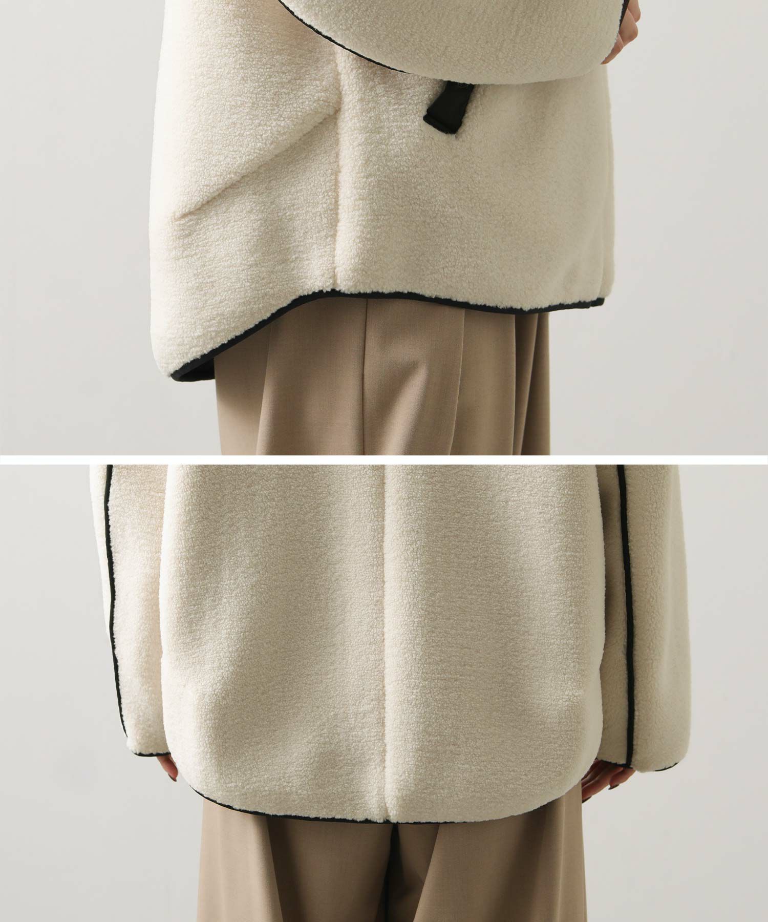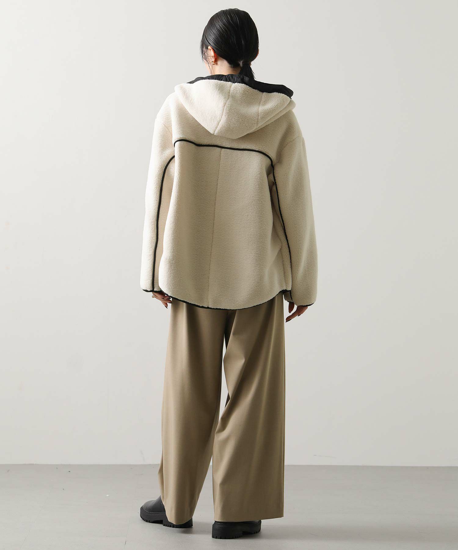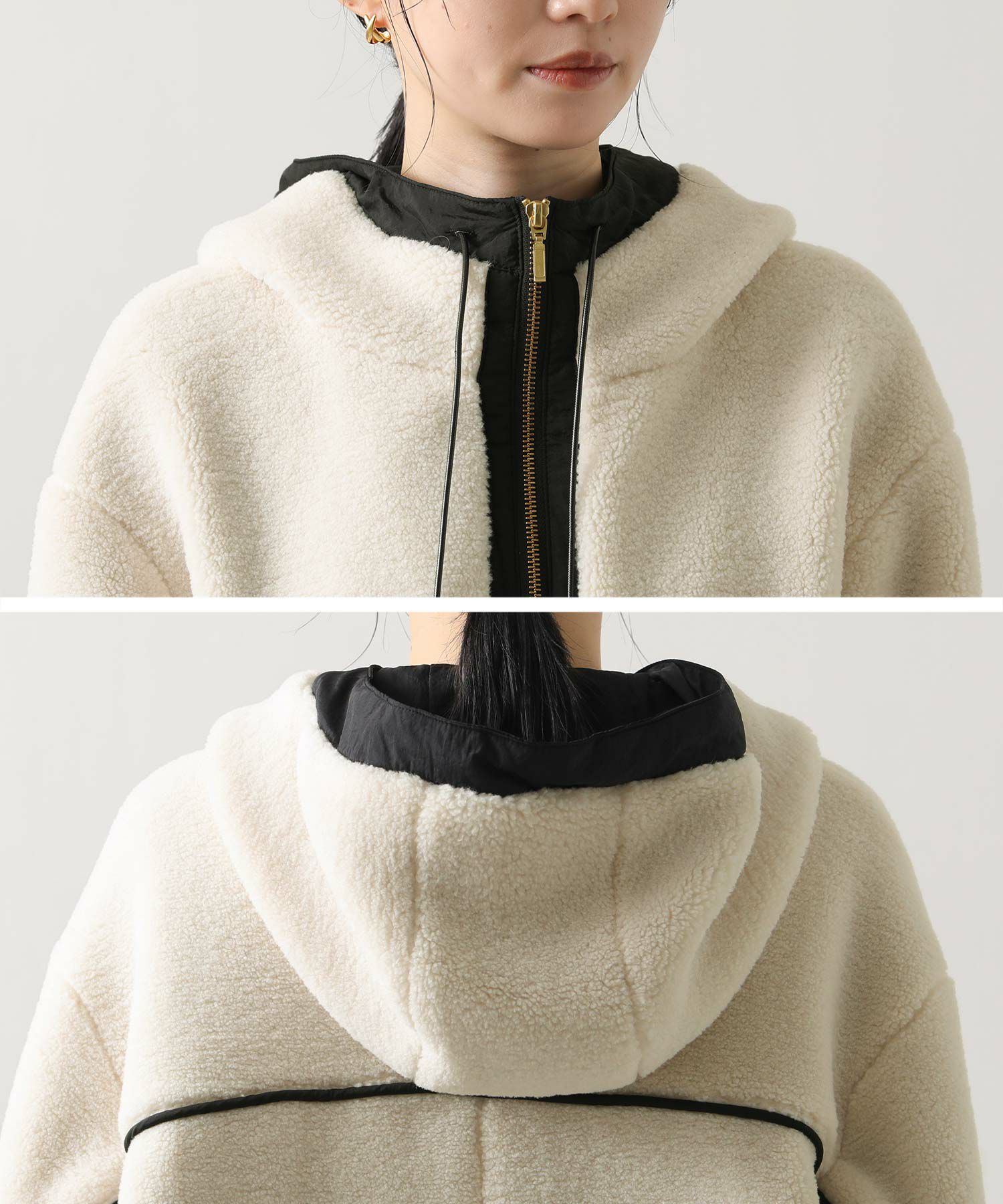 着た時に大きく見えないシルエットと、小顔に見せてくれる絶妙なフードデザイン。