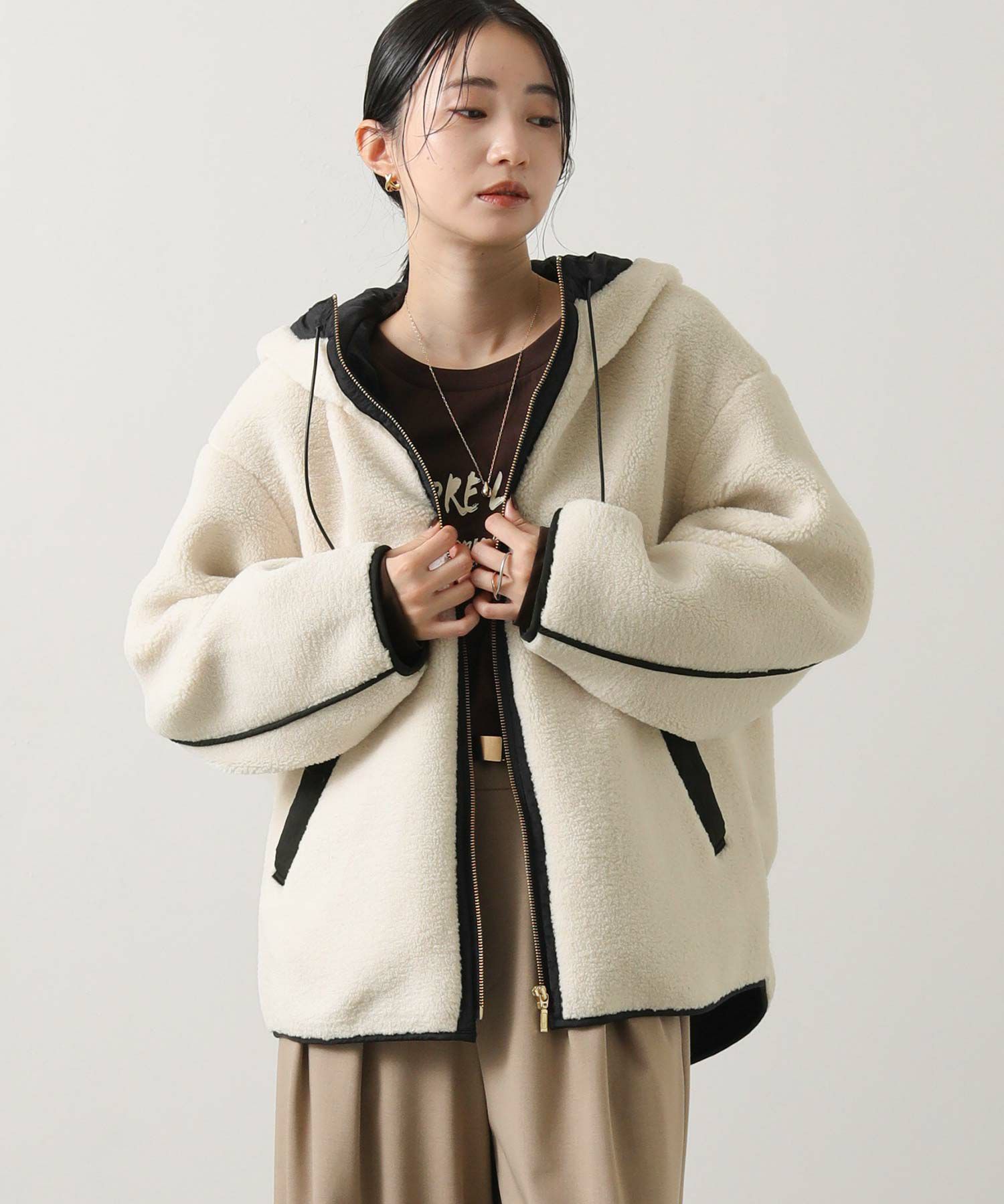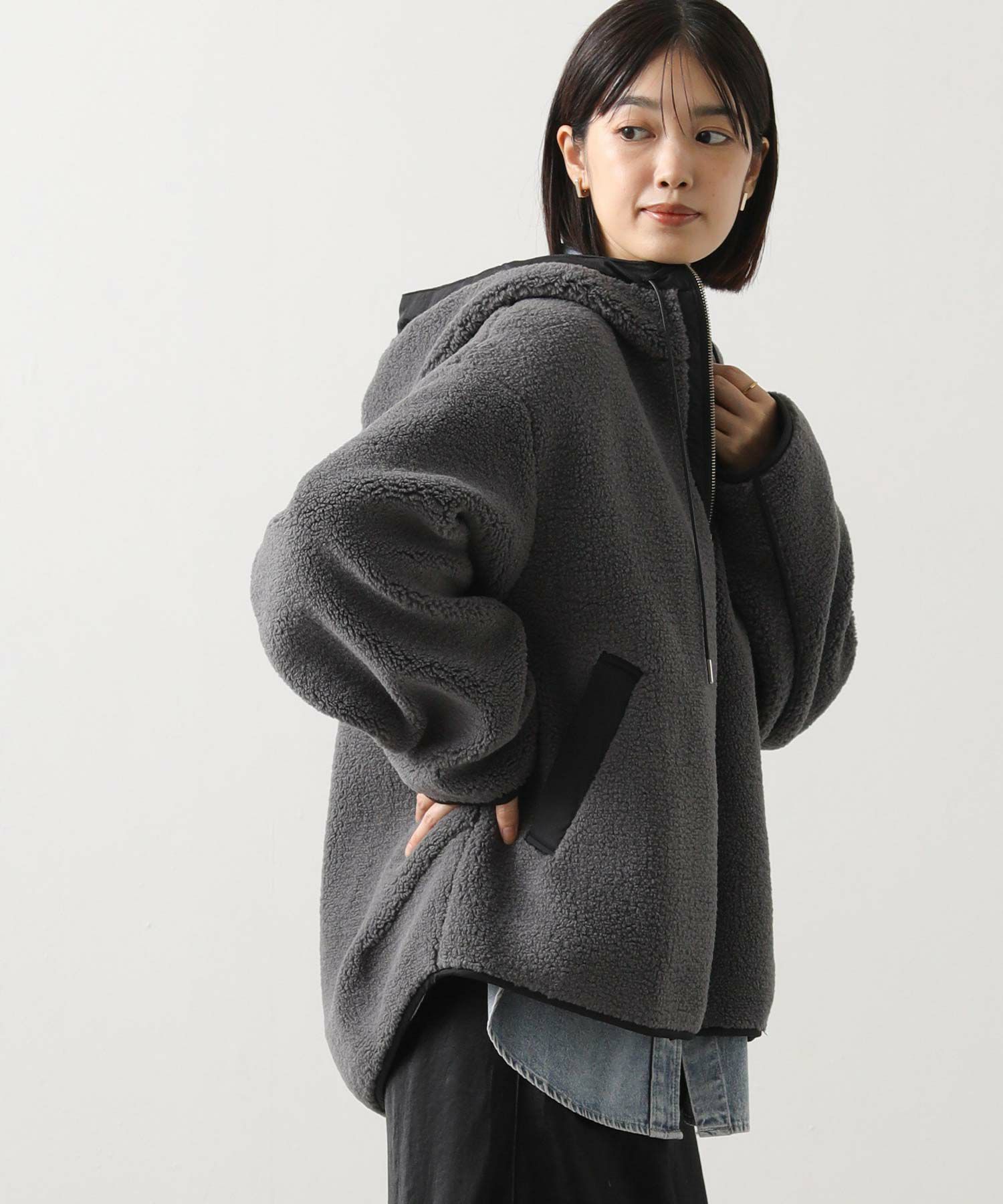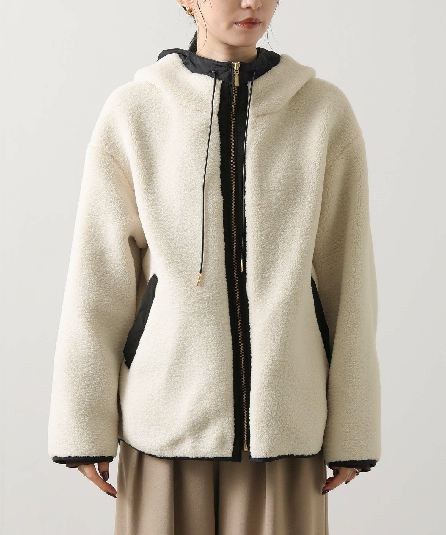 カジュアルすぎず、女性らしい雰囲気のフーディーボアブルゾン。
