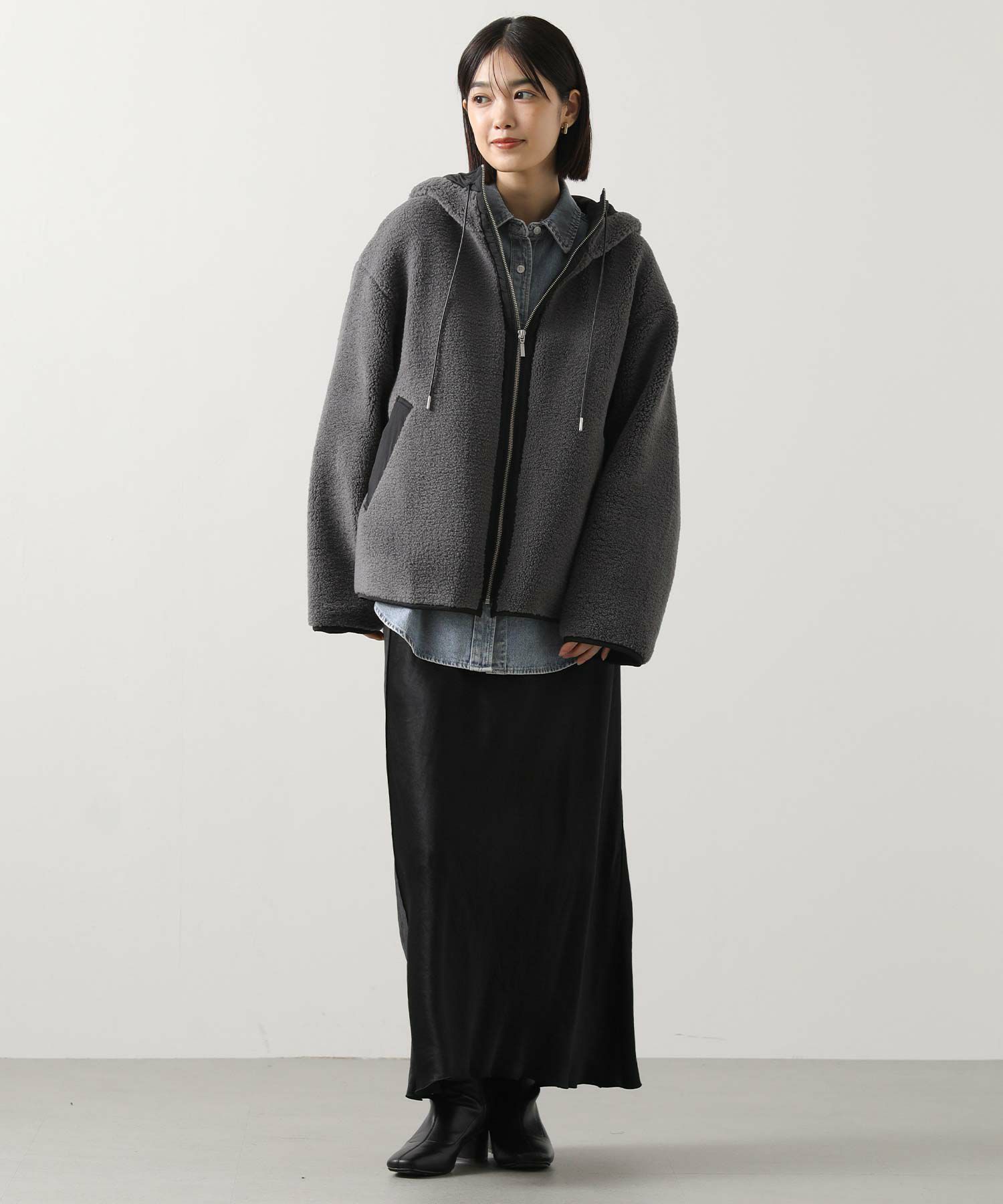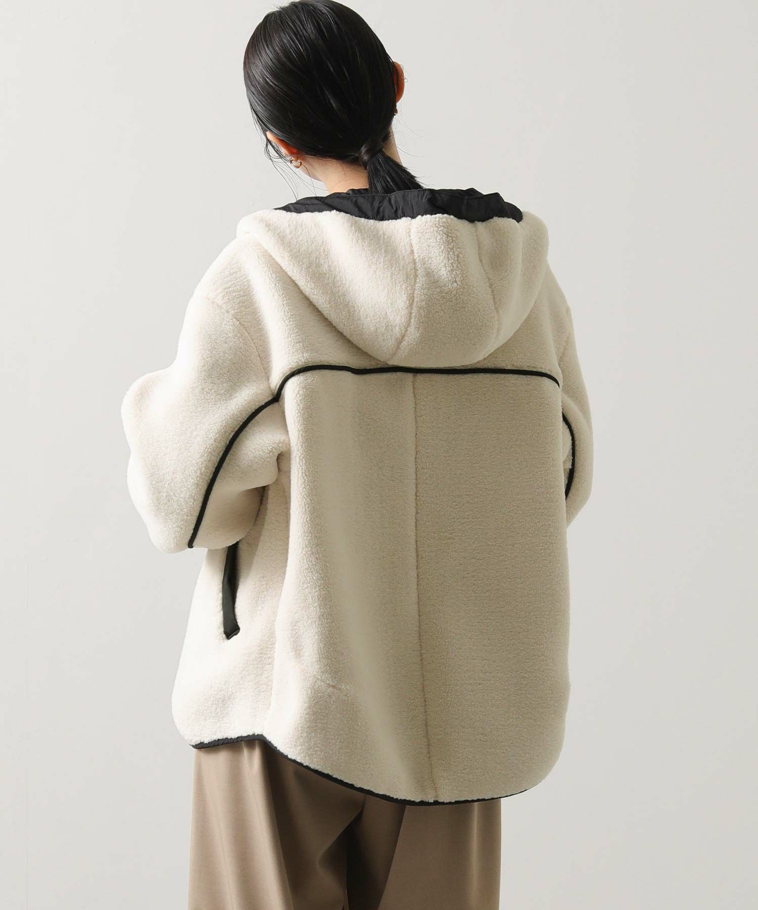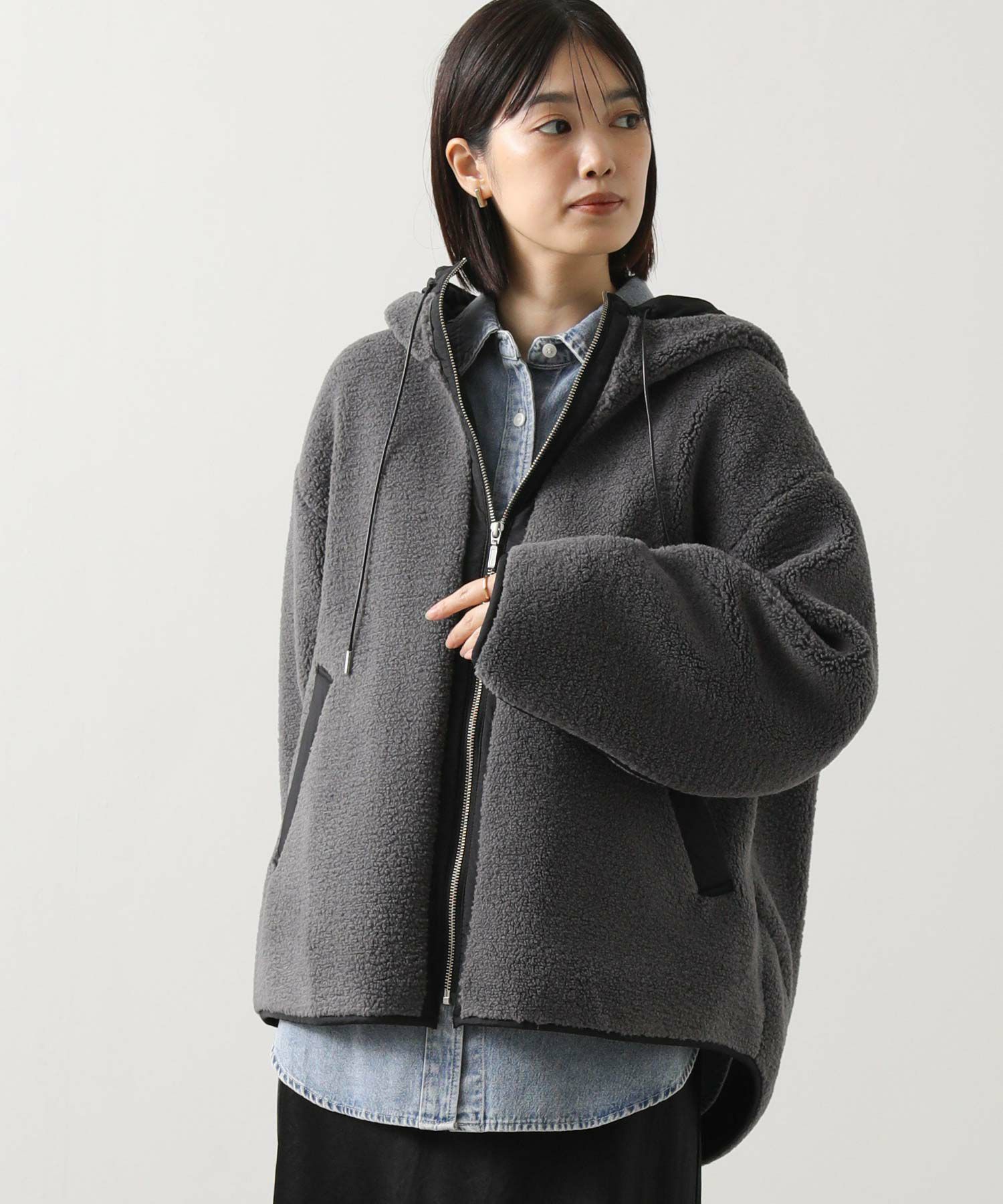 カジュアルすぎず、女性らしい雰囲気のフーディーボアブルゾン。