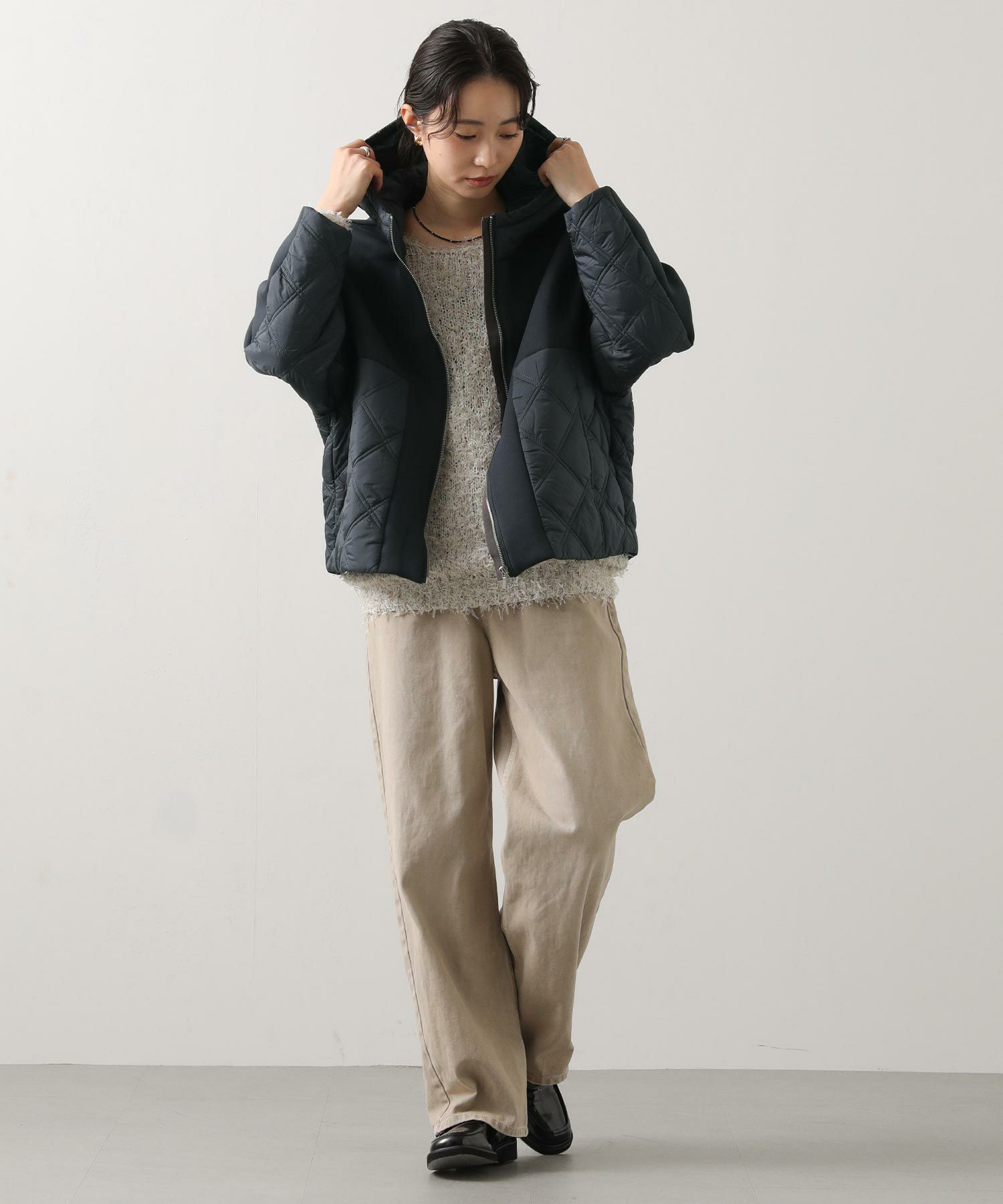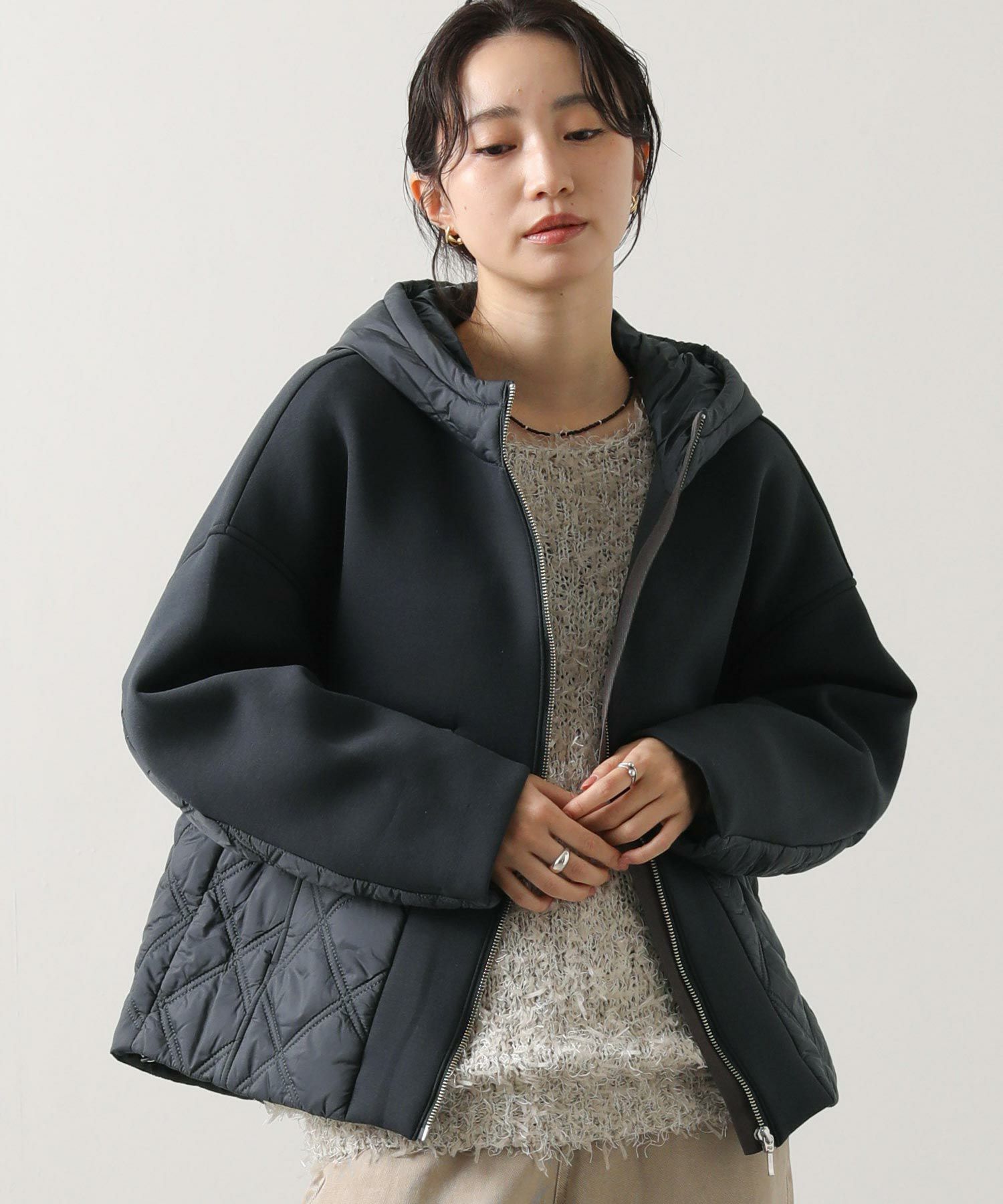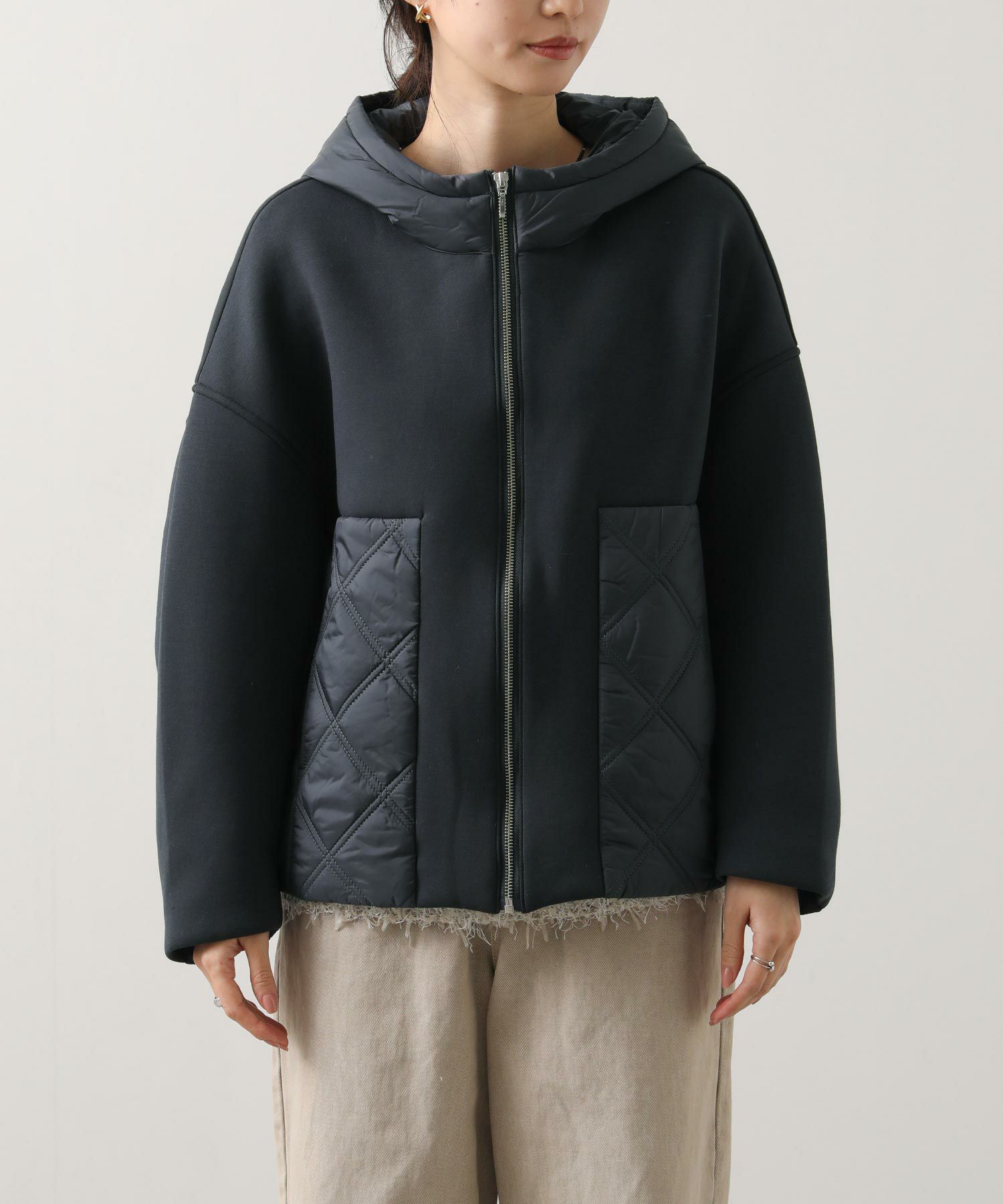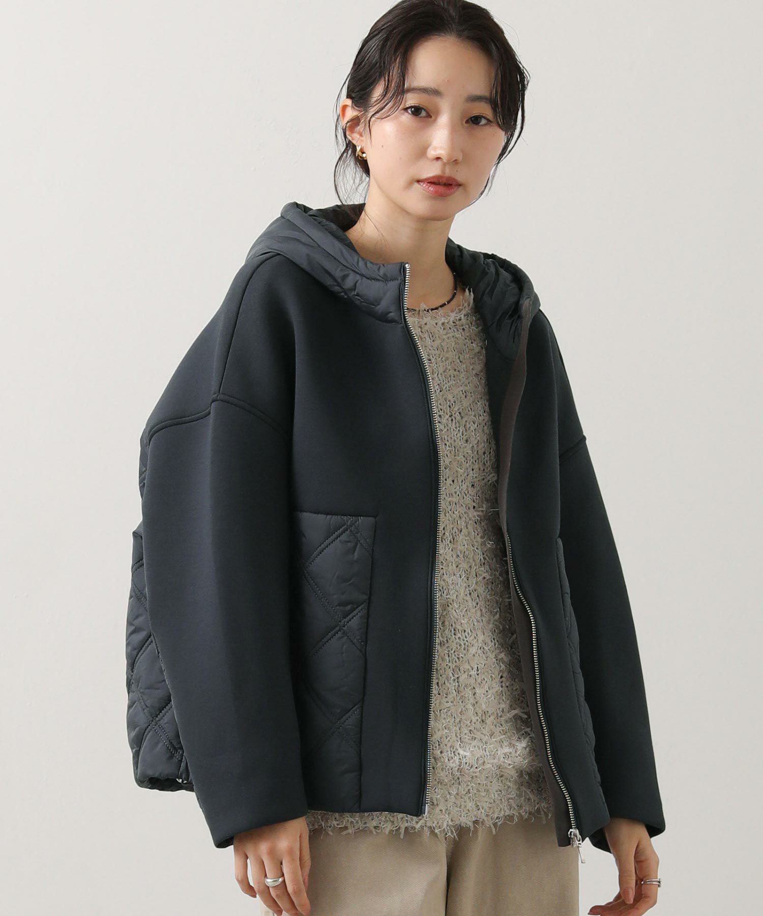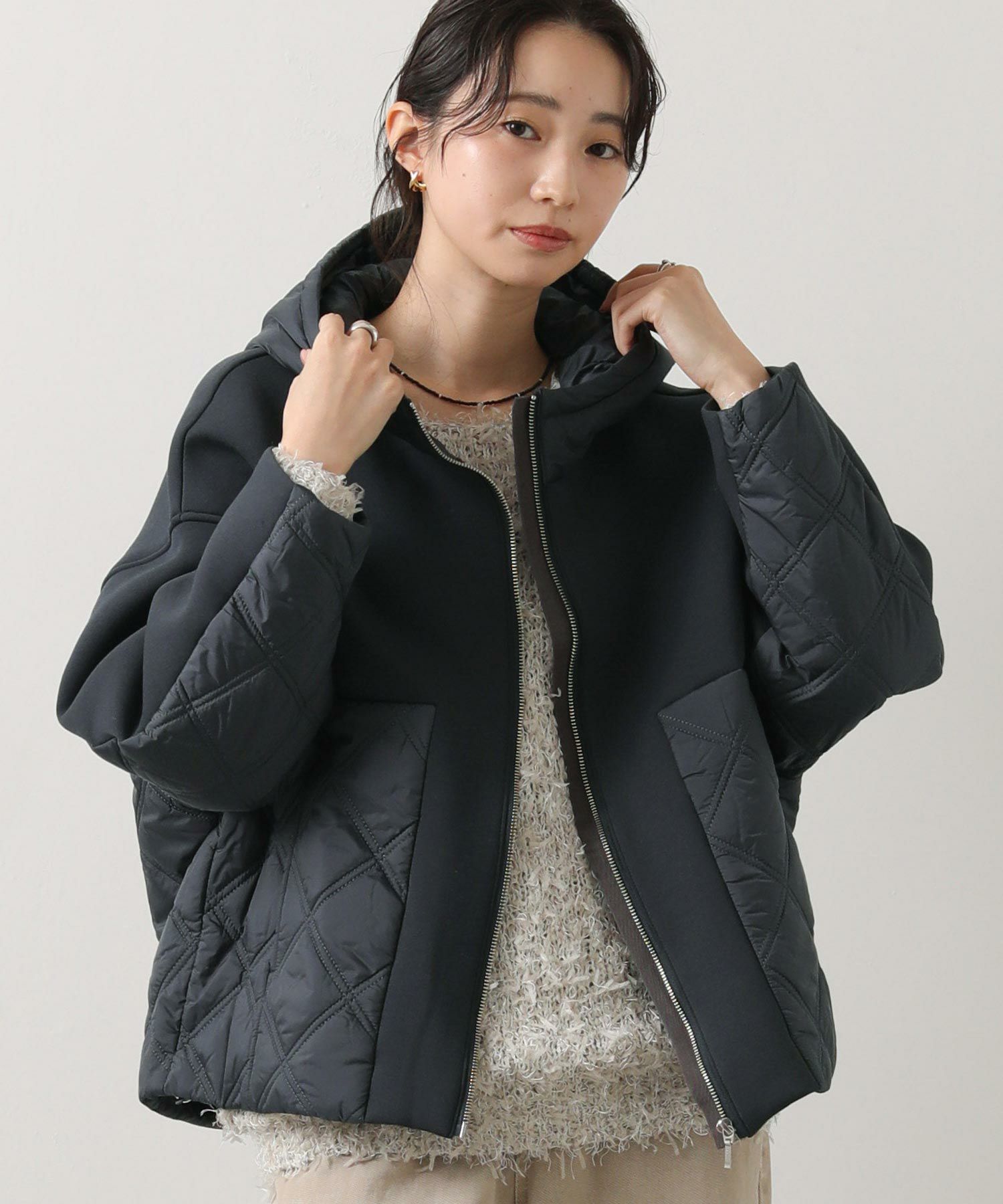 柔らかいダンボールニットにキルティング生地を組み合わせたフード付きコート。