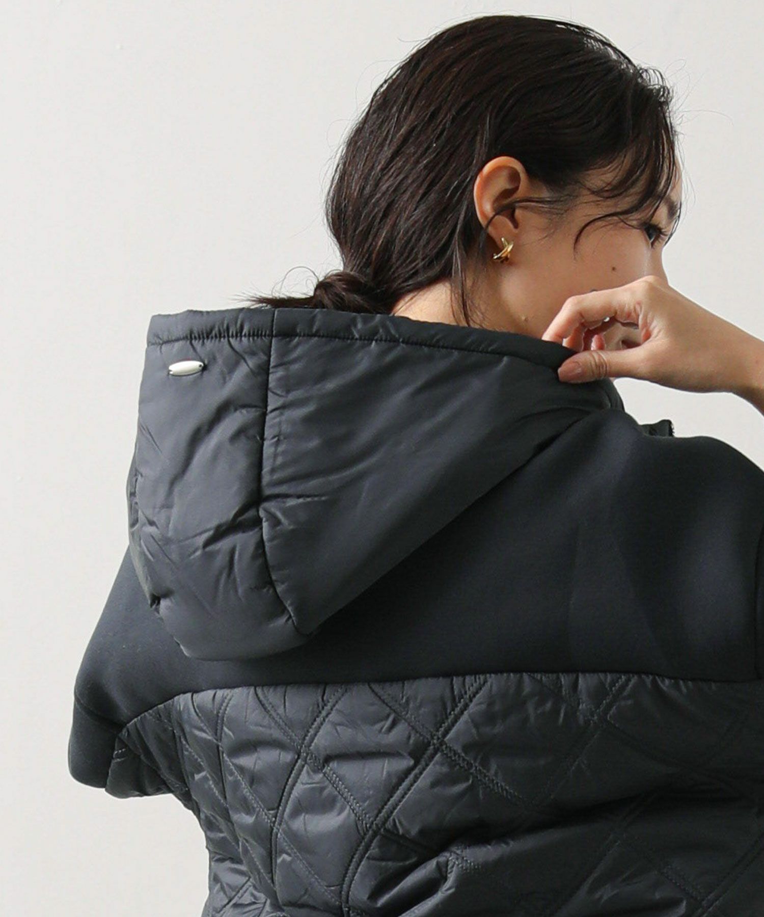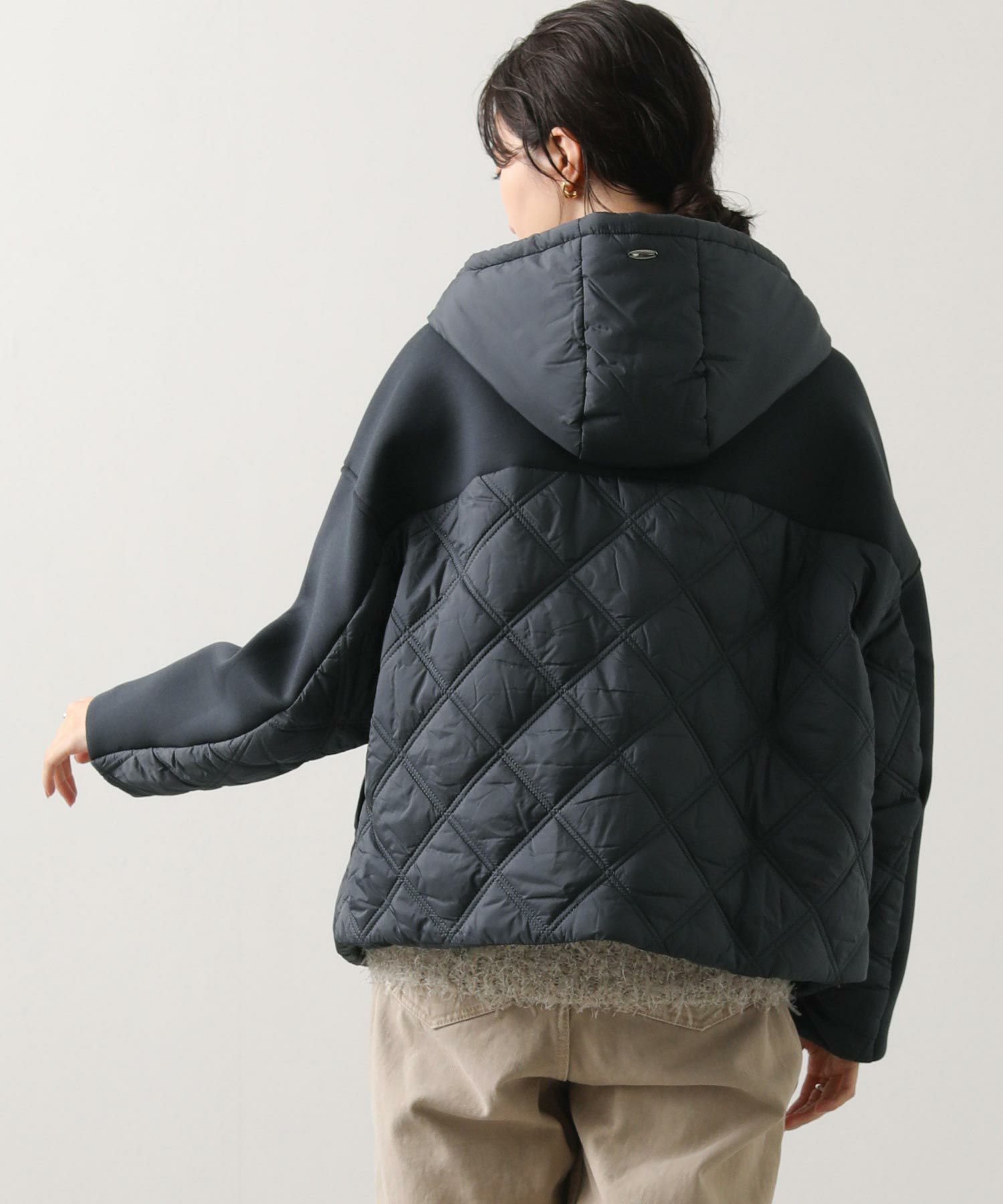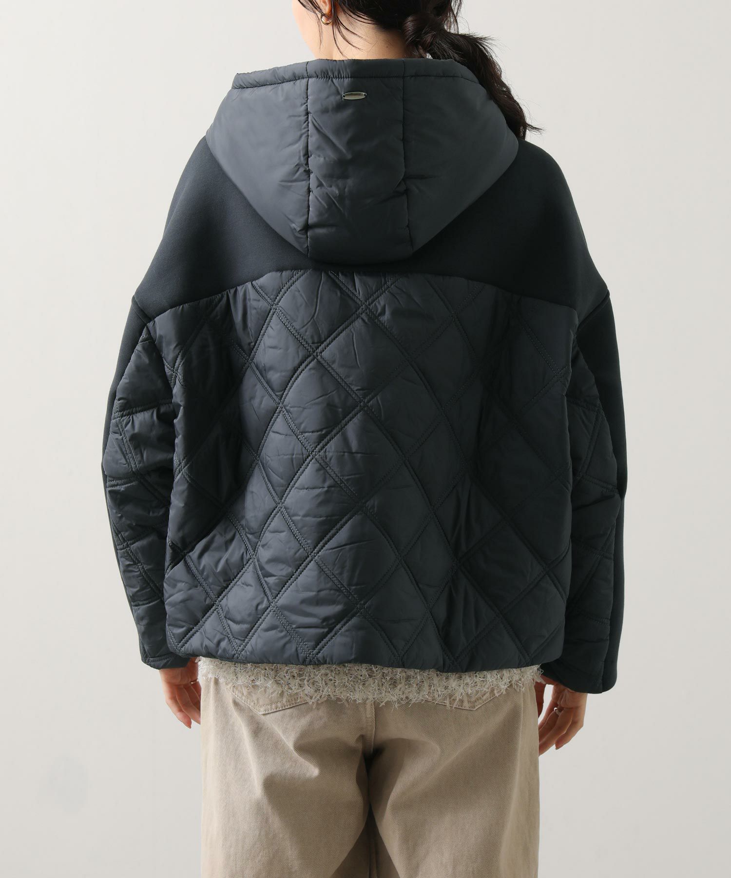 サイドや後身頃、フードのキルティング切替がアクセントに。