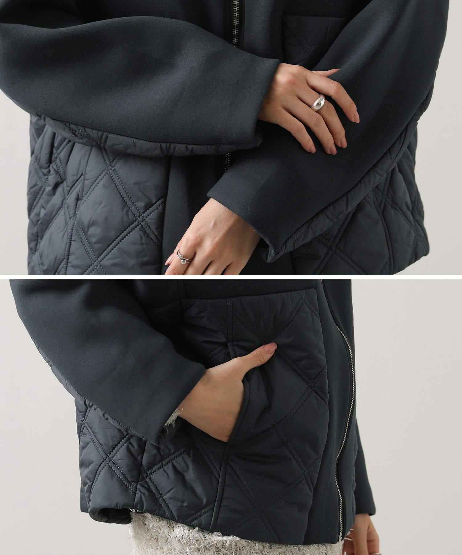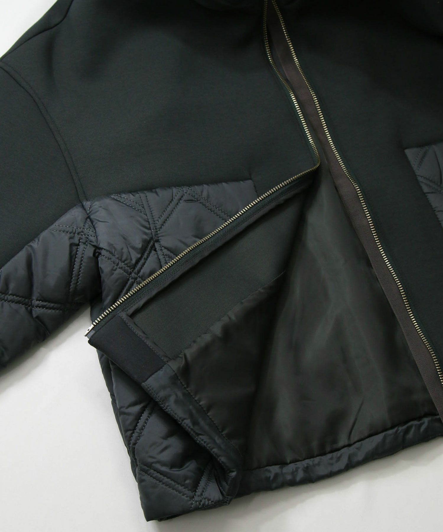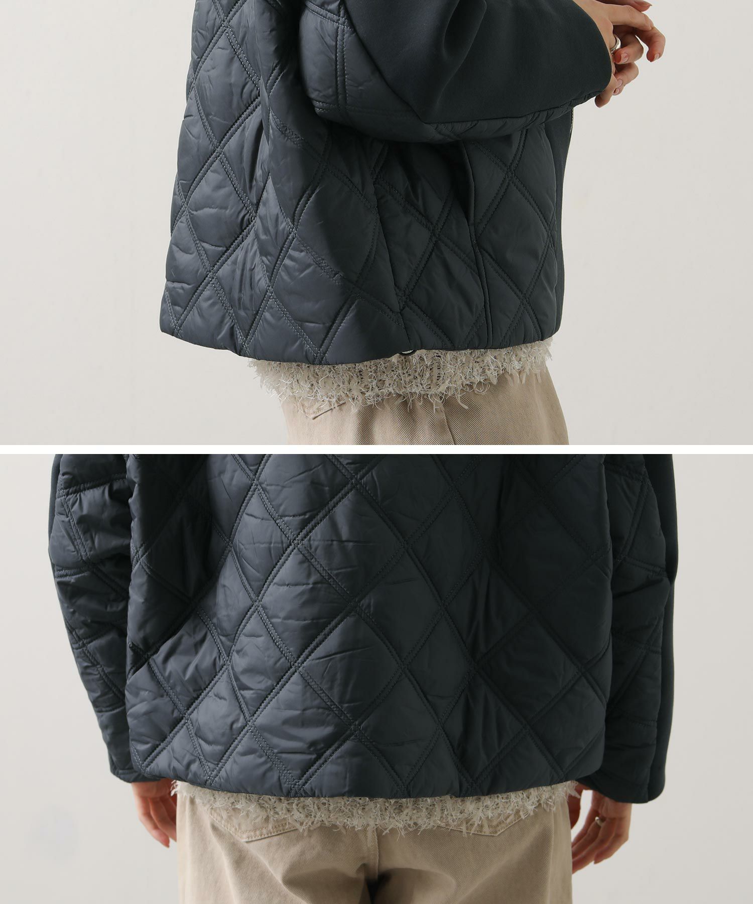 サイドや後身頃、フードのキルティング切替がアクセントに。