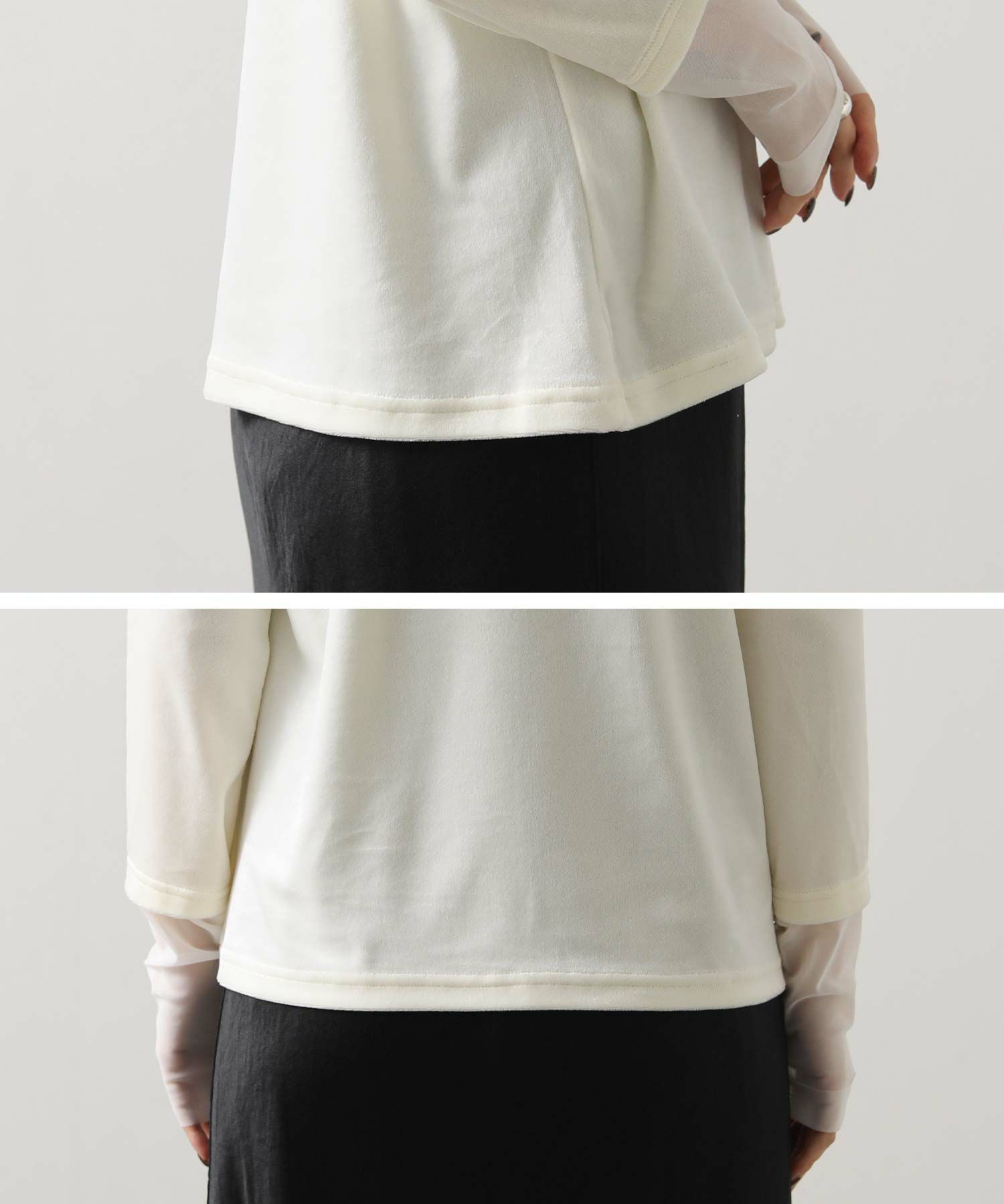 チュールの袖口をちらりと見せるスタイルで、洗練された抜け感をプラス。