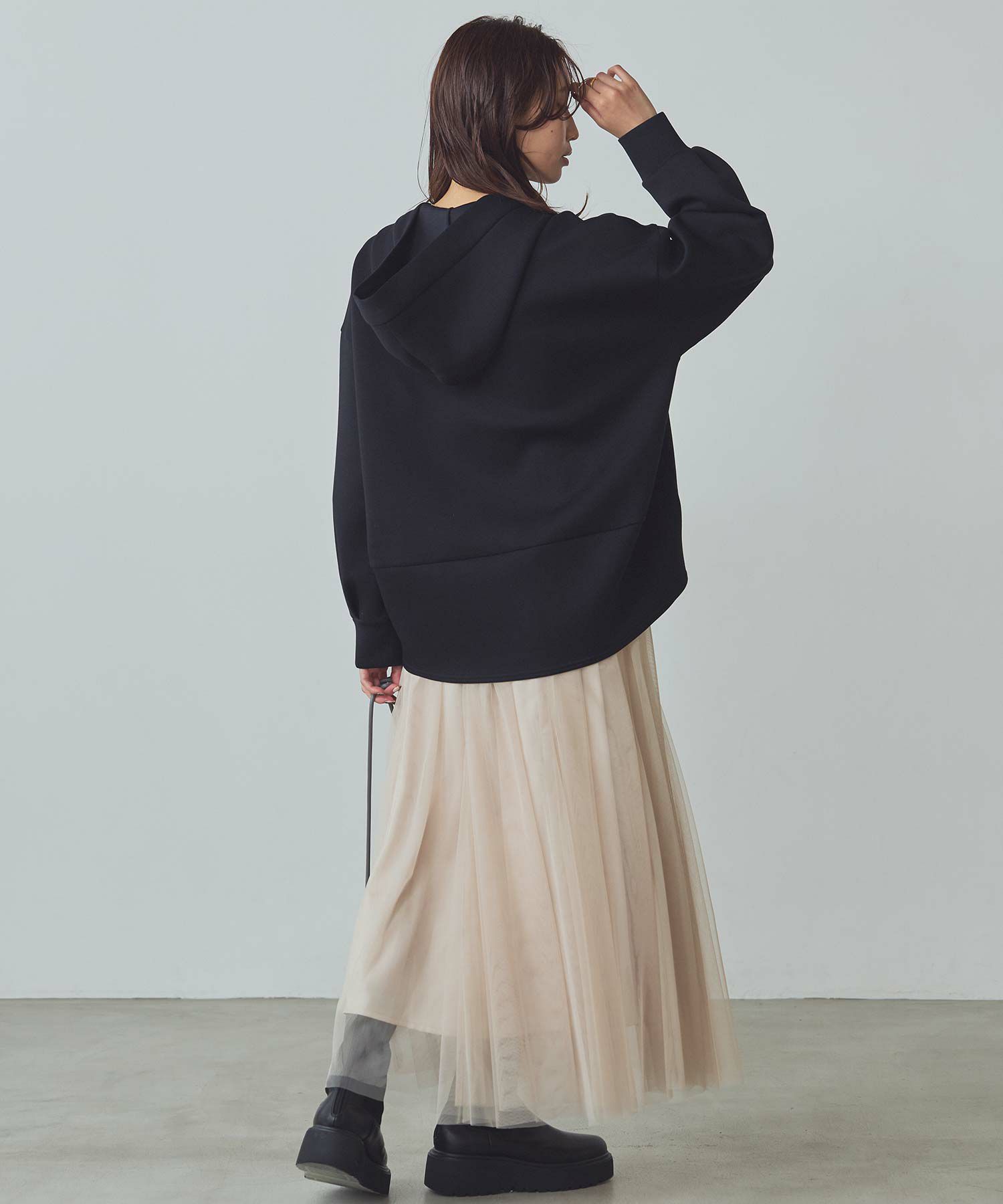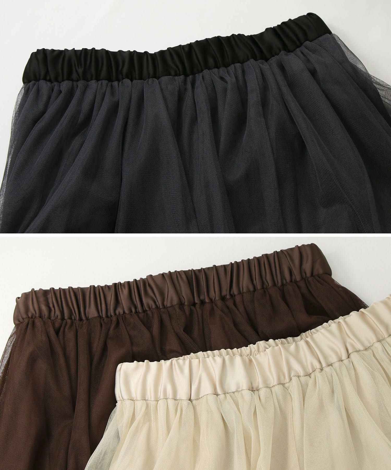 ふうわりと程よく広がるチュール素材を使用したボリュームのあるスカート。