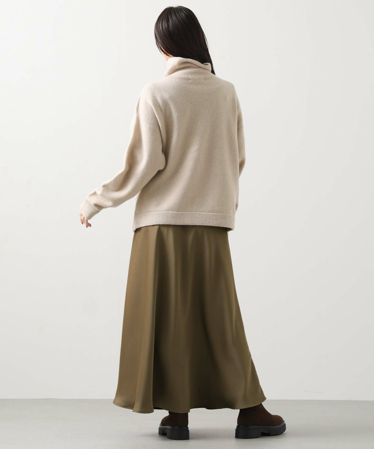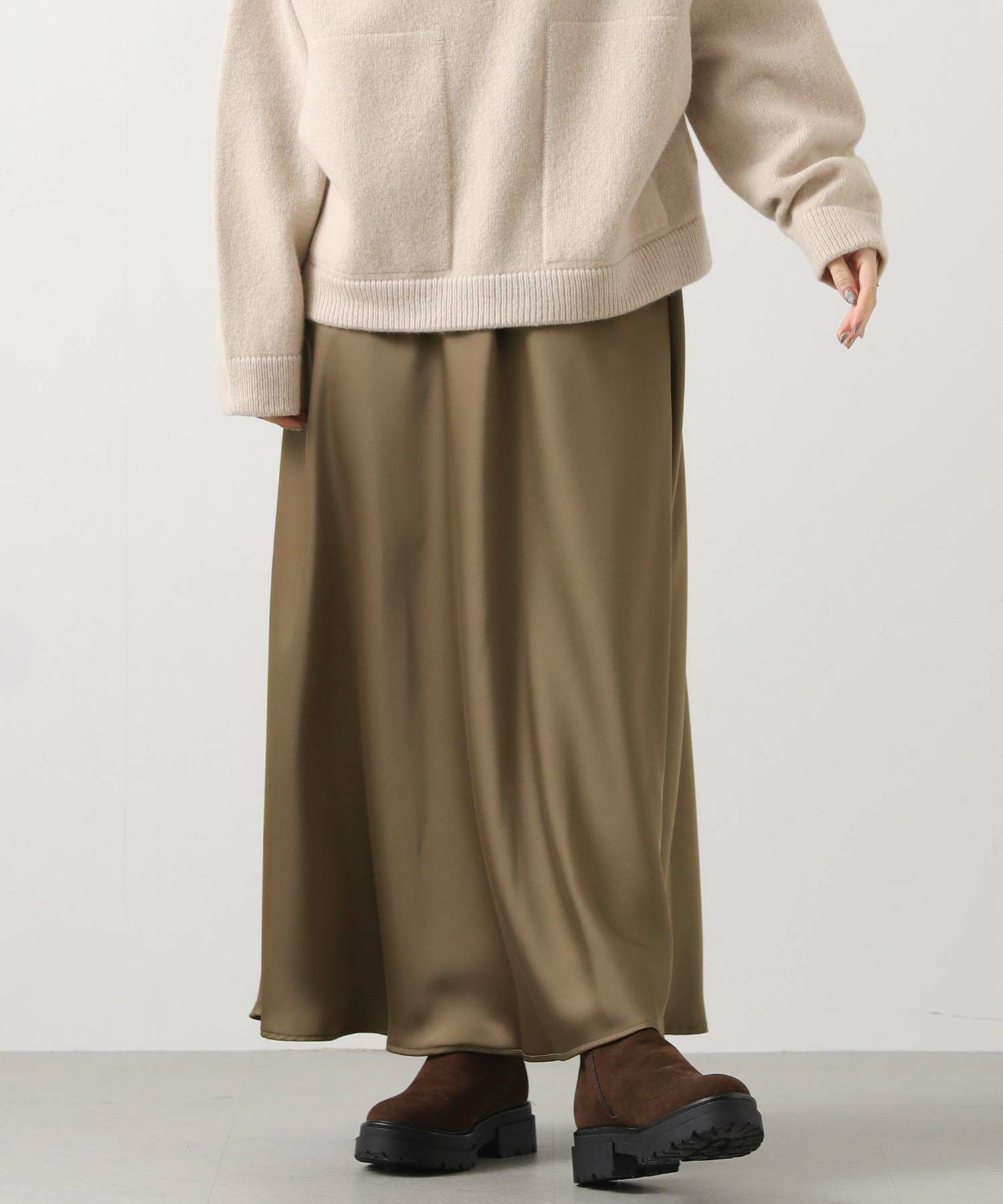 きれいなフレアシルエットの出るサテン生地スカート。