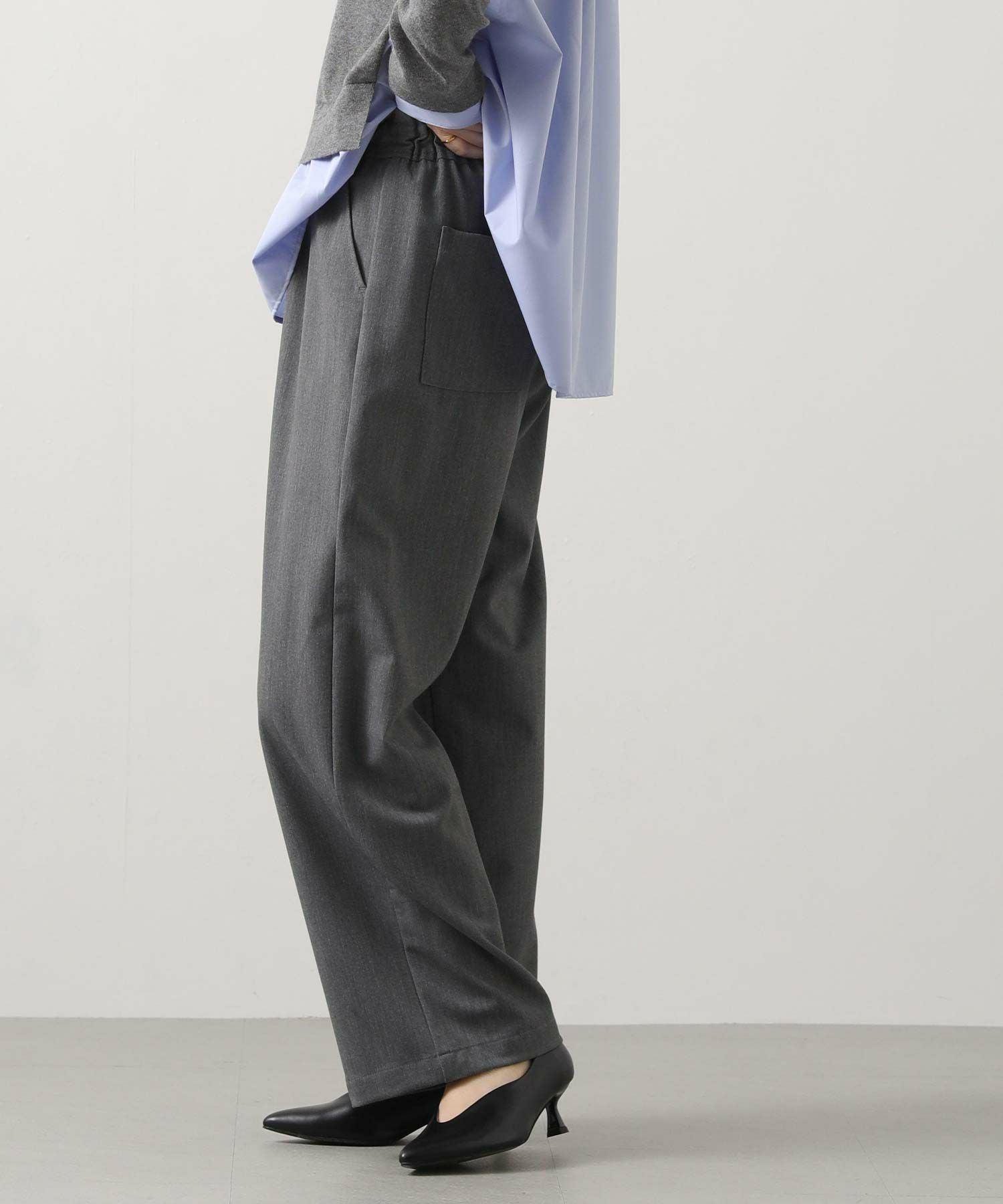 ウエスト総ゴムのイージーパンツながらきちんと見えする素材感なので、普段使いからオフィスでも着られるアイテム。