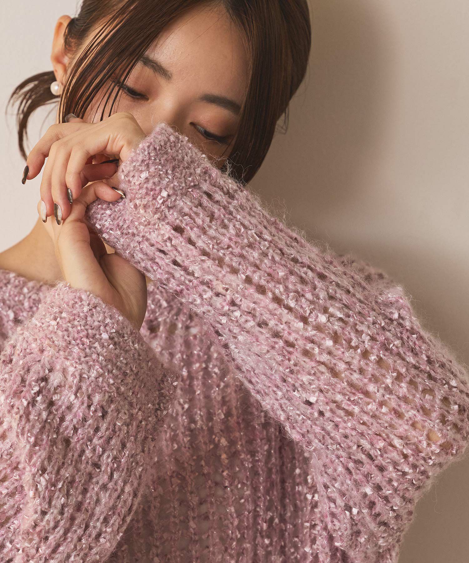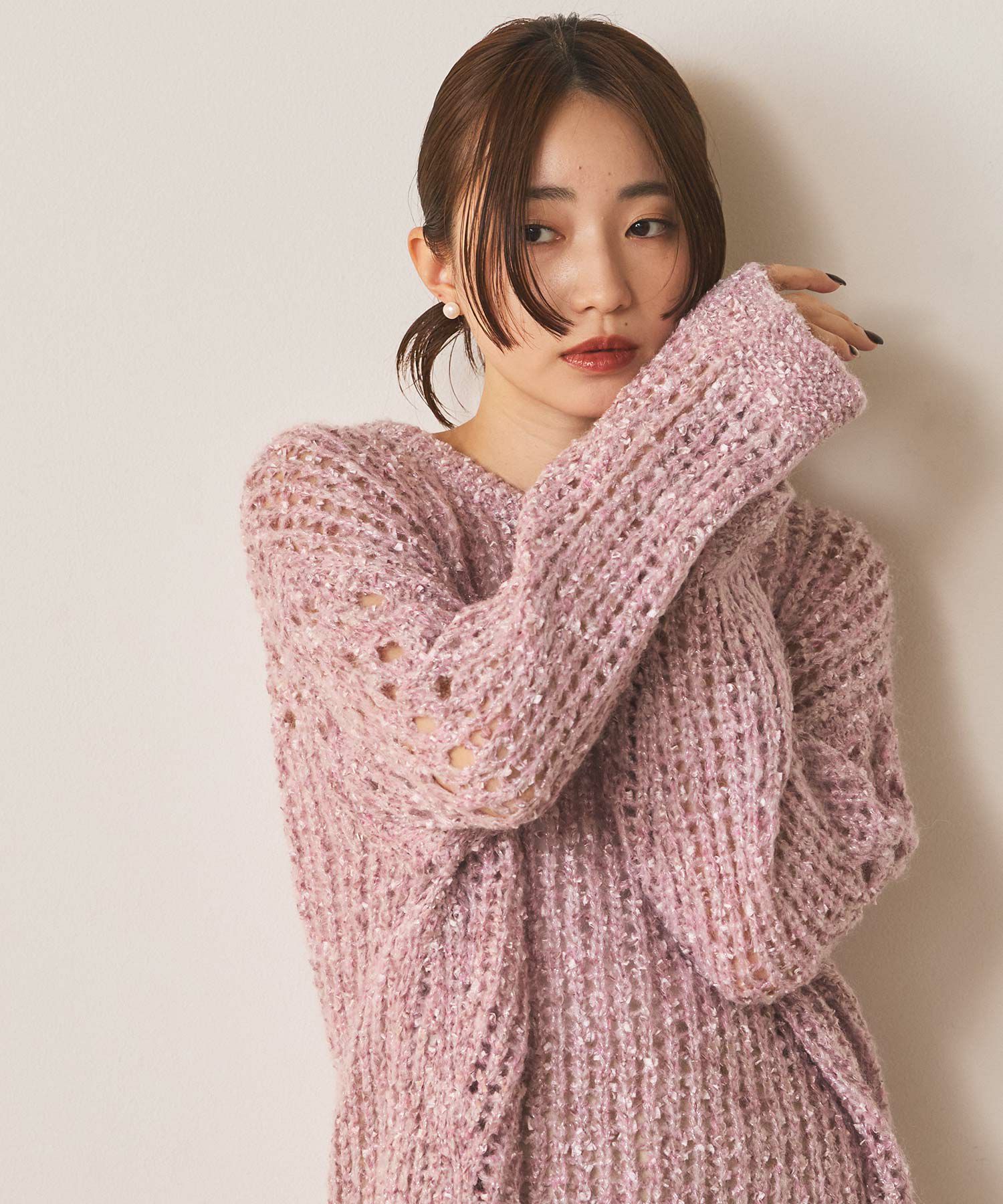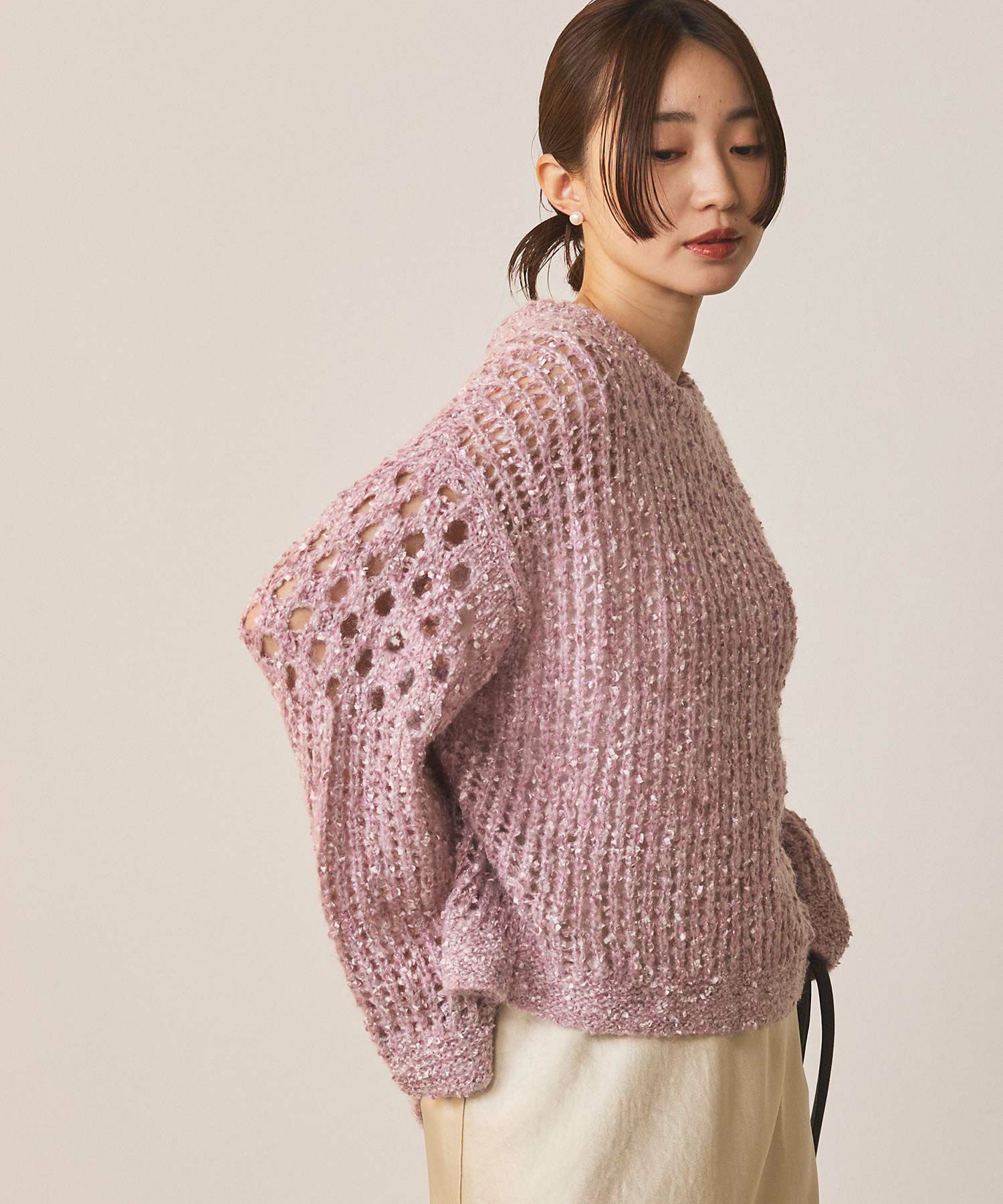 表情豊かなフラッグヤーンとふんわりしたモヘヤに上品に光るラメが目をひくニットプルオーバー。