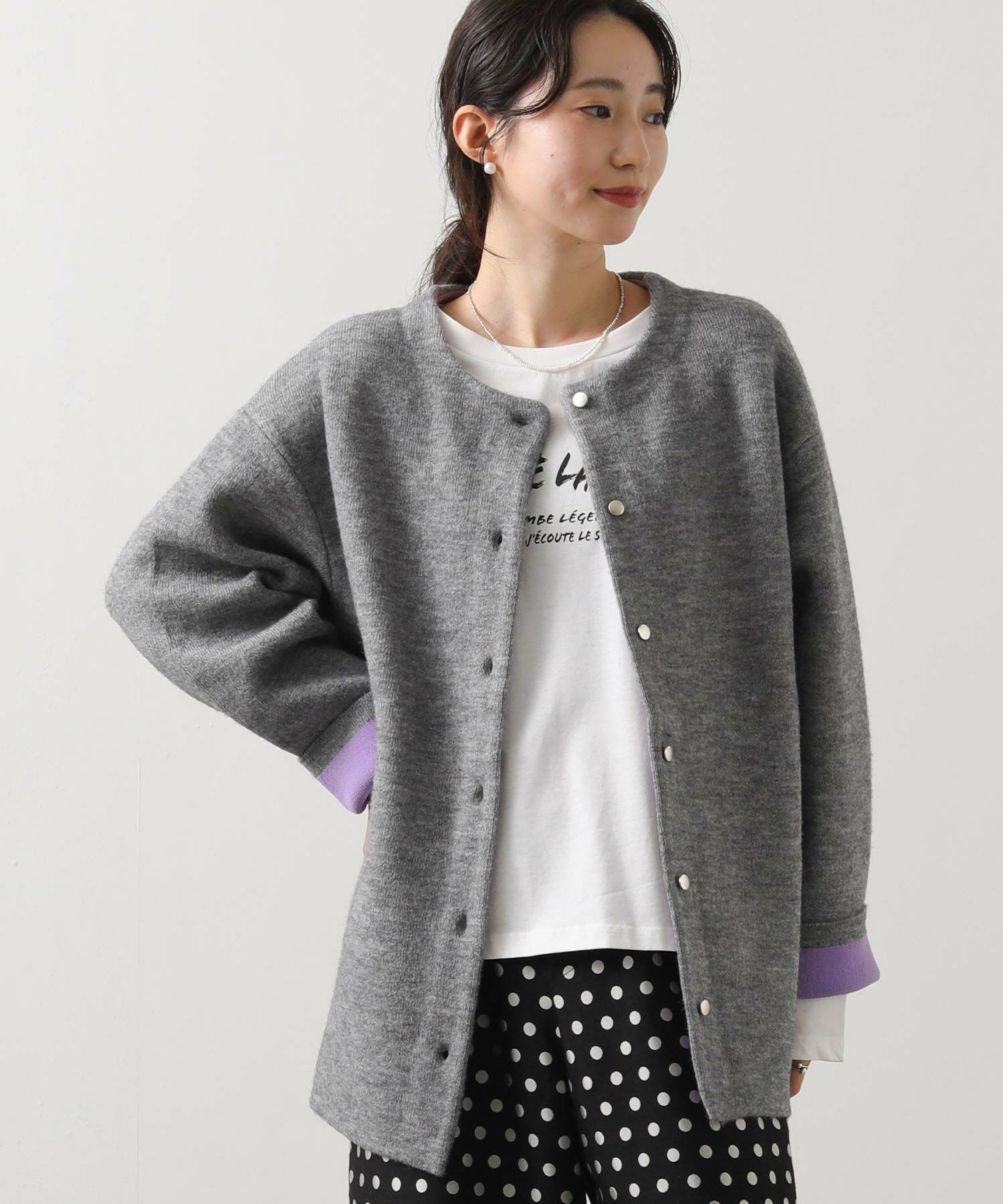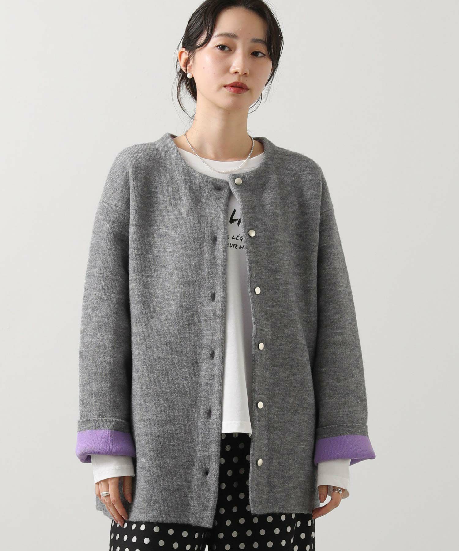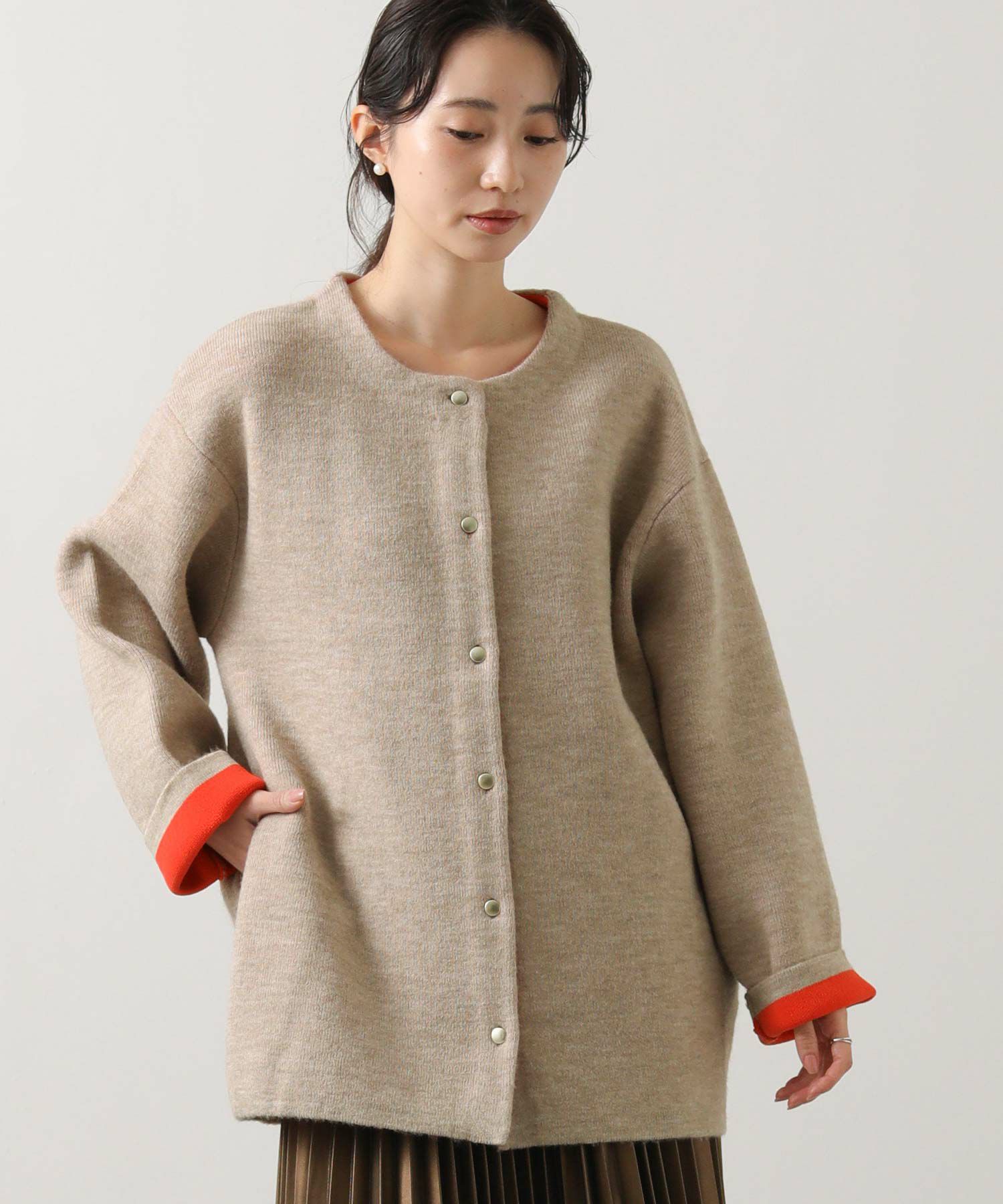 カーディガンとしてもアウターとしても楽しめる1枚です。