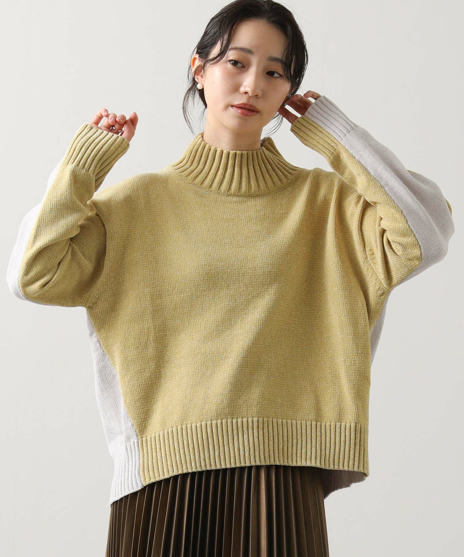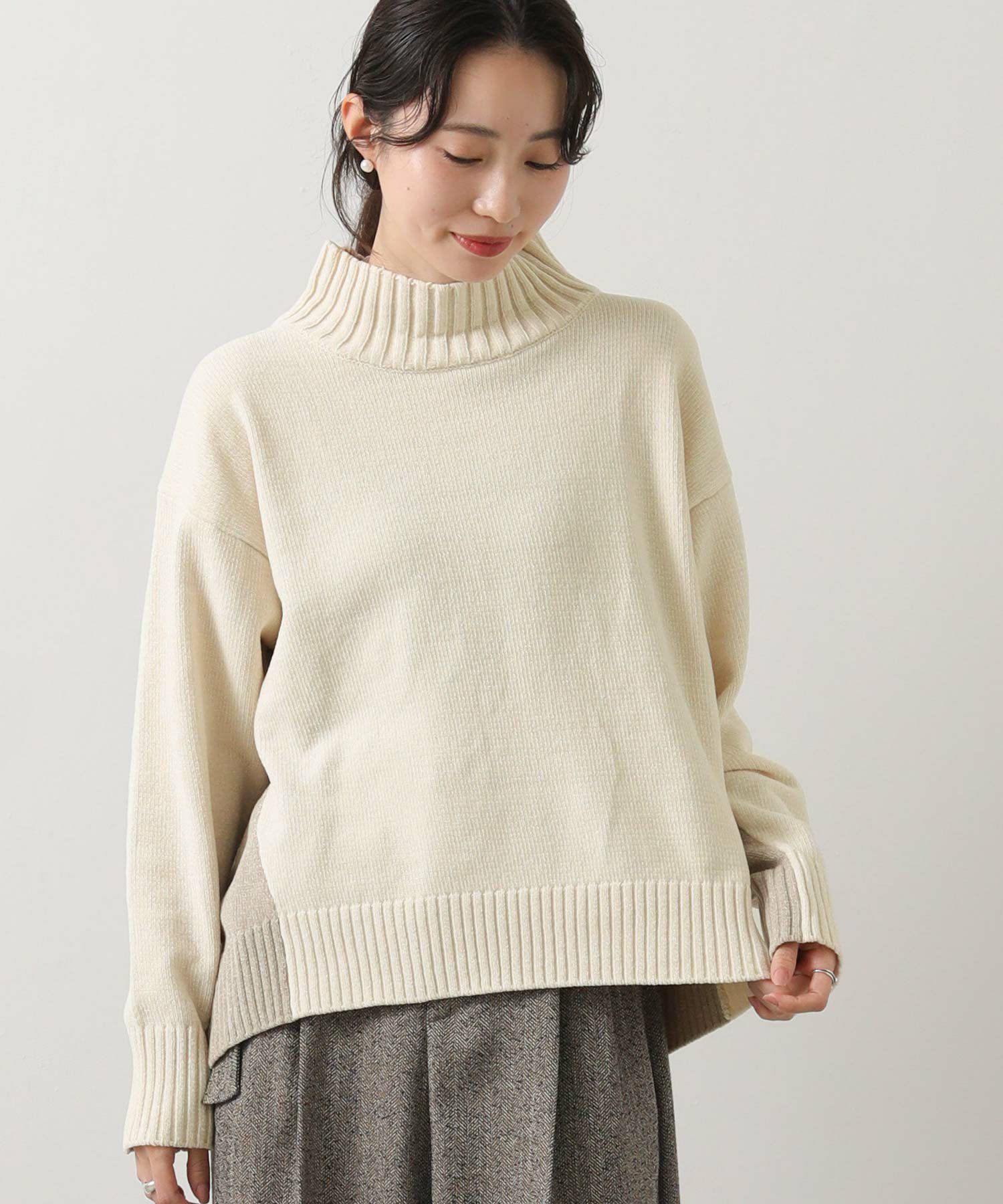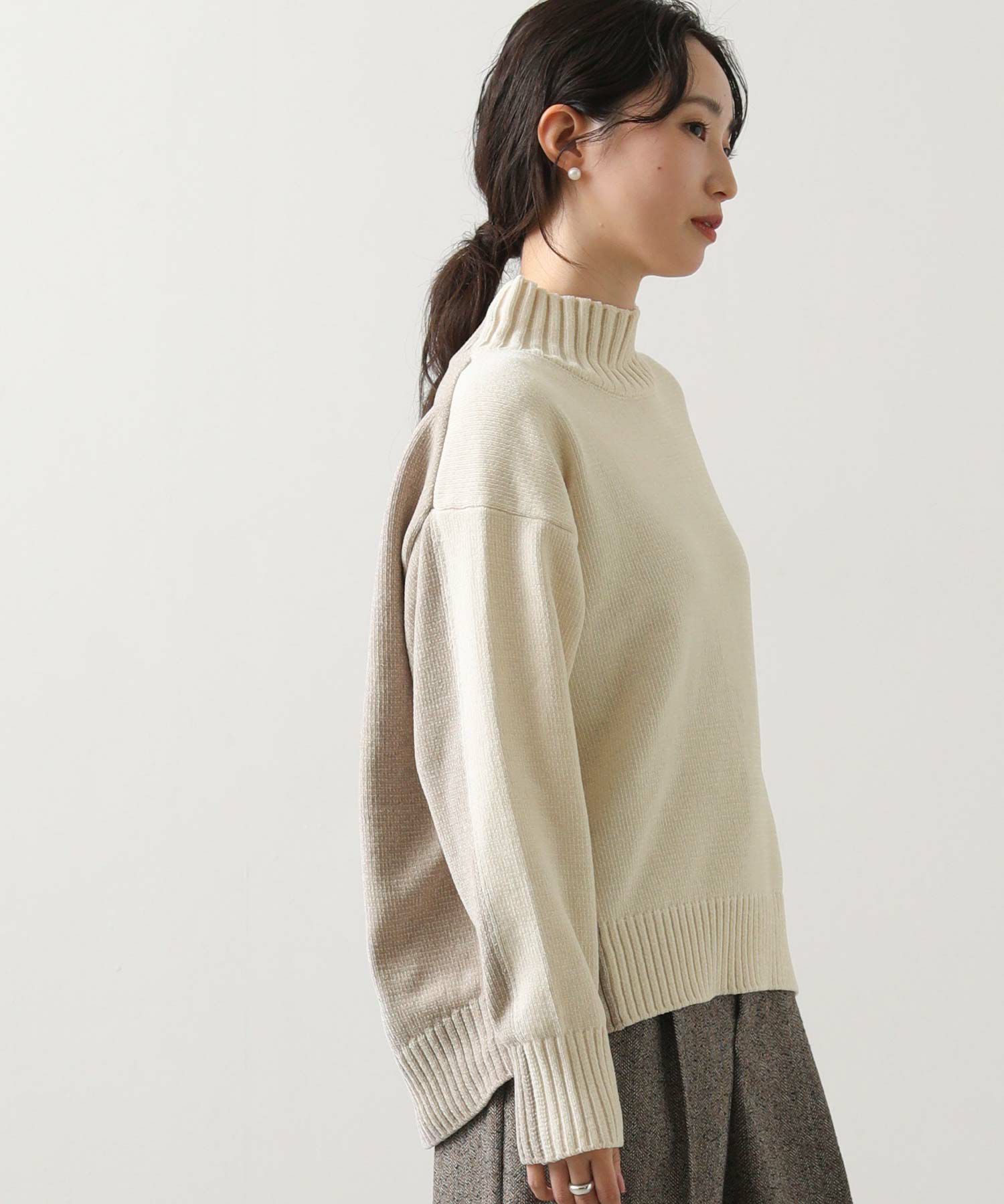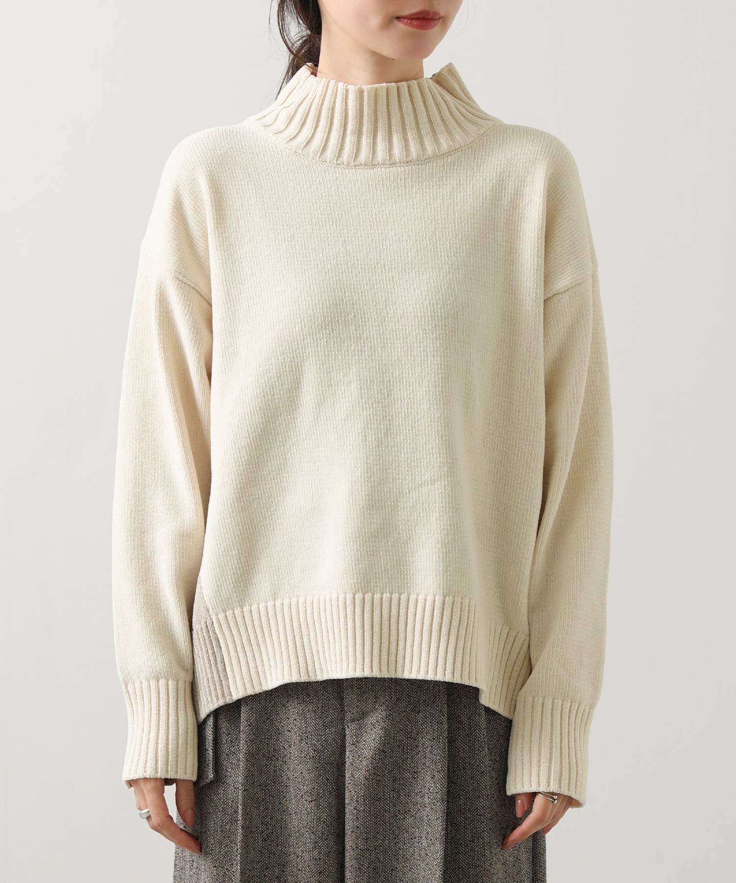 前後のバイカラーが目を惹くハイネックニット。