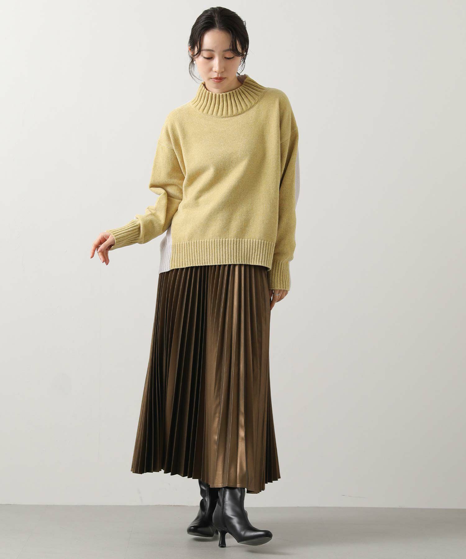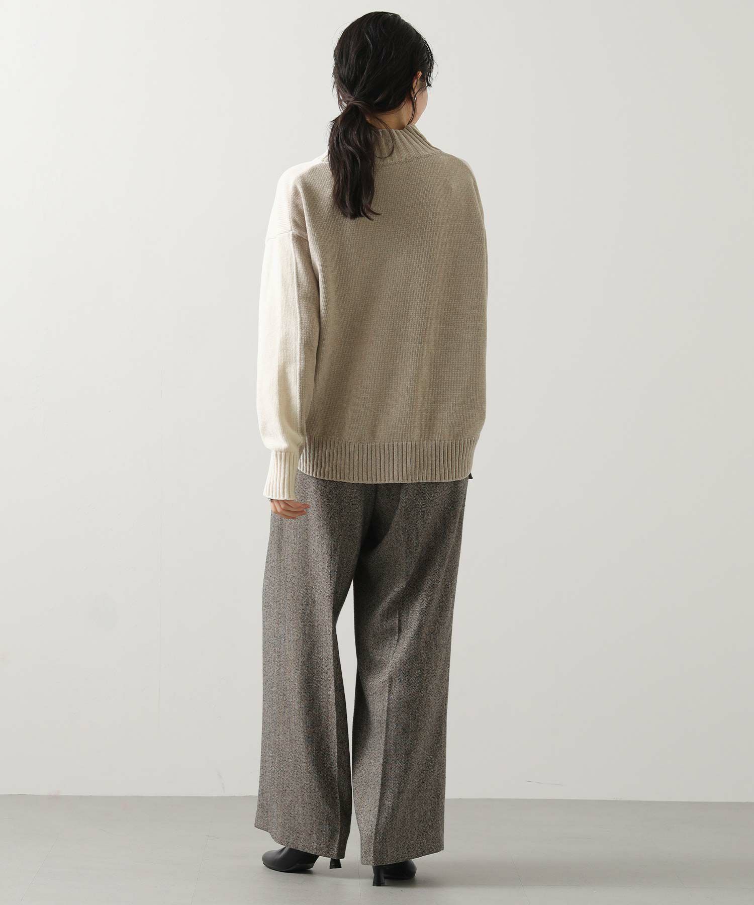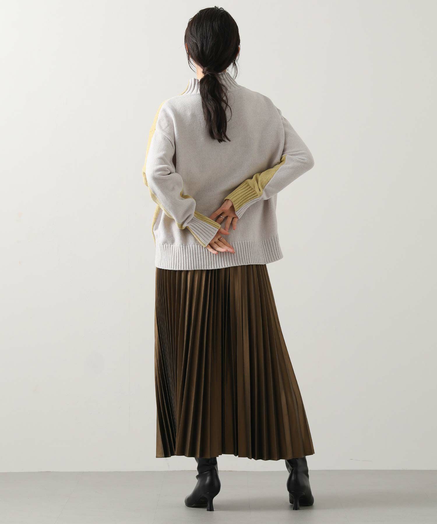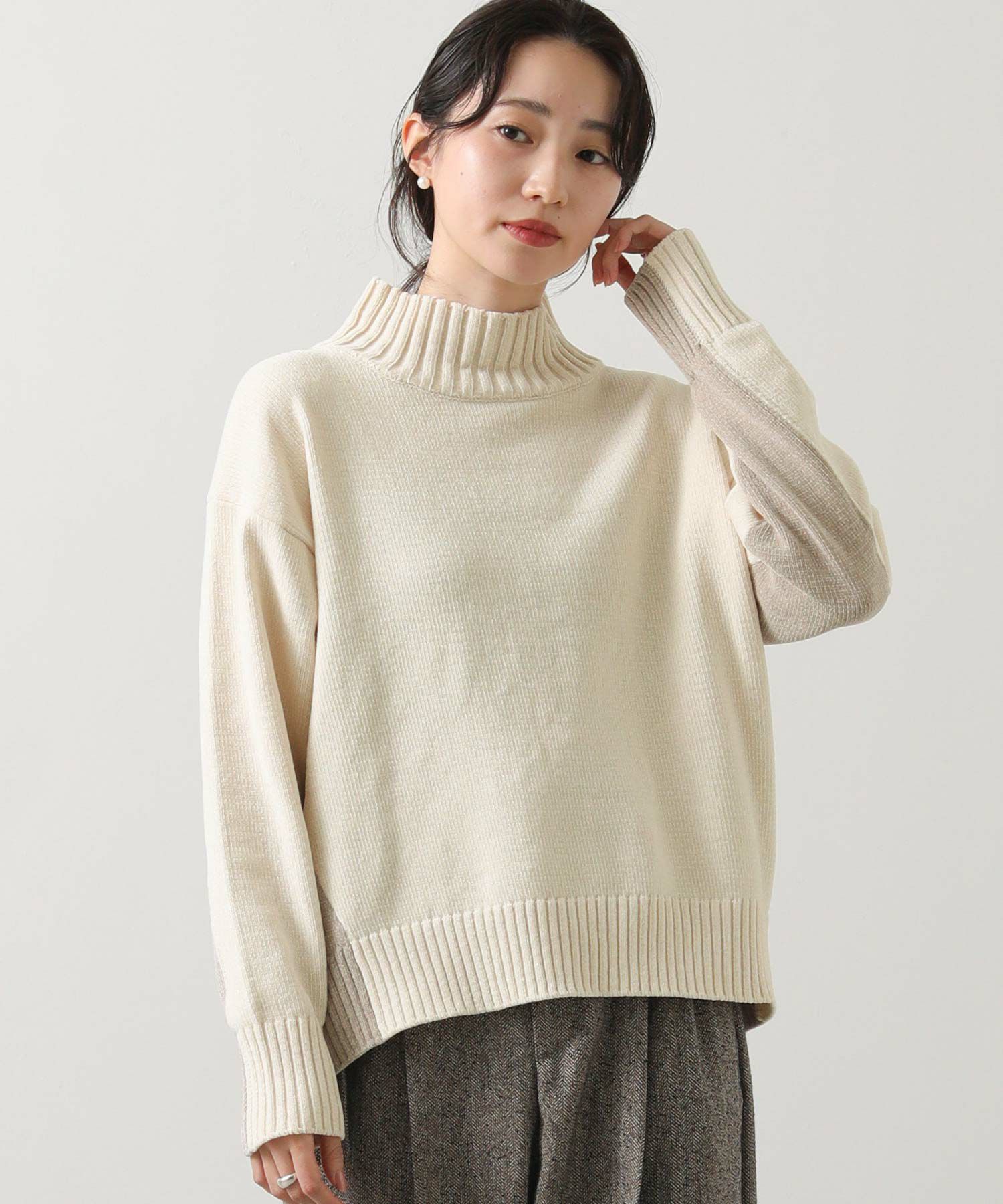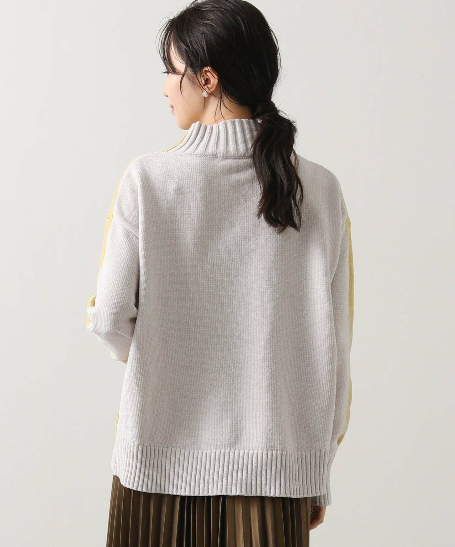 前後のバイカラーが目を惹くハイネックニット。
