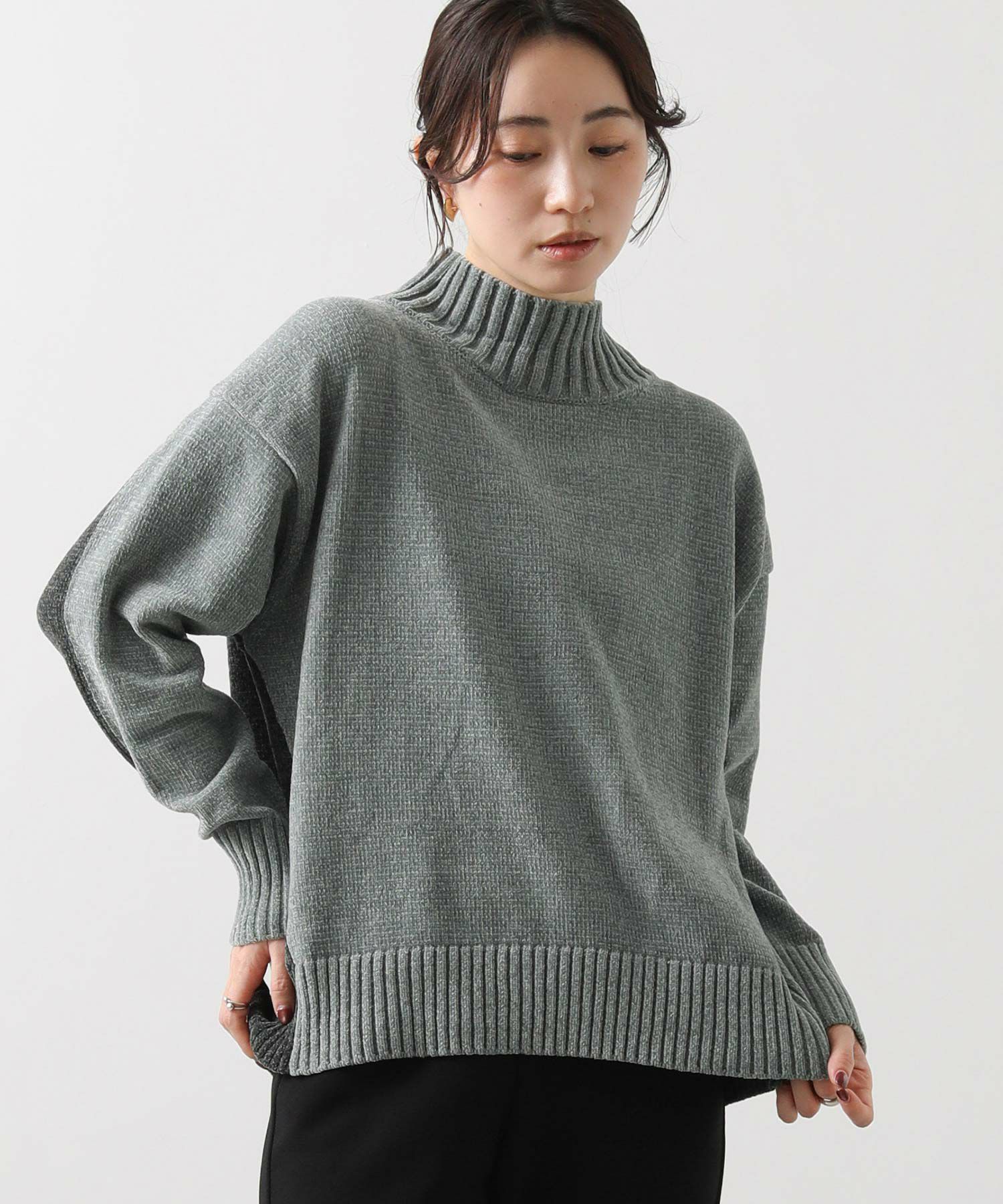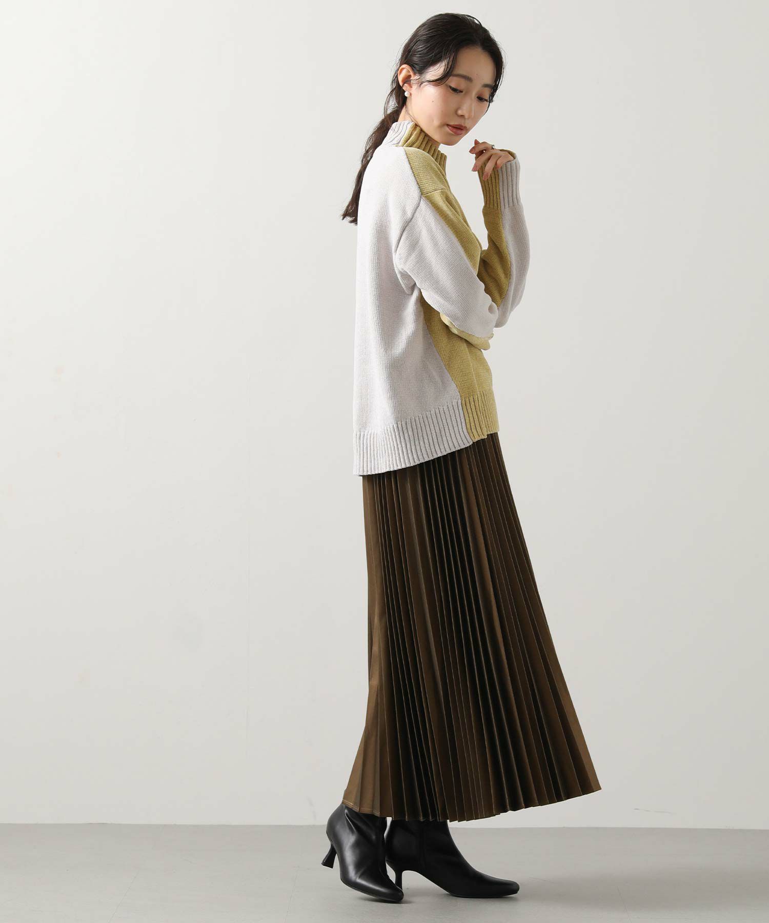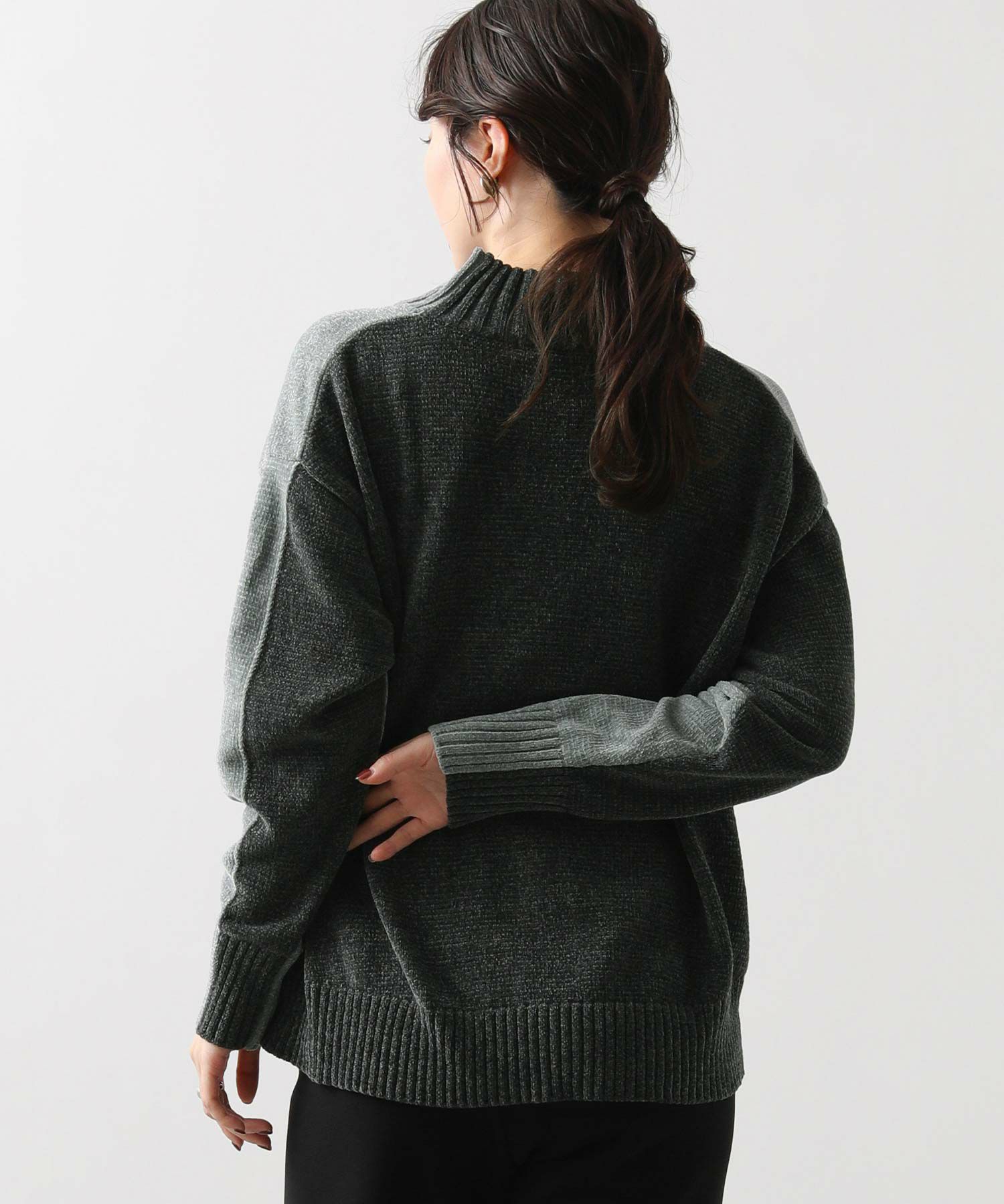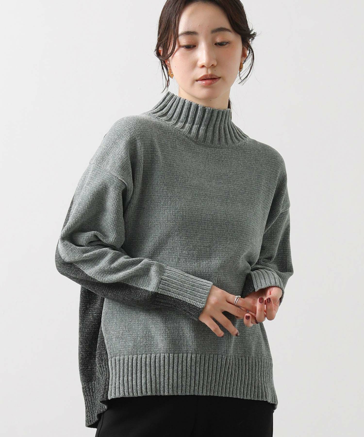 前後のバイカラーが目を惹くハイネックニット。