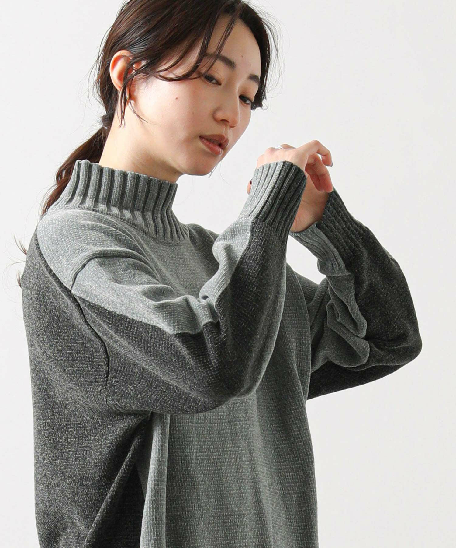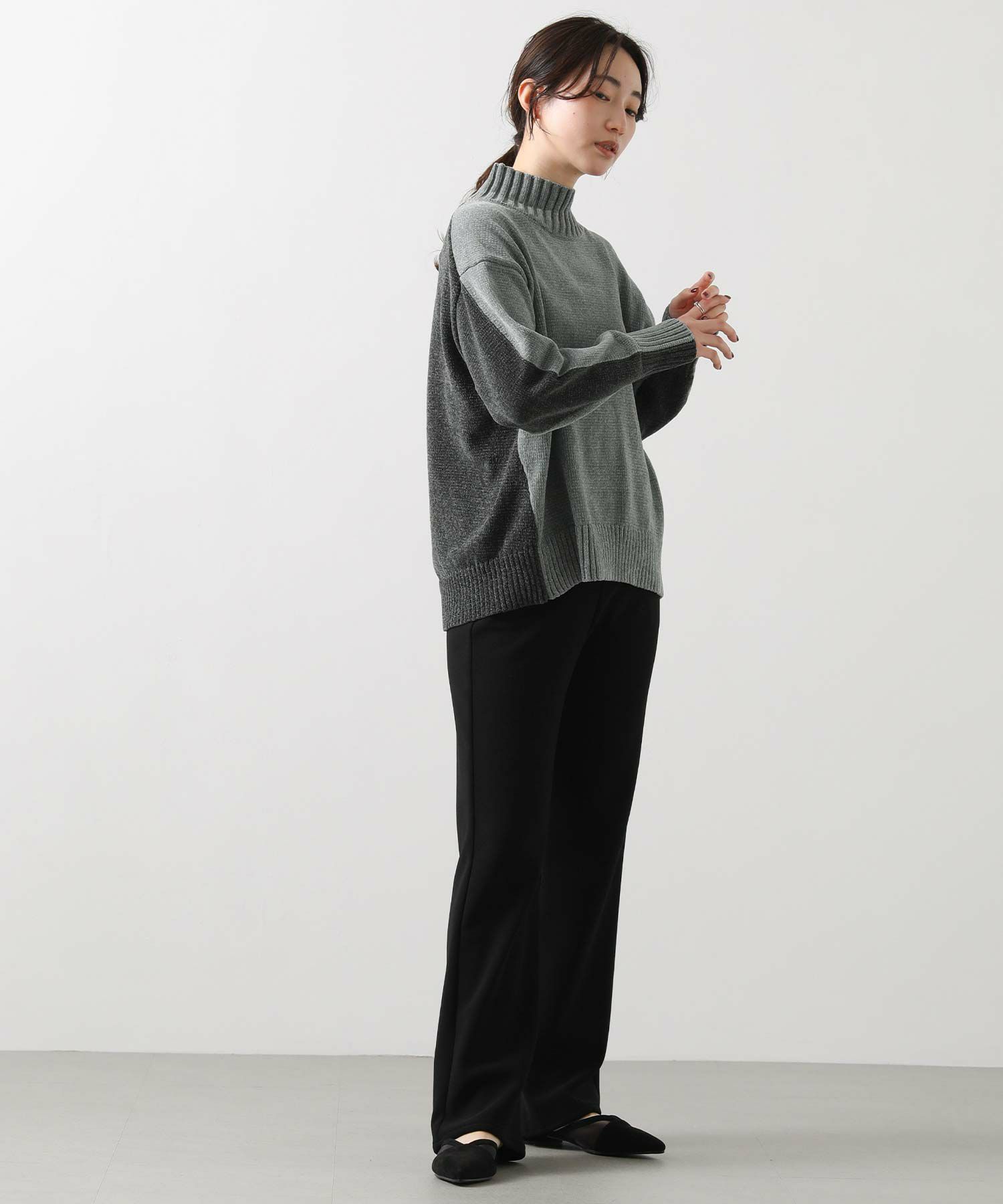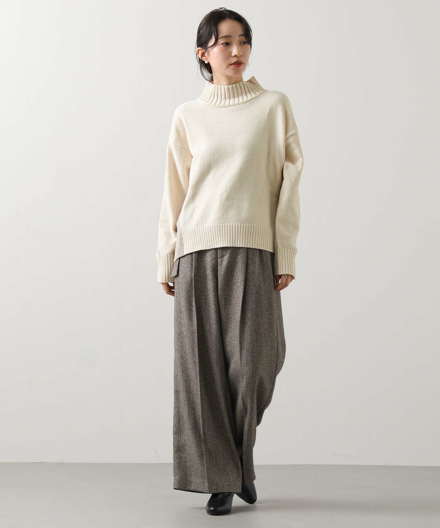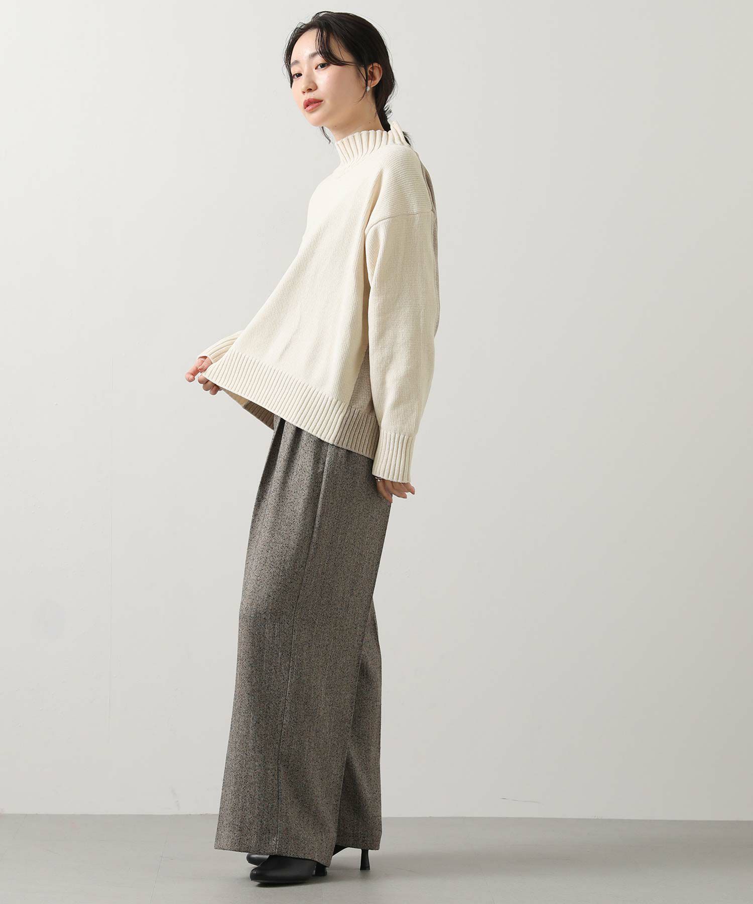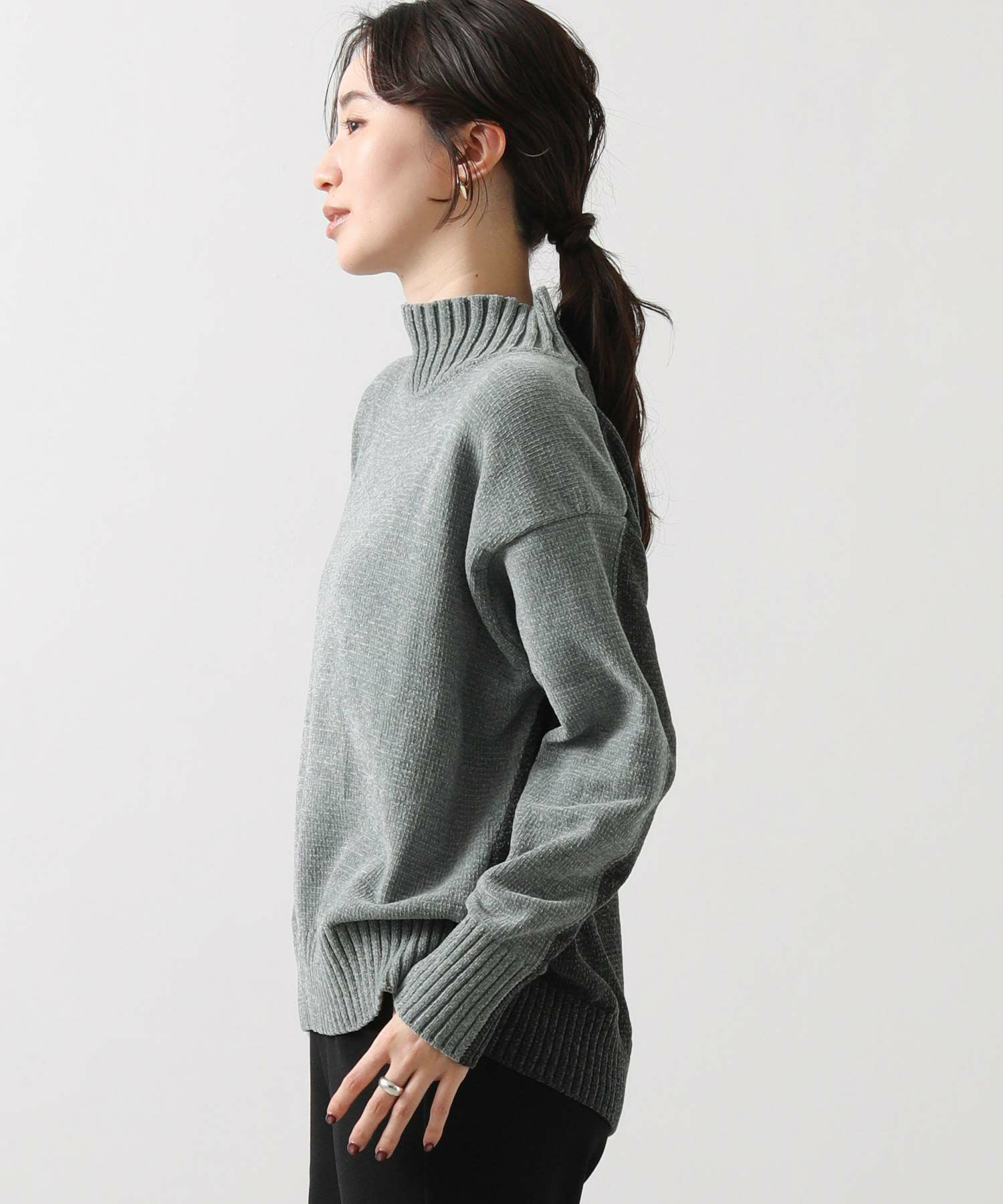 前後のバイカラーが目を惹くハイネックニット。