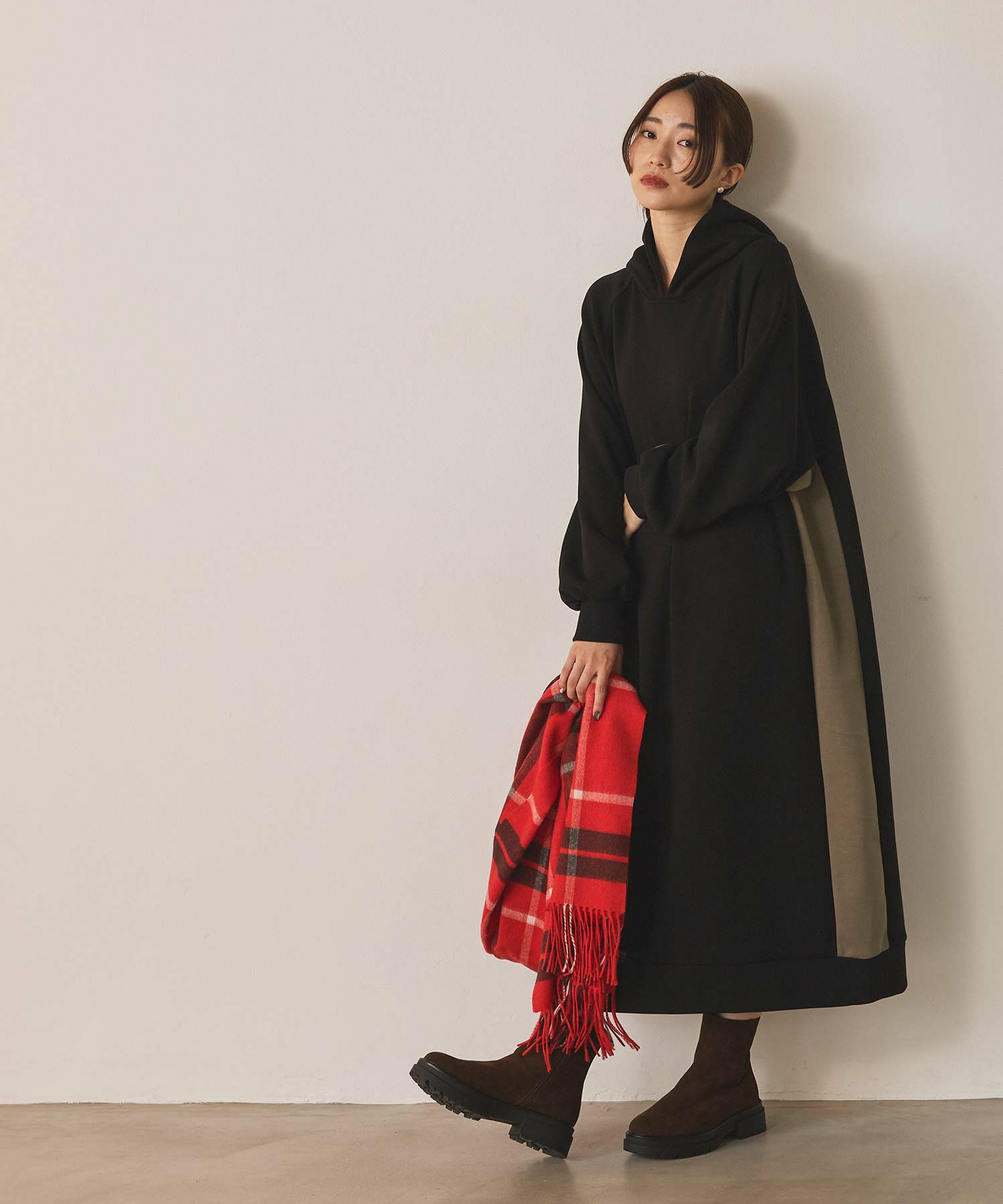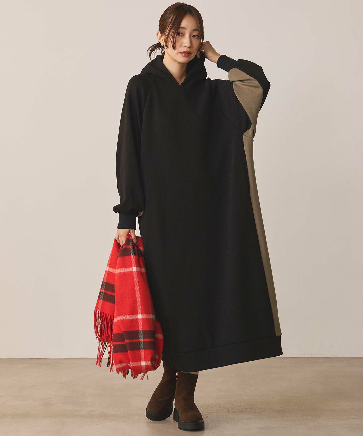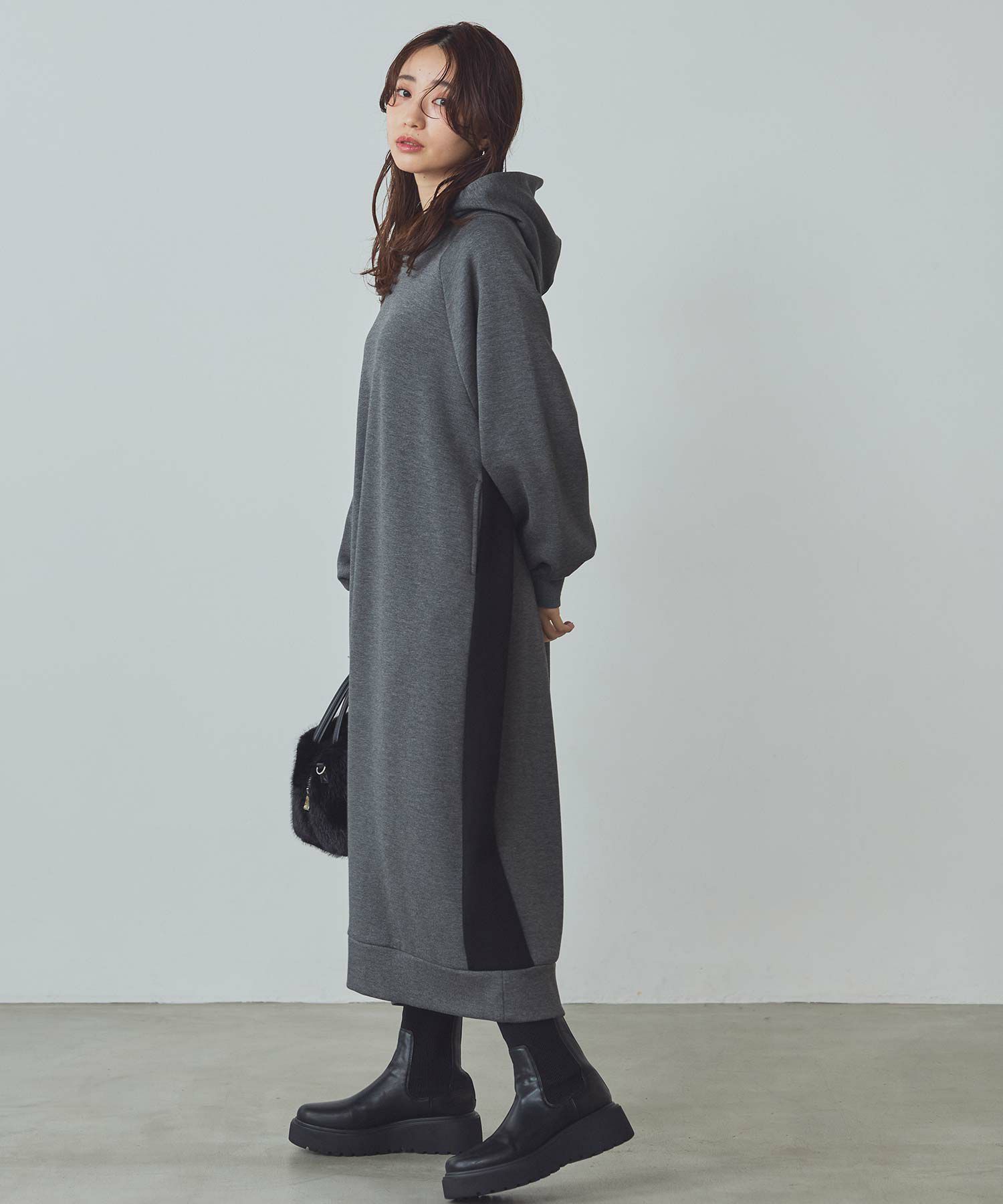 サイドラインから袖下のバイカラーがポイントのフーディワンピース。