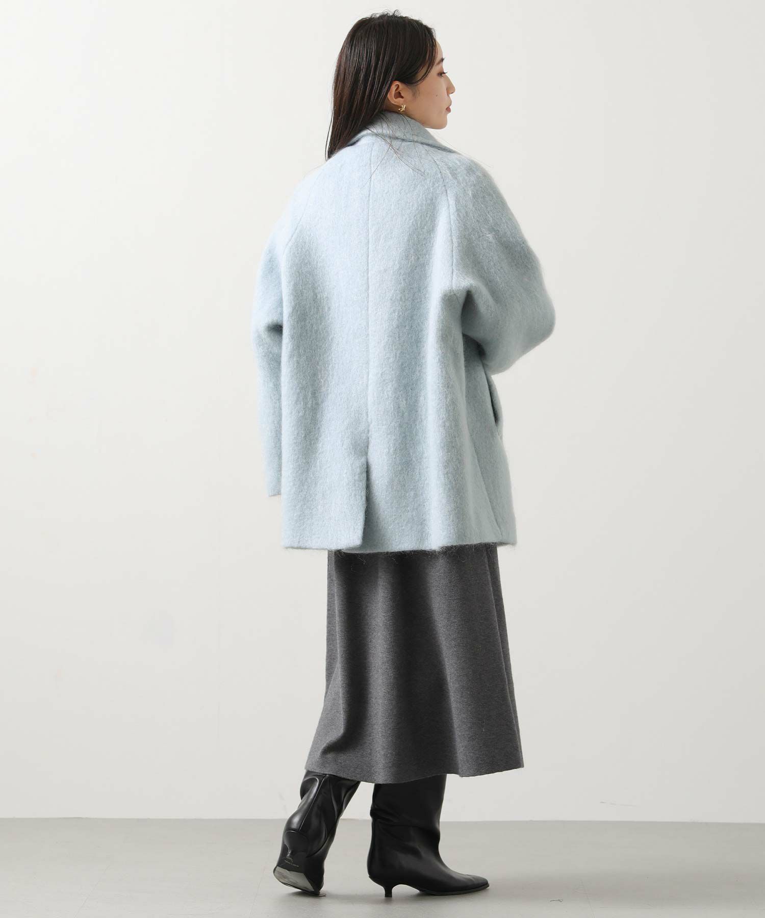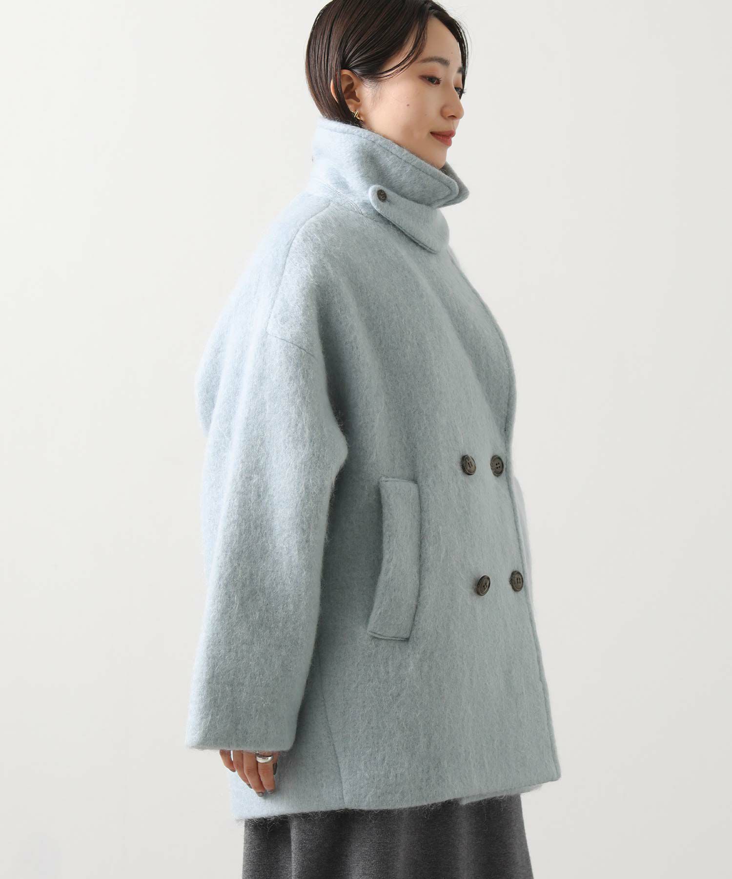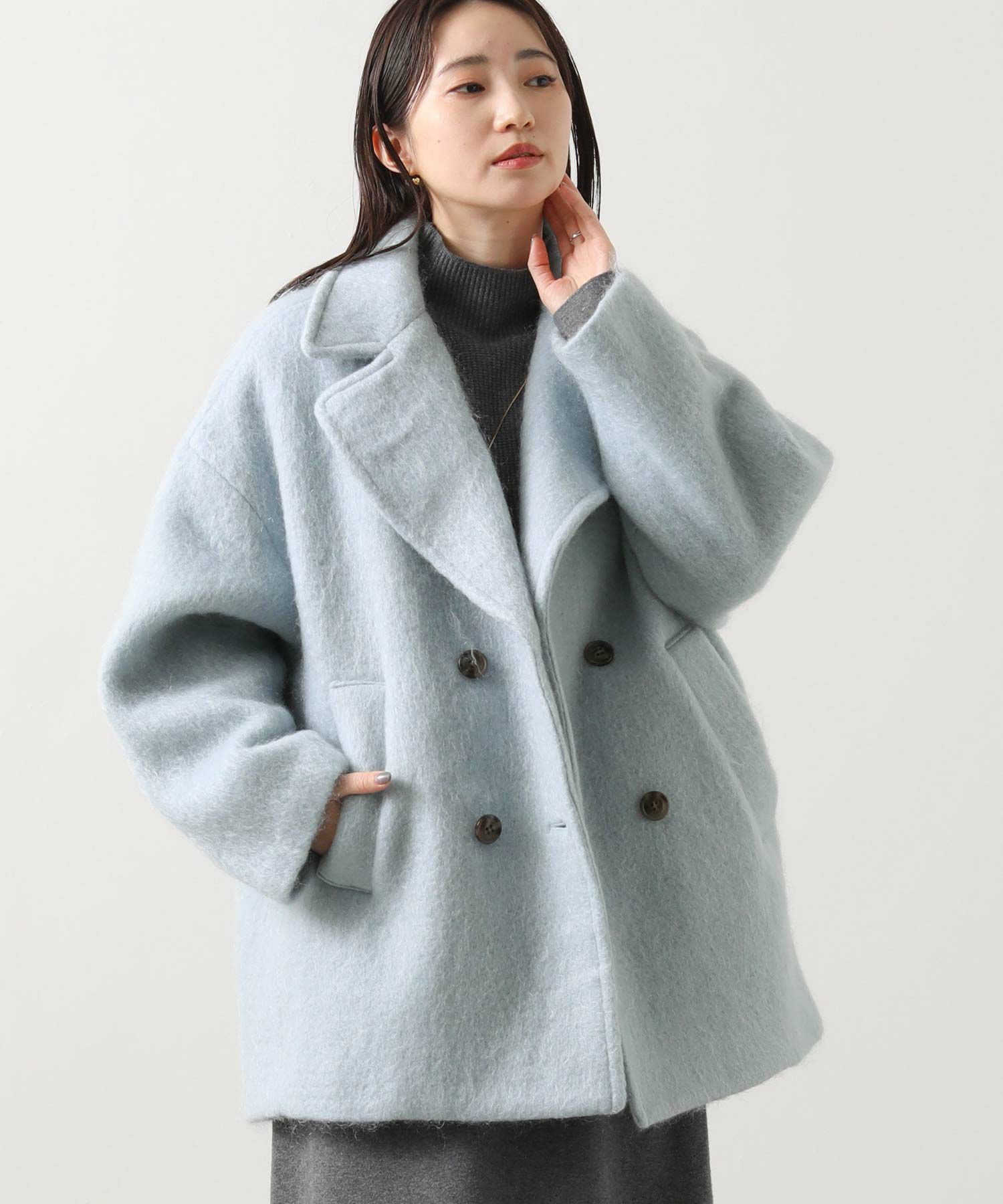 大きめの襟にミドル丈が絶妙なバランスのモヘヤシャギーPコート。