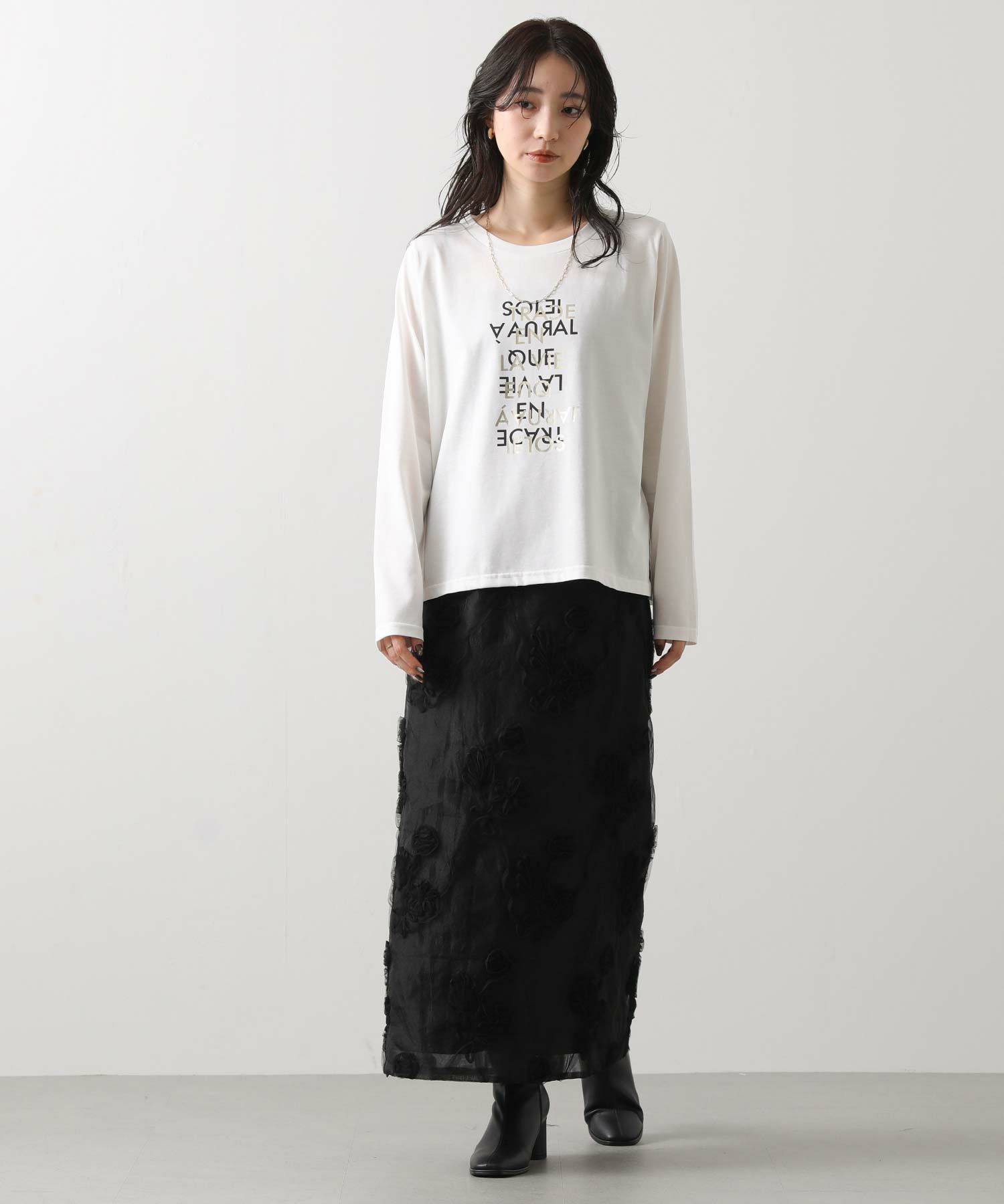 とても柔らかく心地よい生地感で、1枚でも美しく着こなせるのが魅力。プリントに箔を重ねた繊細なグラフィックは、さりげなく華やかさを添えシンプルな中に上質感をプラス。