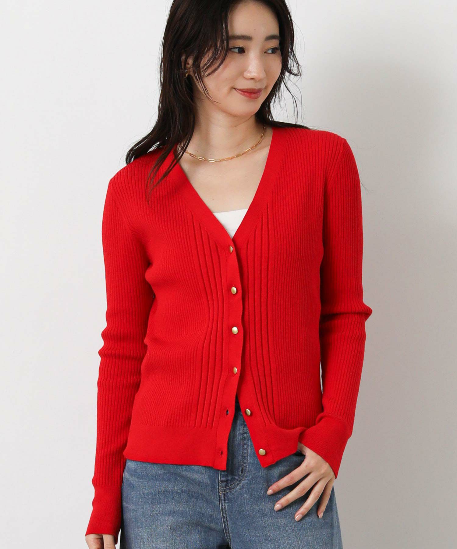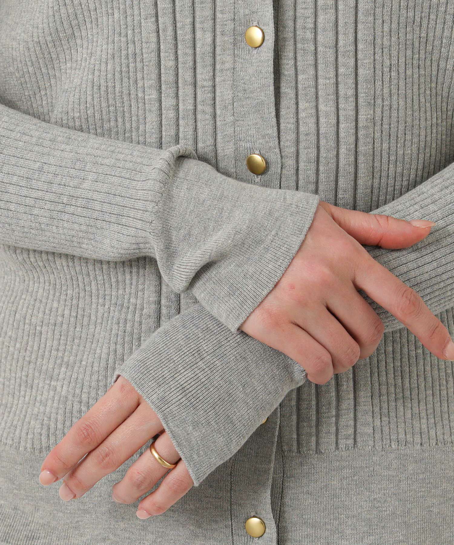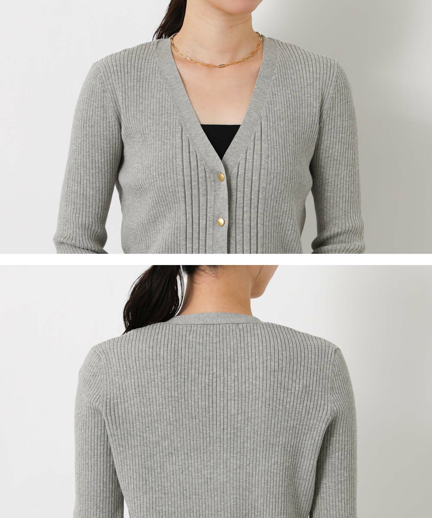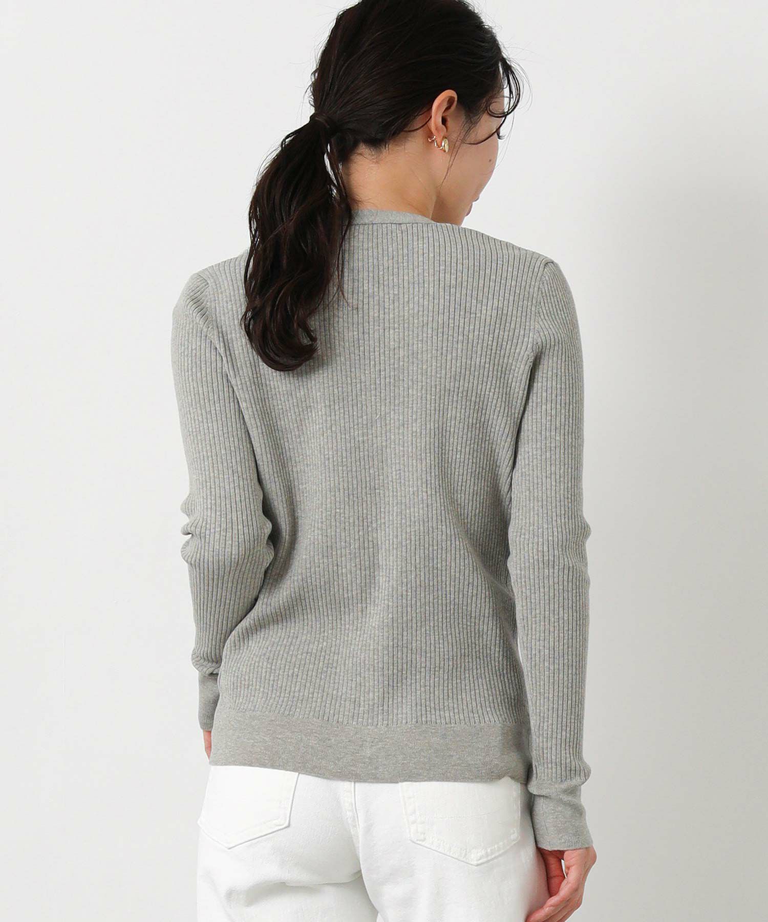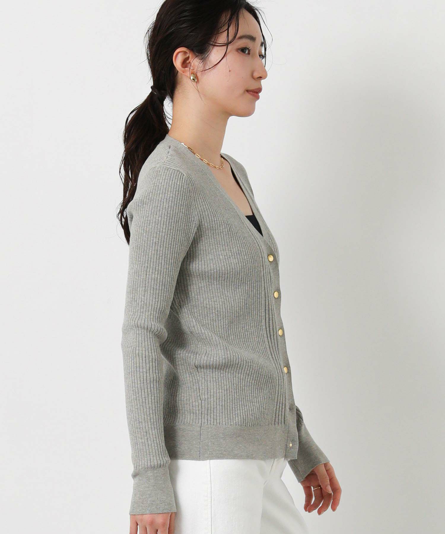 シャリ感のあるサラサラとした肌触りの綿混の糸を使用したリブカーデ。