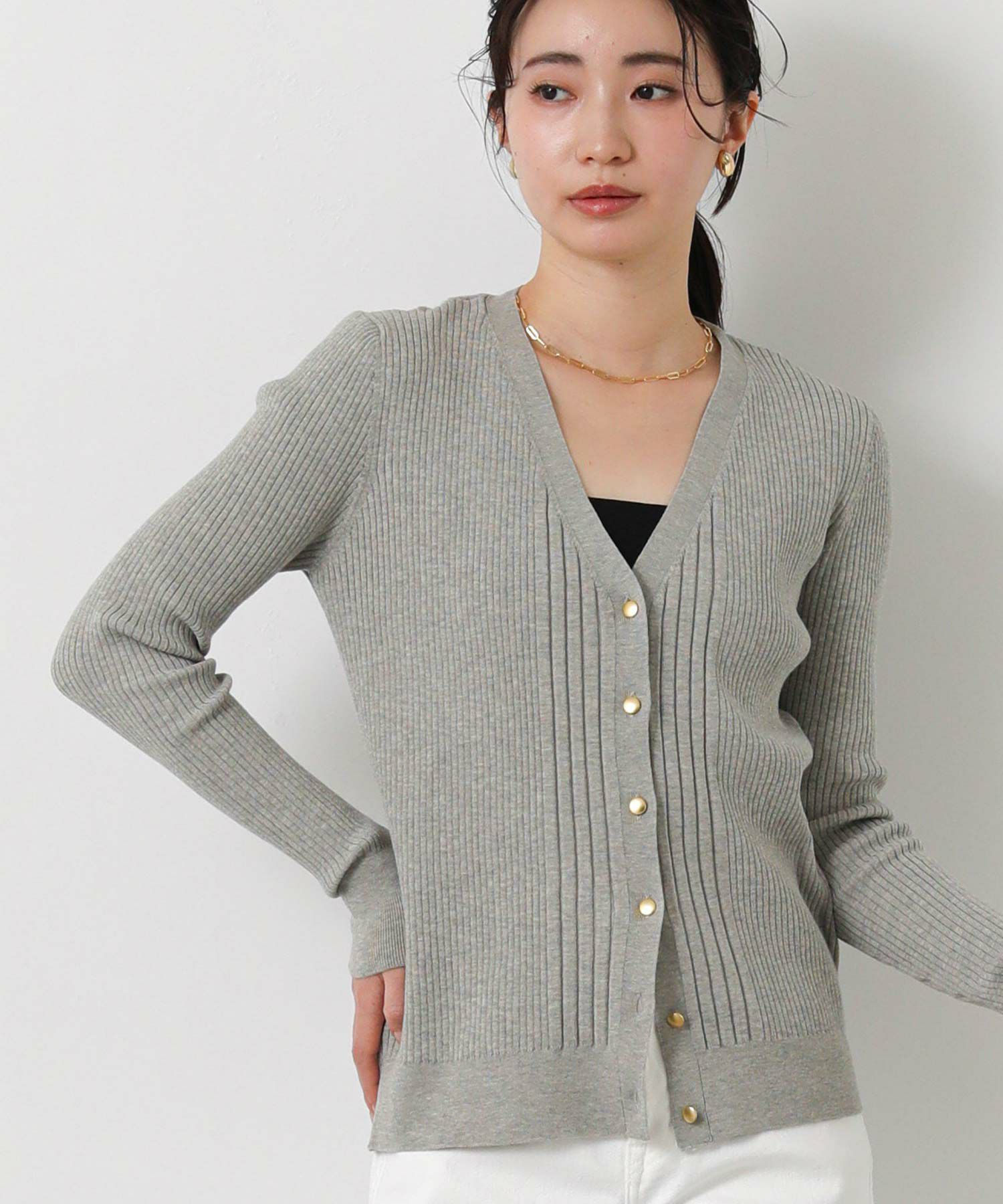 羽織としても、ボタンを止めてタンクやキャミと合わせてプルオーバーのようにした着こなしもオススメ。