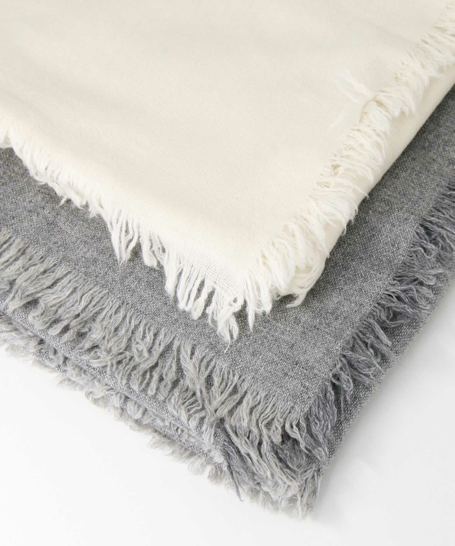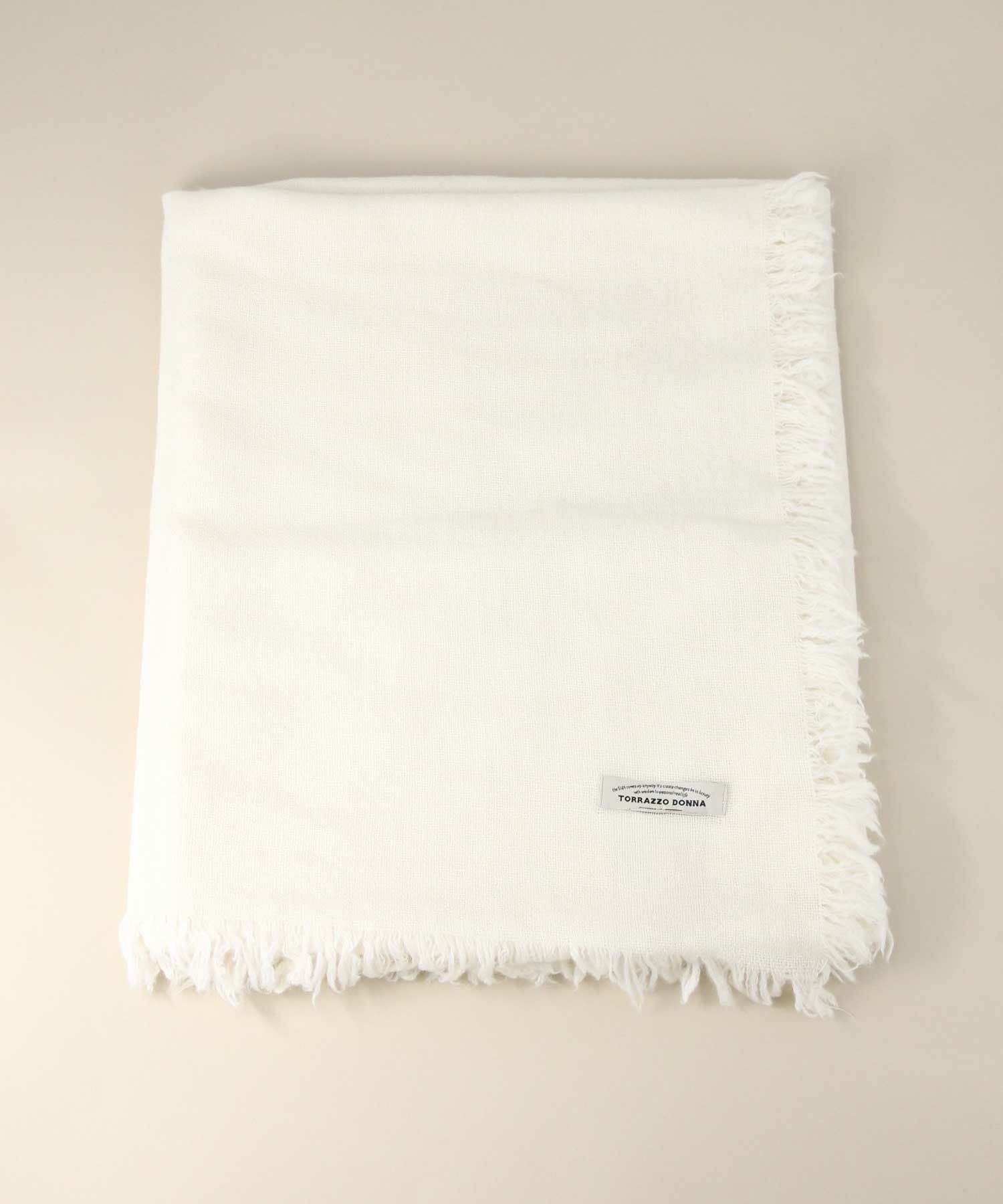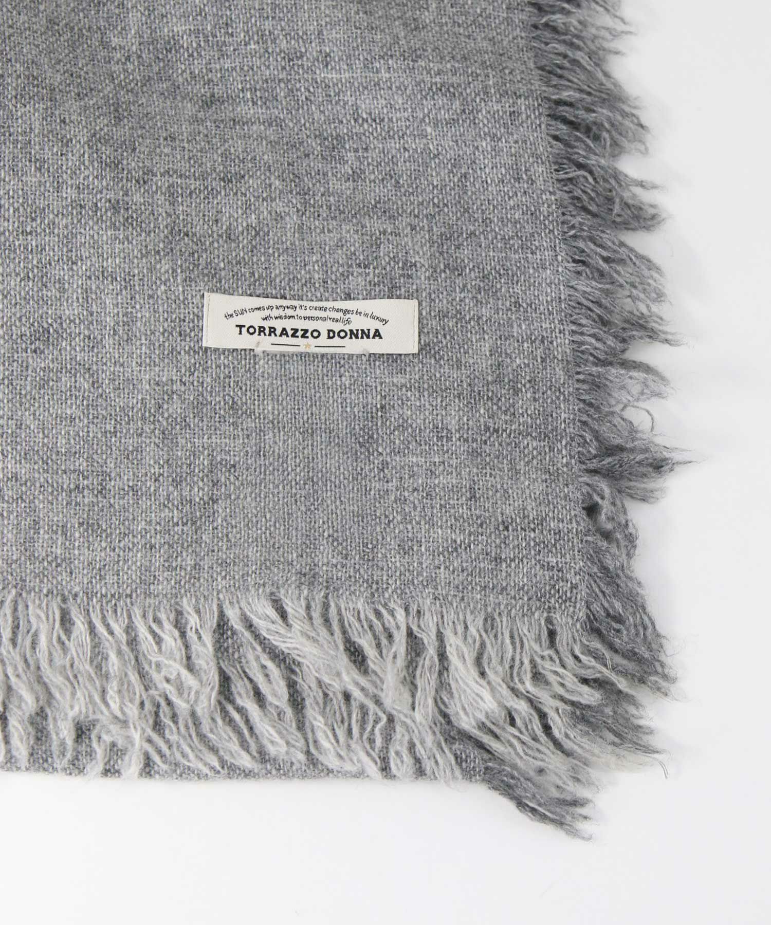 幅広のストールは肩掛け用としても首に巻いてもサマになる万能アイテム。