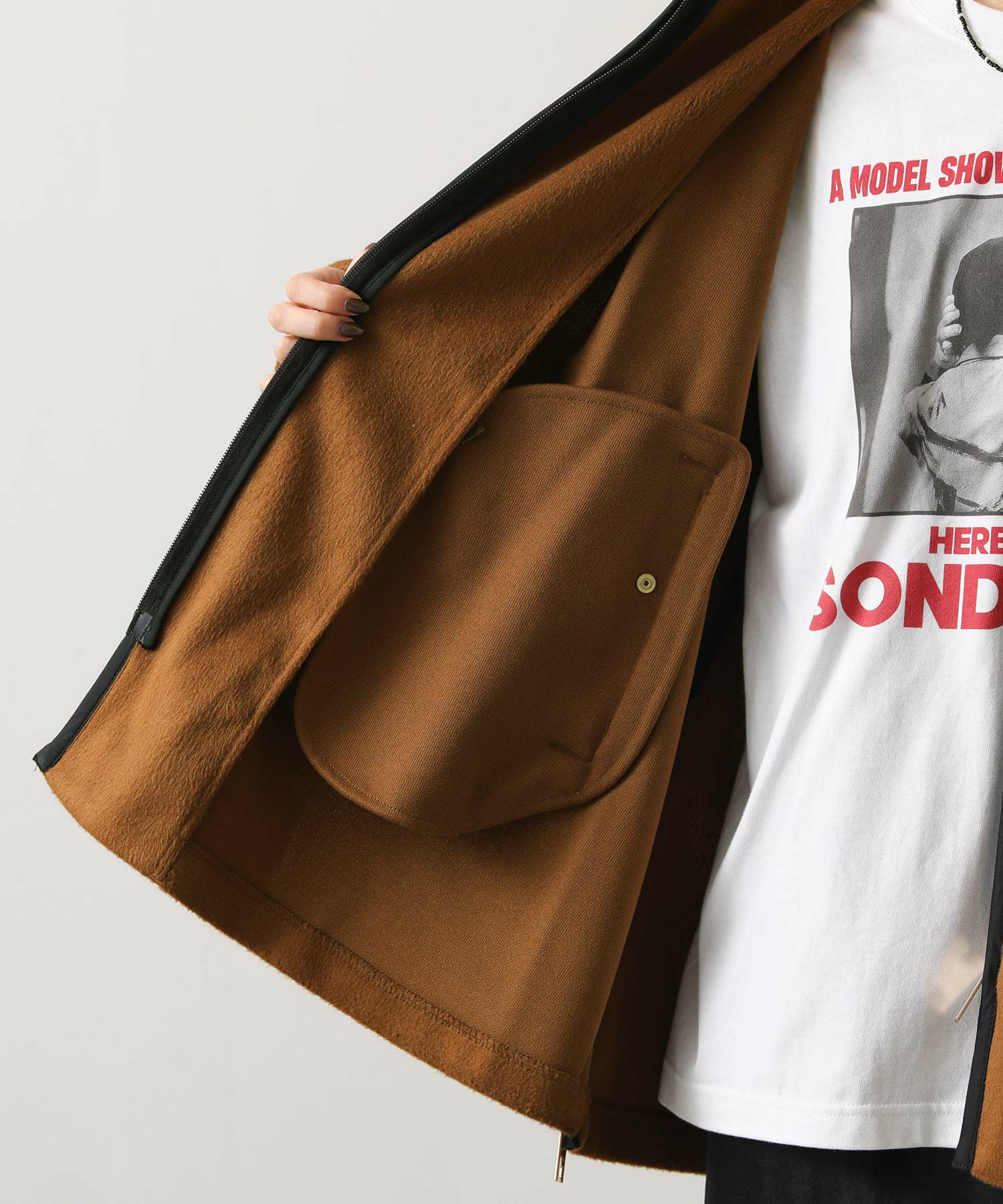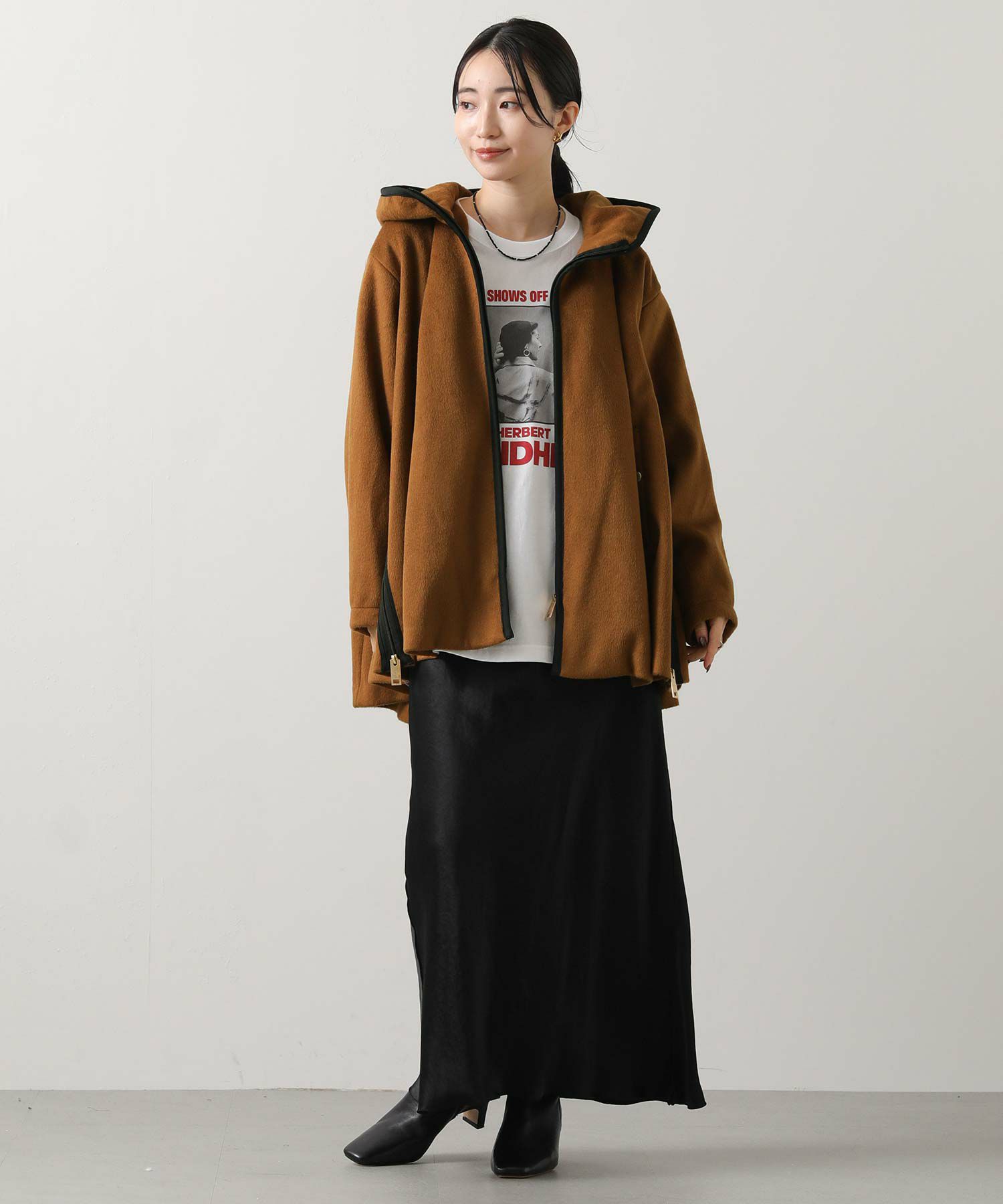 【1イチパーセント】から、表面が少し起毛したフリース素材のようなフードコートをセレクト。