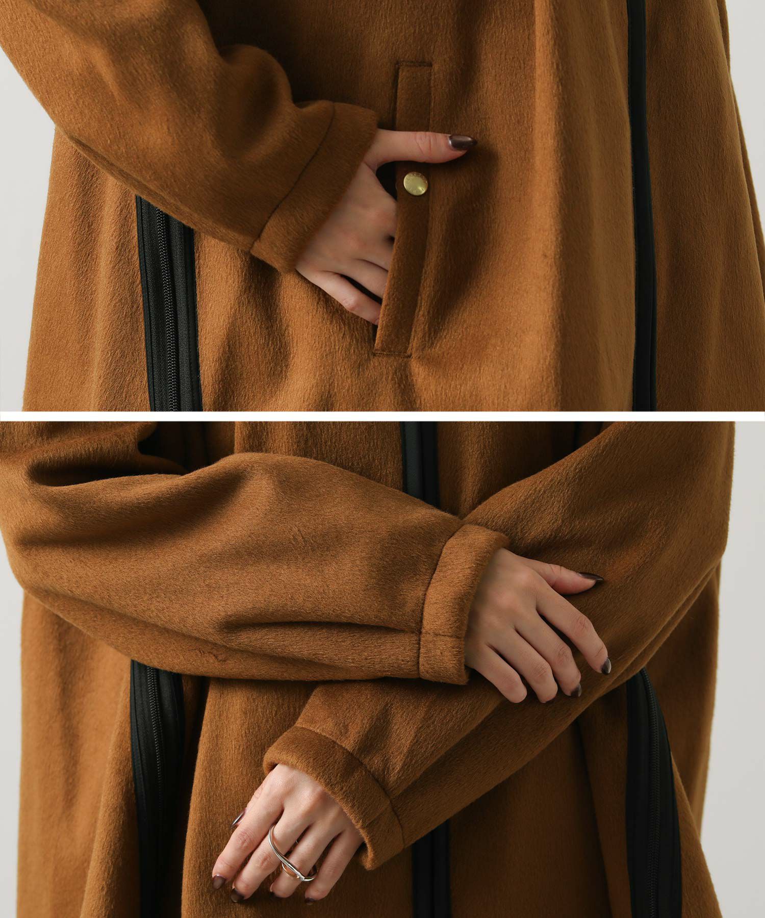 フードから前立てがバイカラーになっており、身頃に分量があってもスッキリ見えするアクセントになっています。